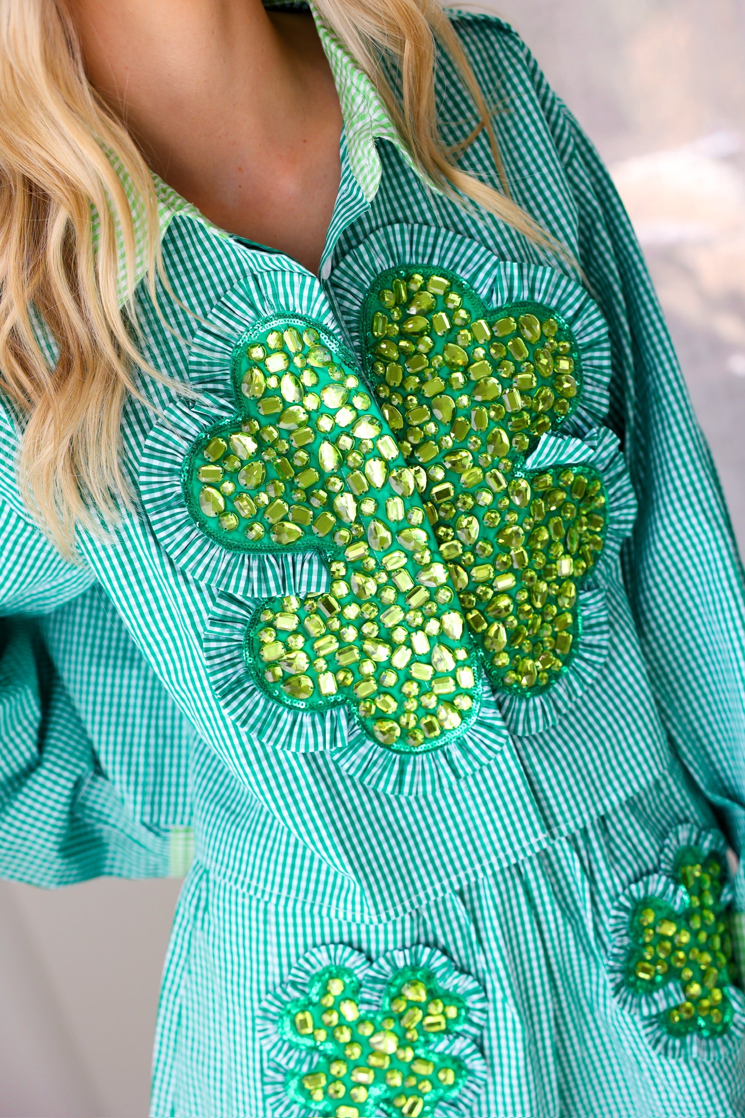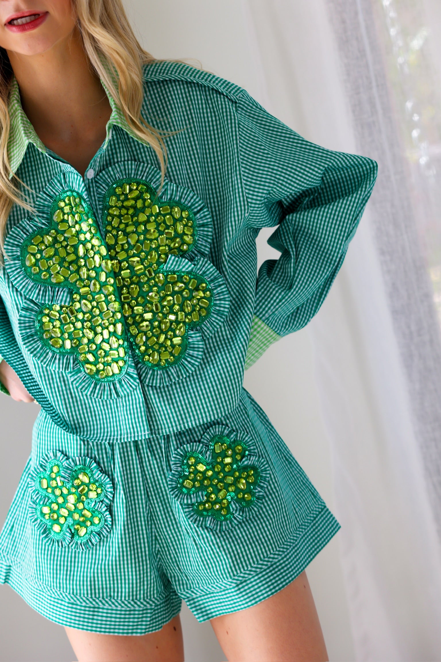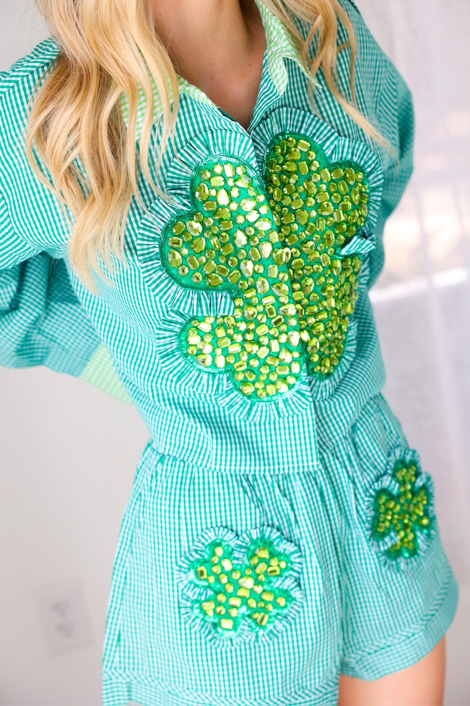 Queen of Sparkles Green Gingham Ruffle Jeweled Shamrock Cotton Button Up Top