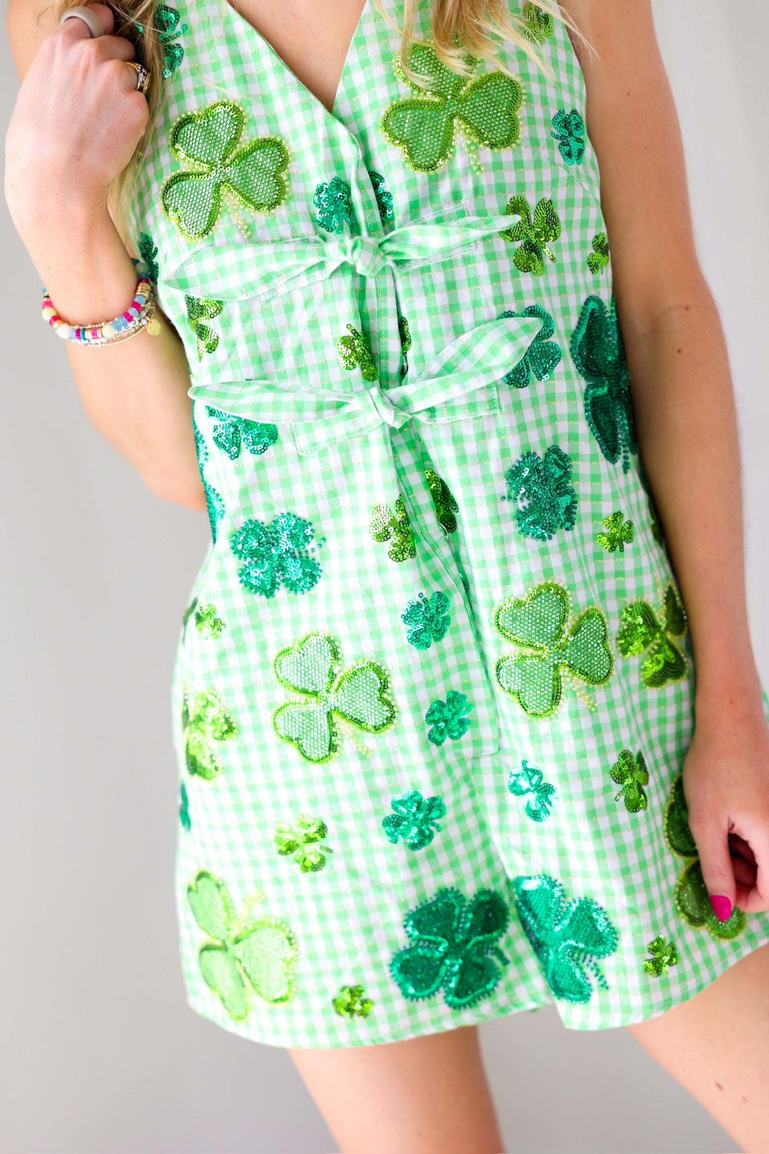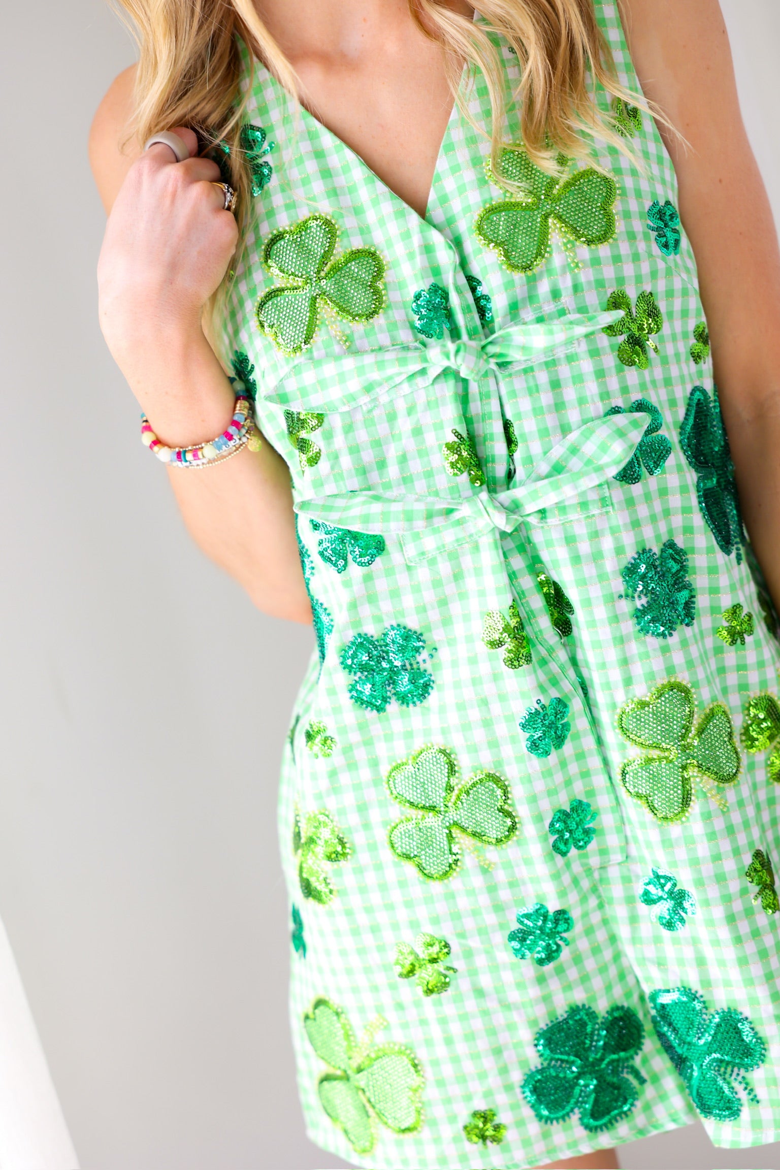 Queen of Sparkles Green & White Plaid Rhinestone Shamrock Tie Romper