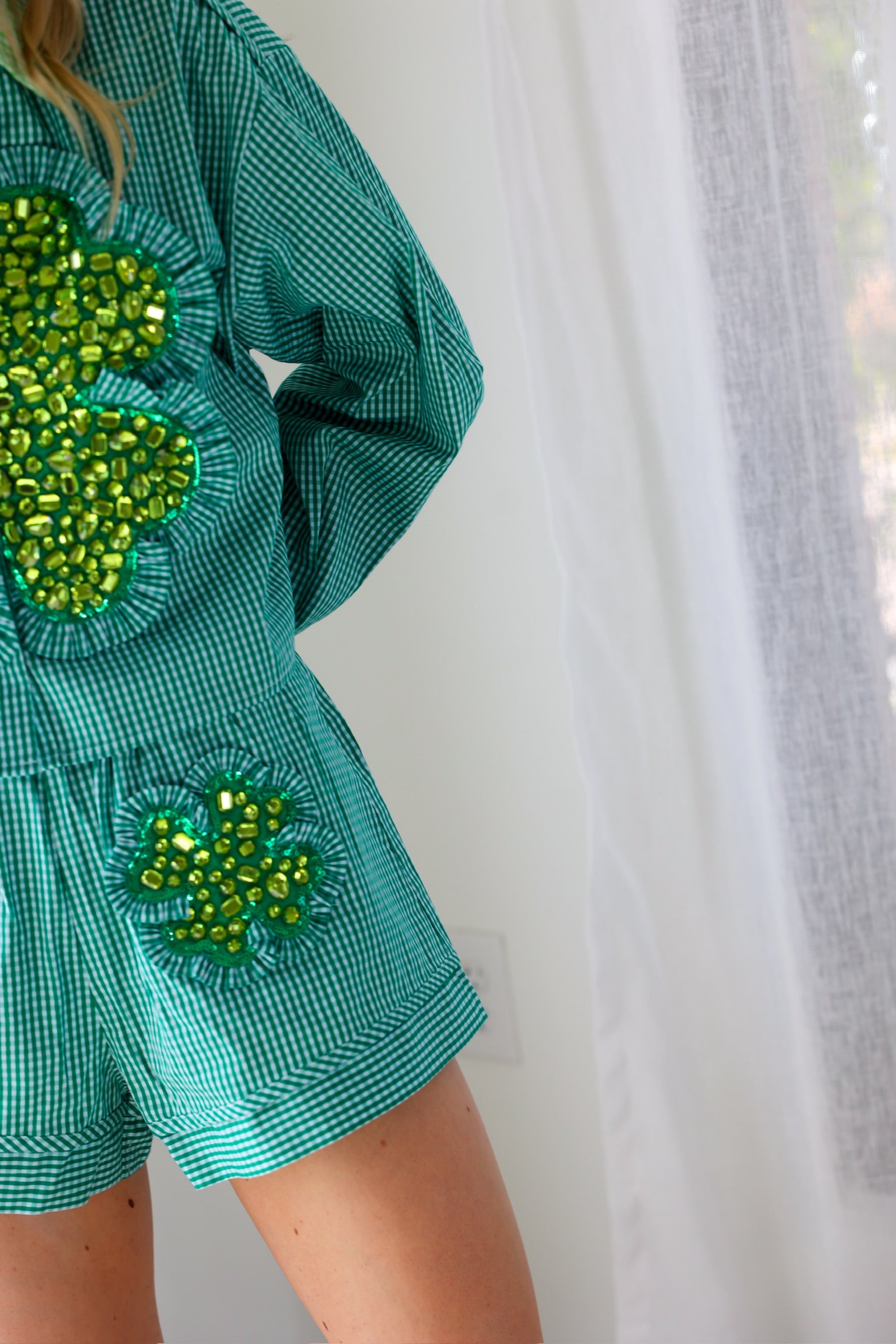 Queen of Sparkles Green Gingham Ruffle Jeweled Shamrock Short