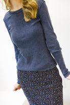 Crew neck, Long sleeve, Lightweight, Mineral wash, Fitted, Waffle Thermal: 60% Cotton 40% Polyester, Length from shoulder is 22 3/4in