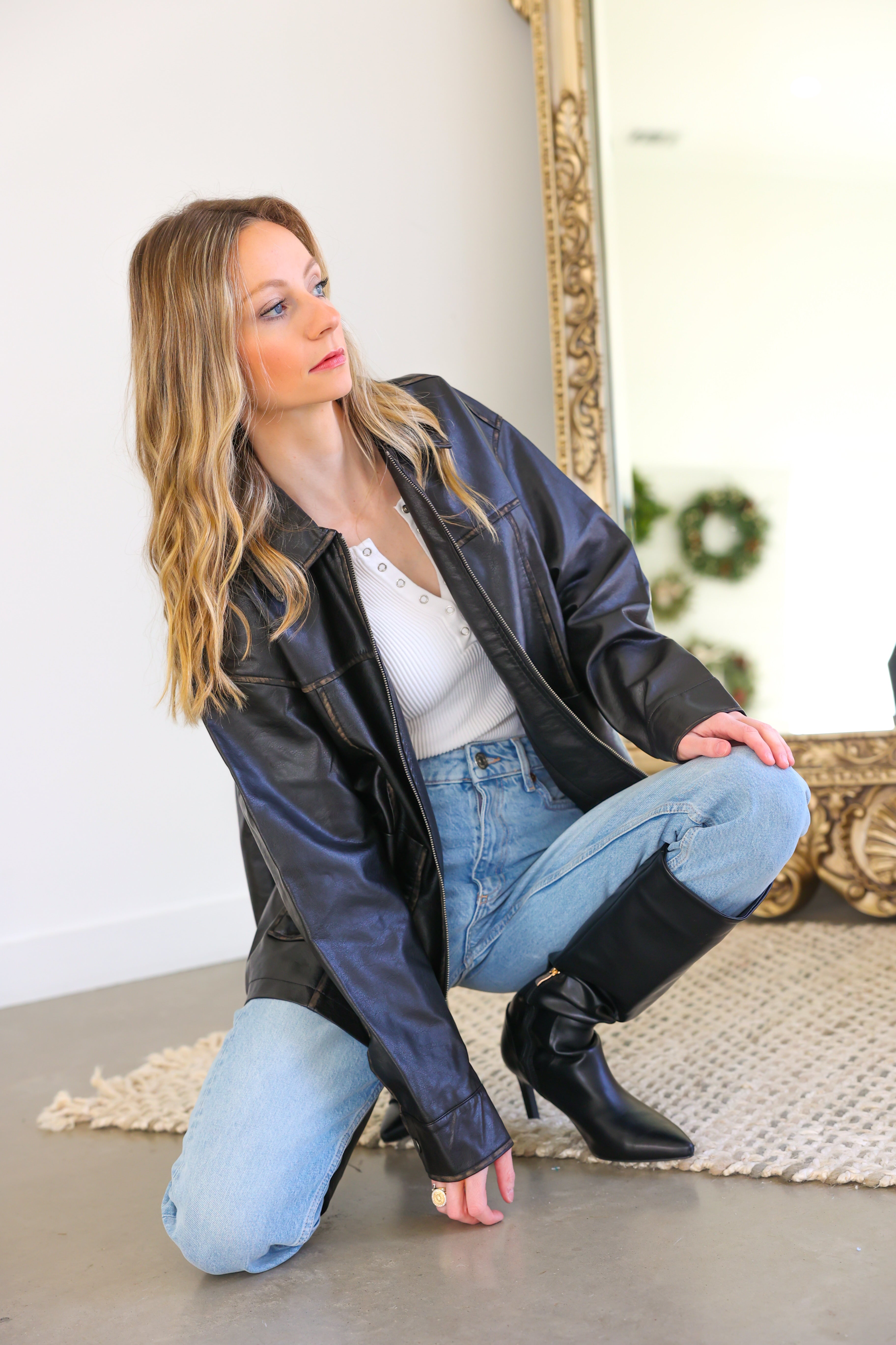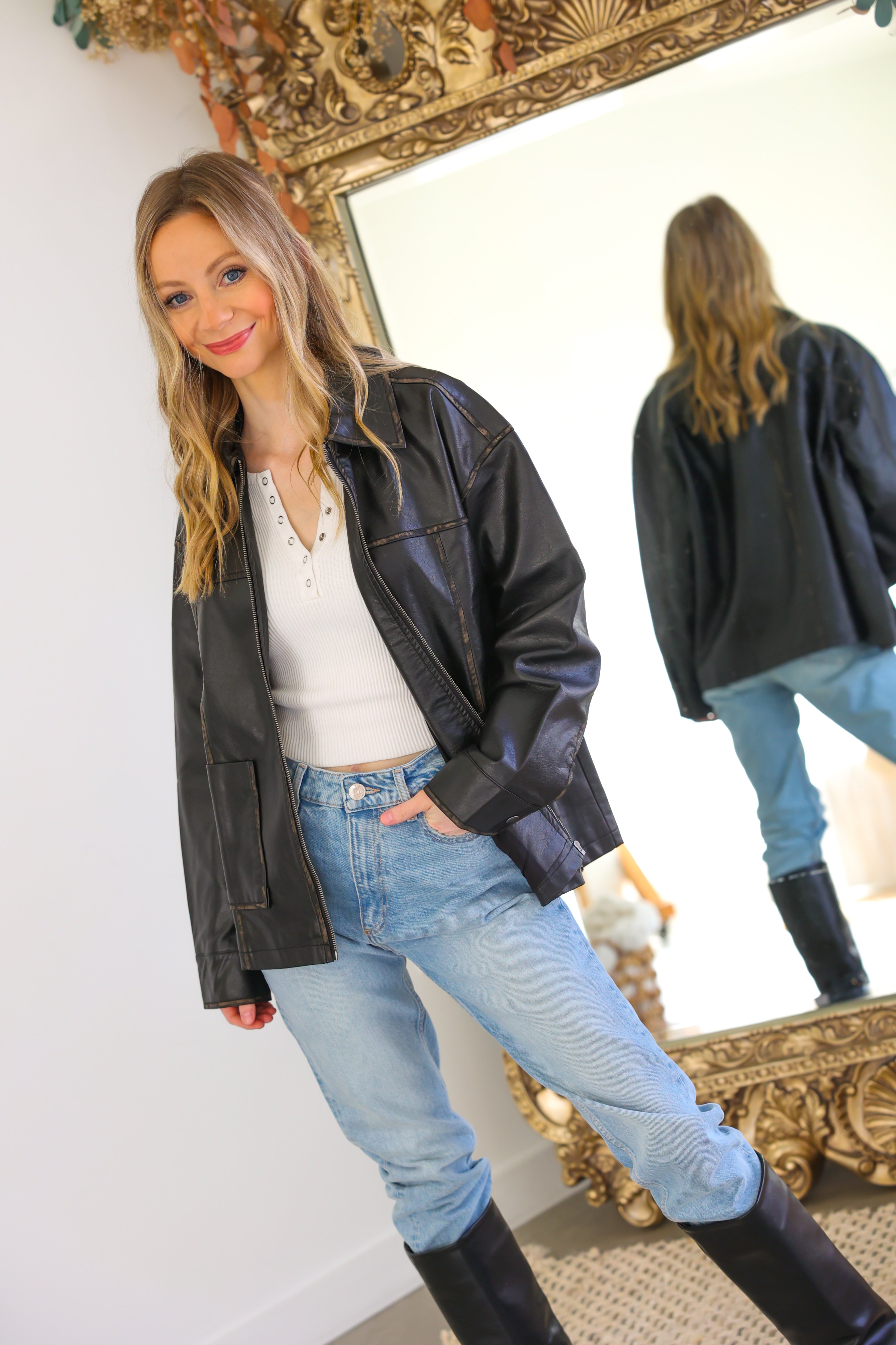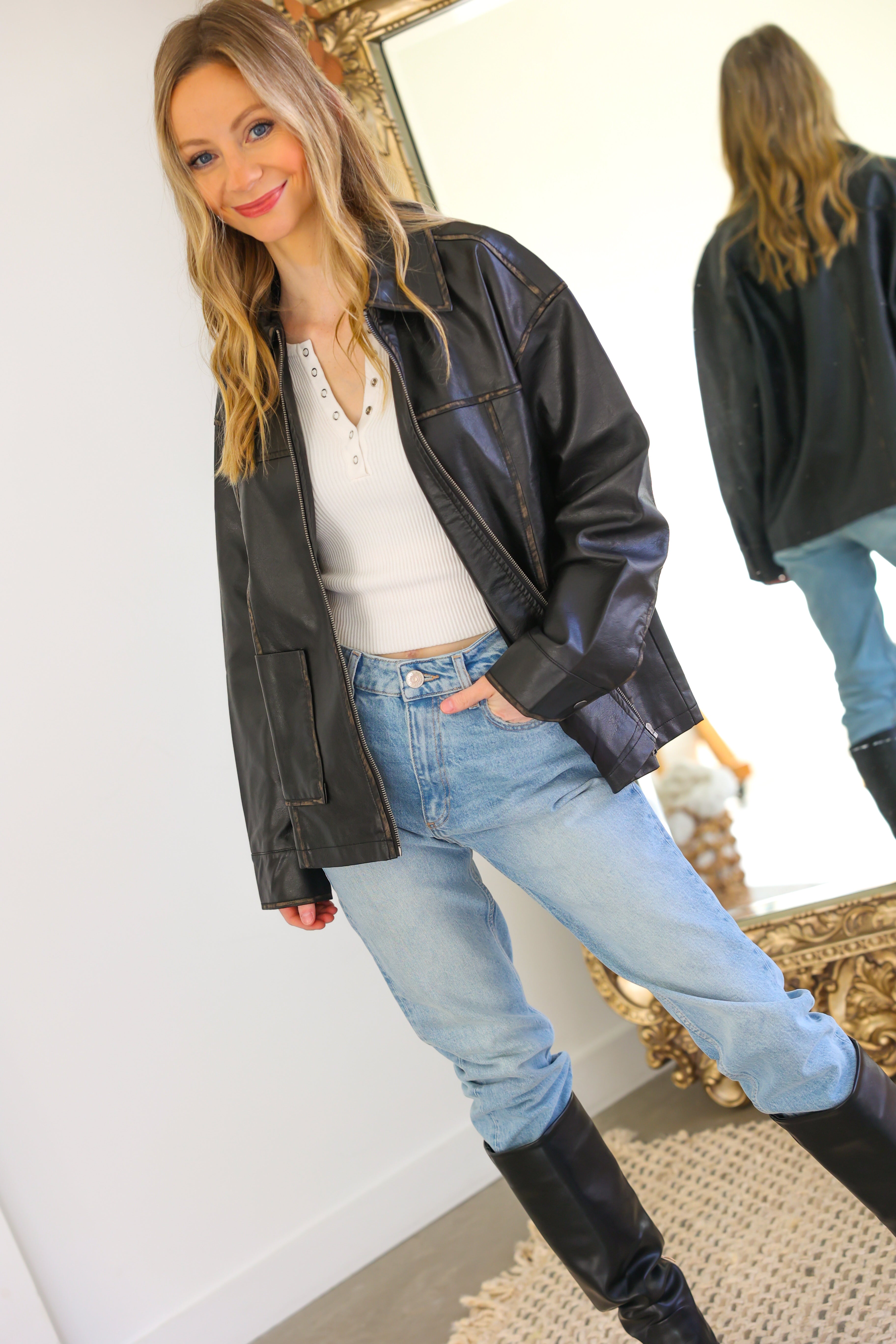 Black Oversized Faux Leather Front Pocket Collared Zip Up Jacket