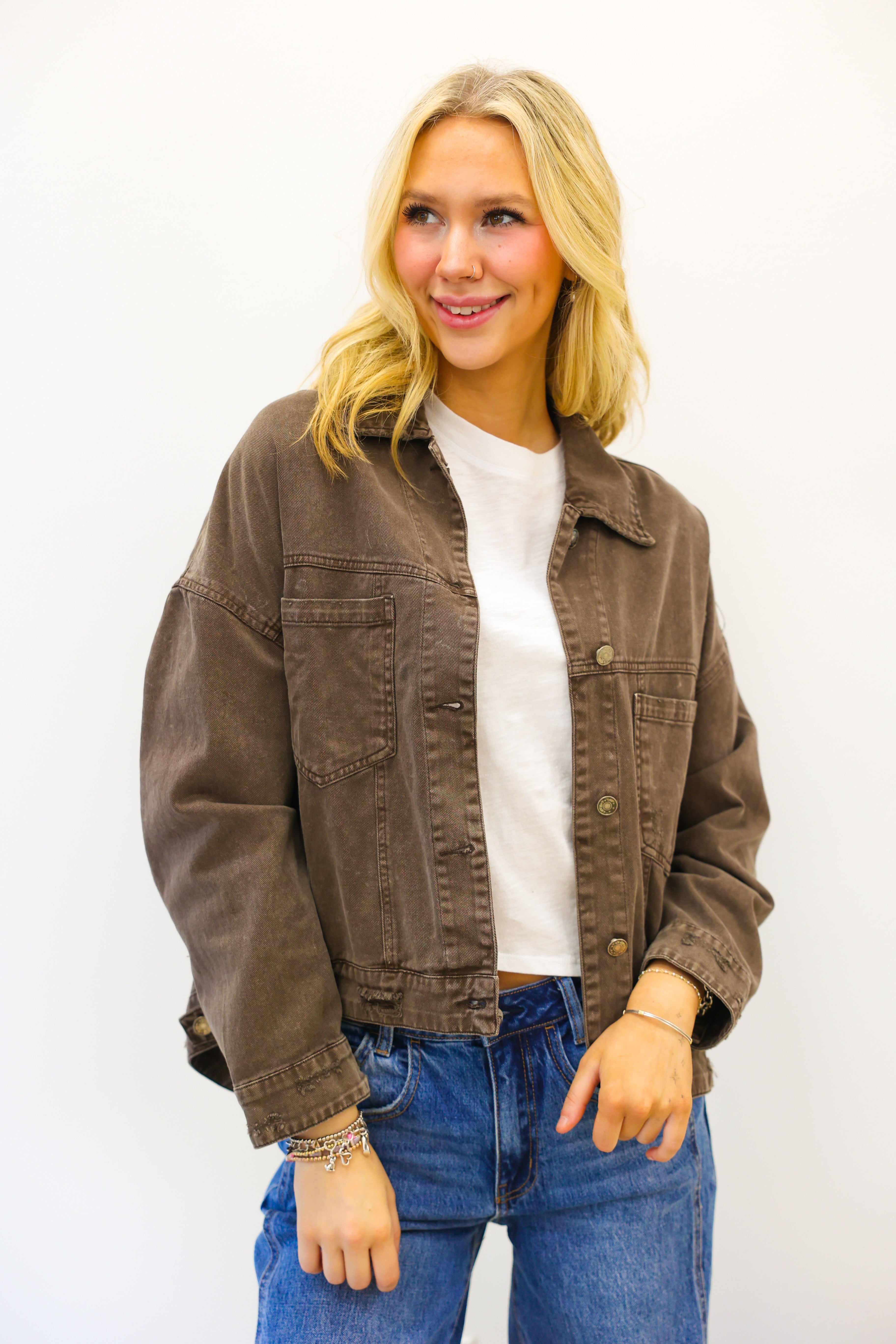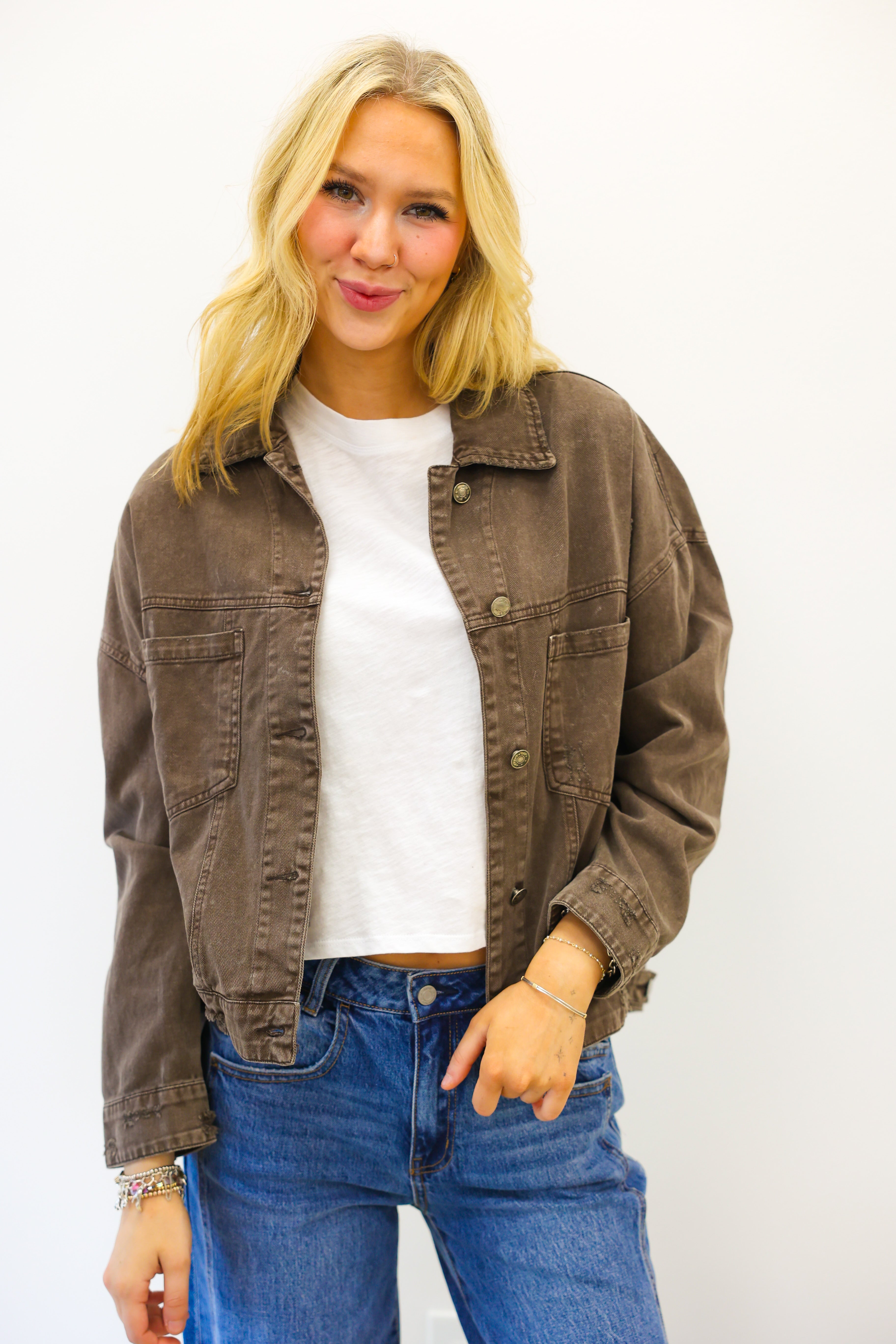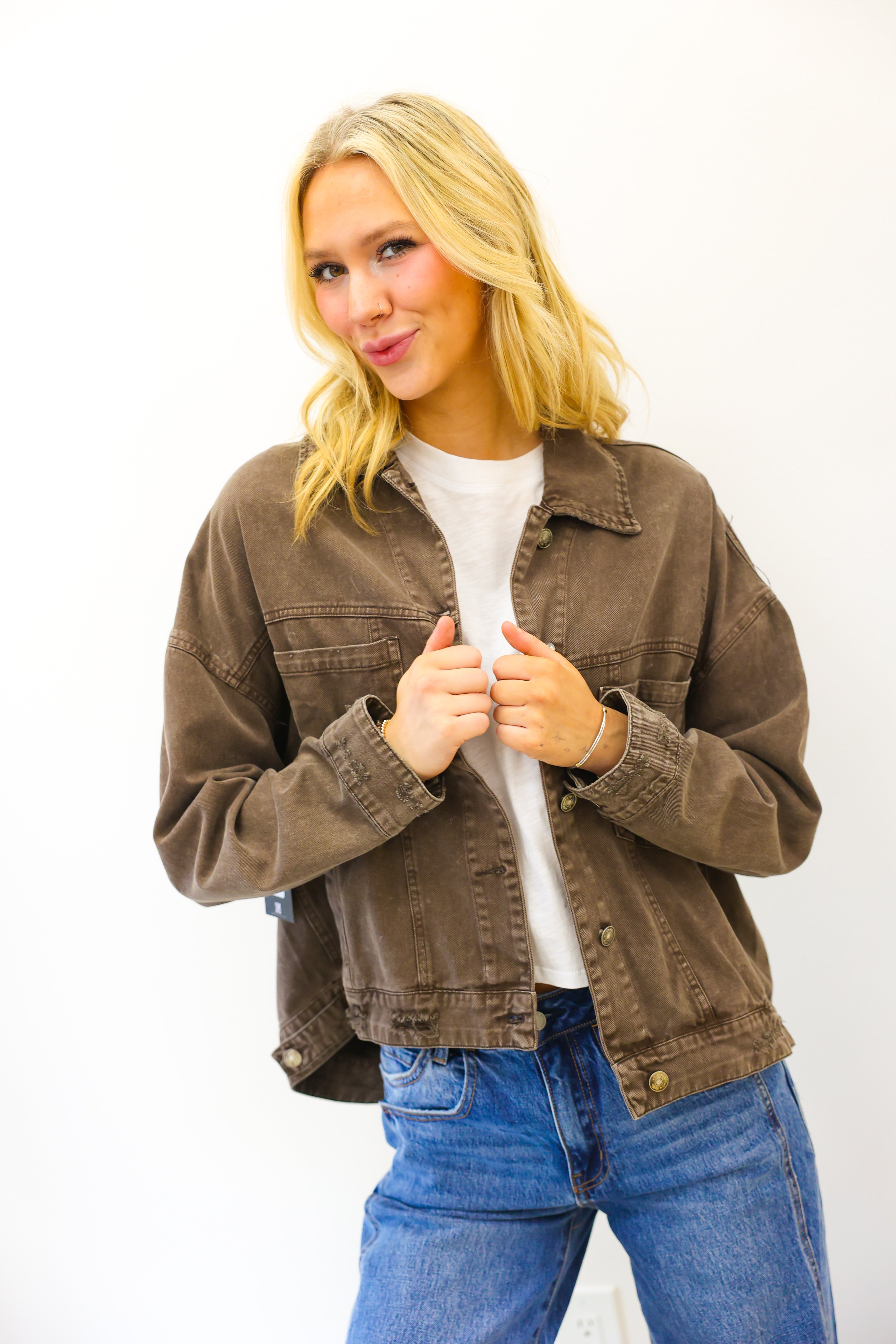 Brown Oversized Faux Leather Front Pocket Collared Zip Up Jacket