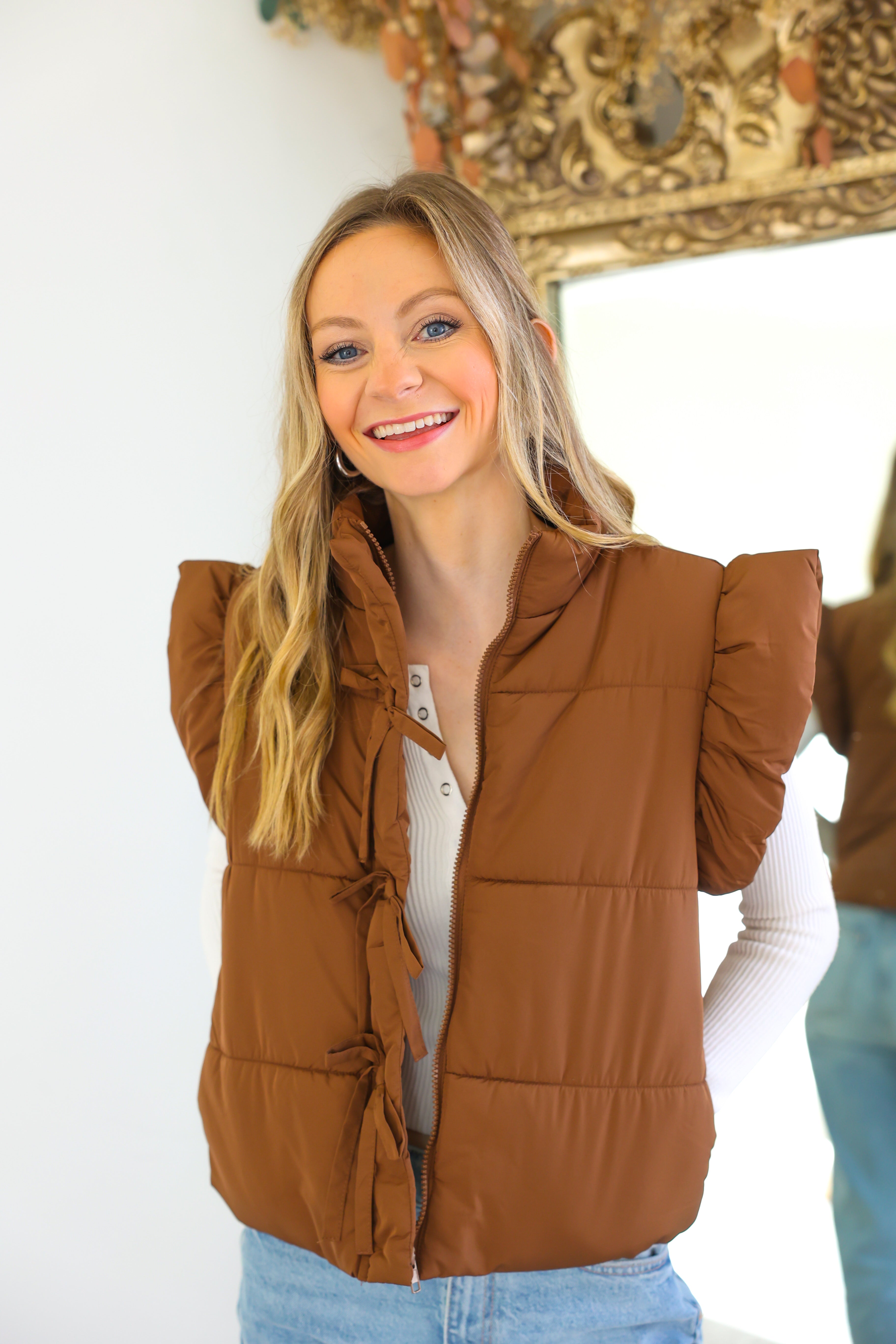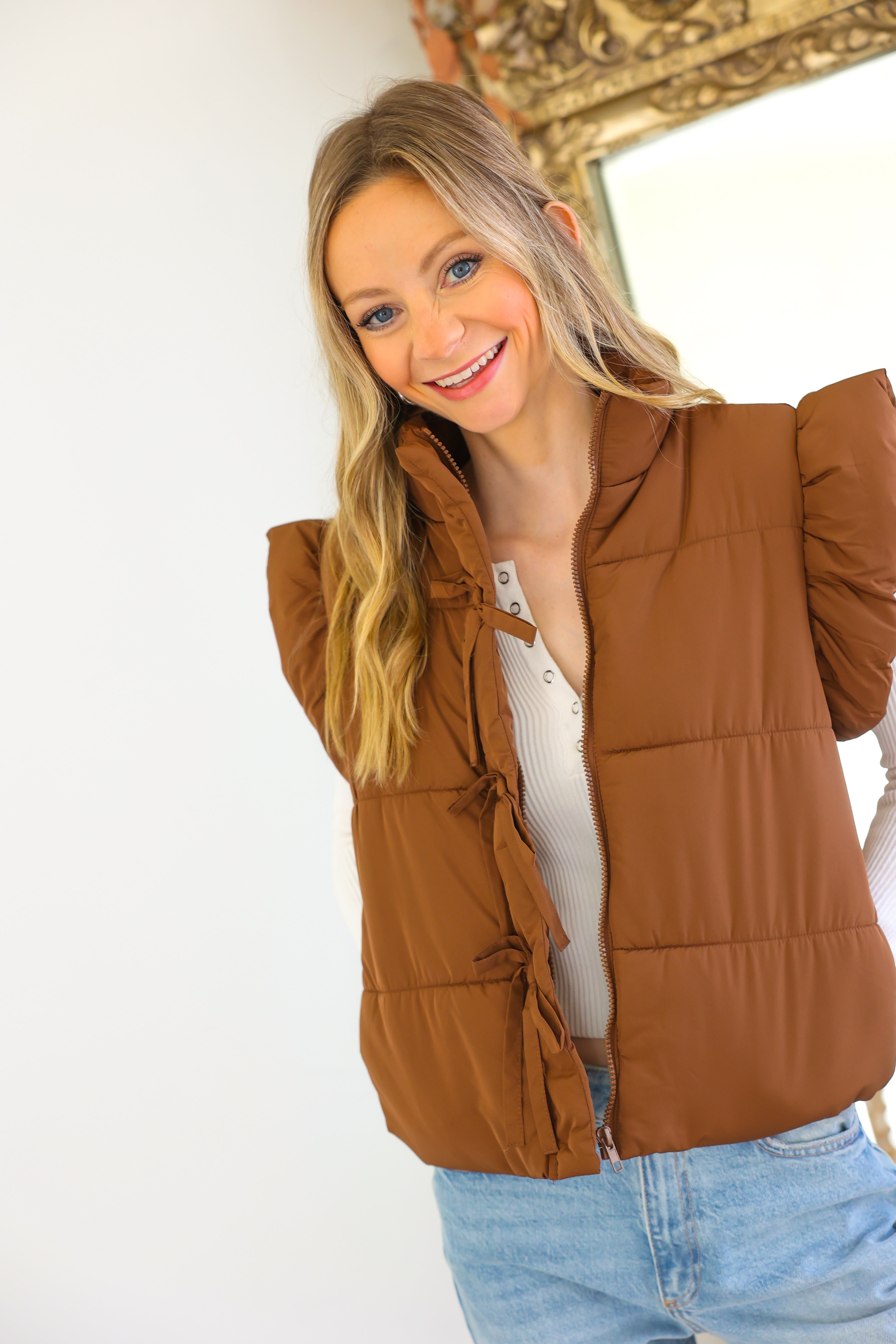 Flutter Sleeve Bow Detail Zip-Up Puffer - Brown