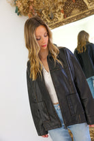 Black Oversized Faux Leather Front Pocket Collared Zip Up Jacket