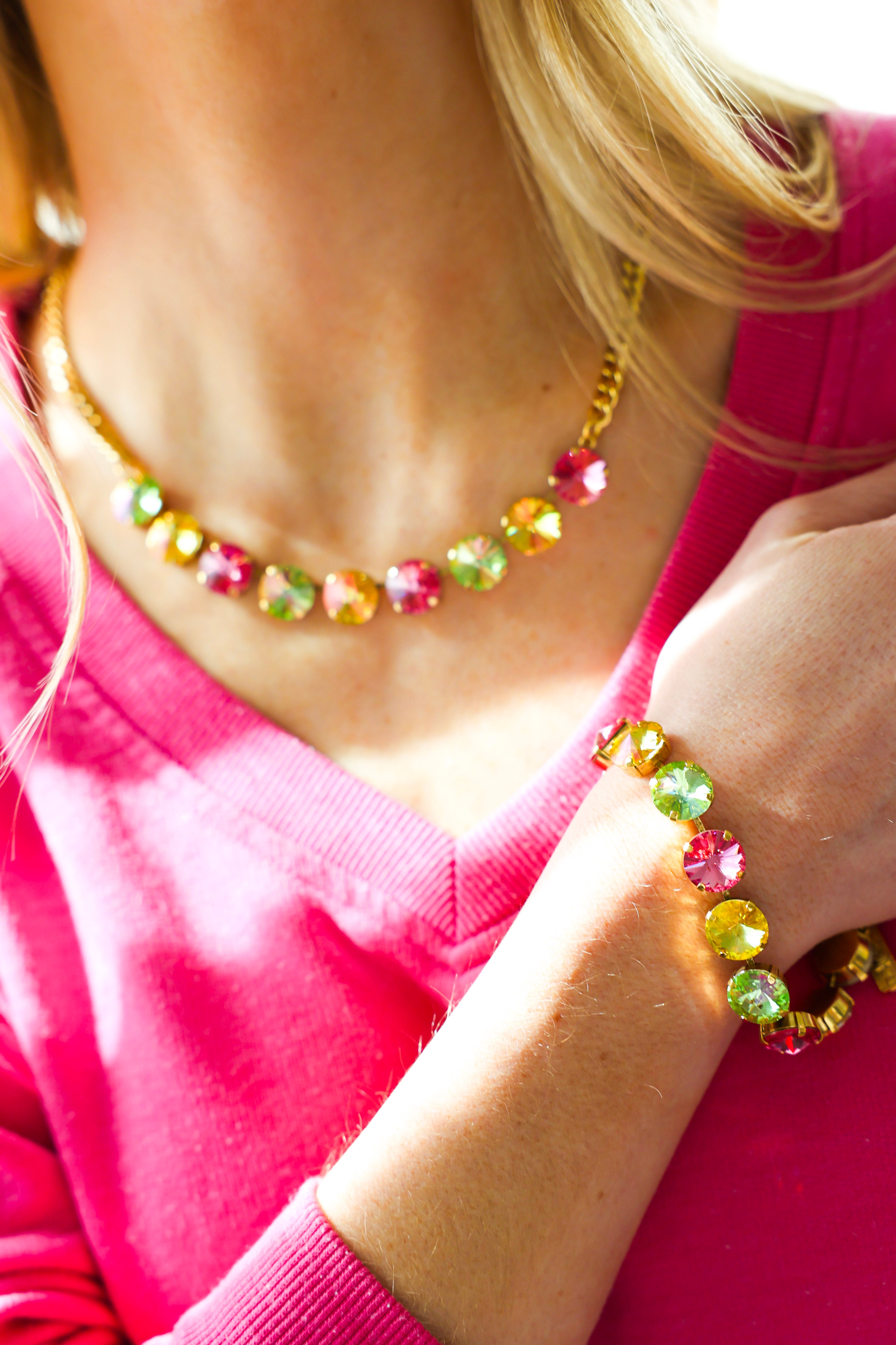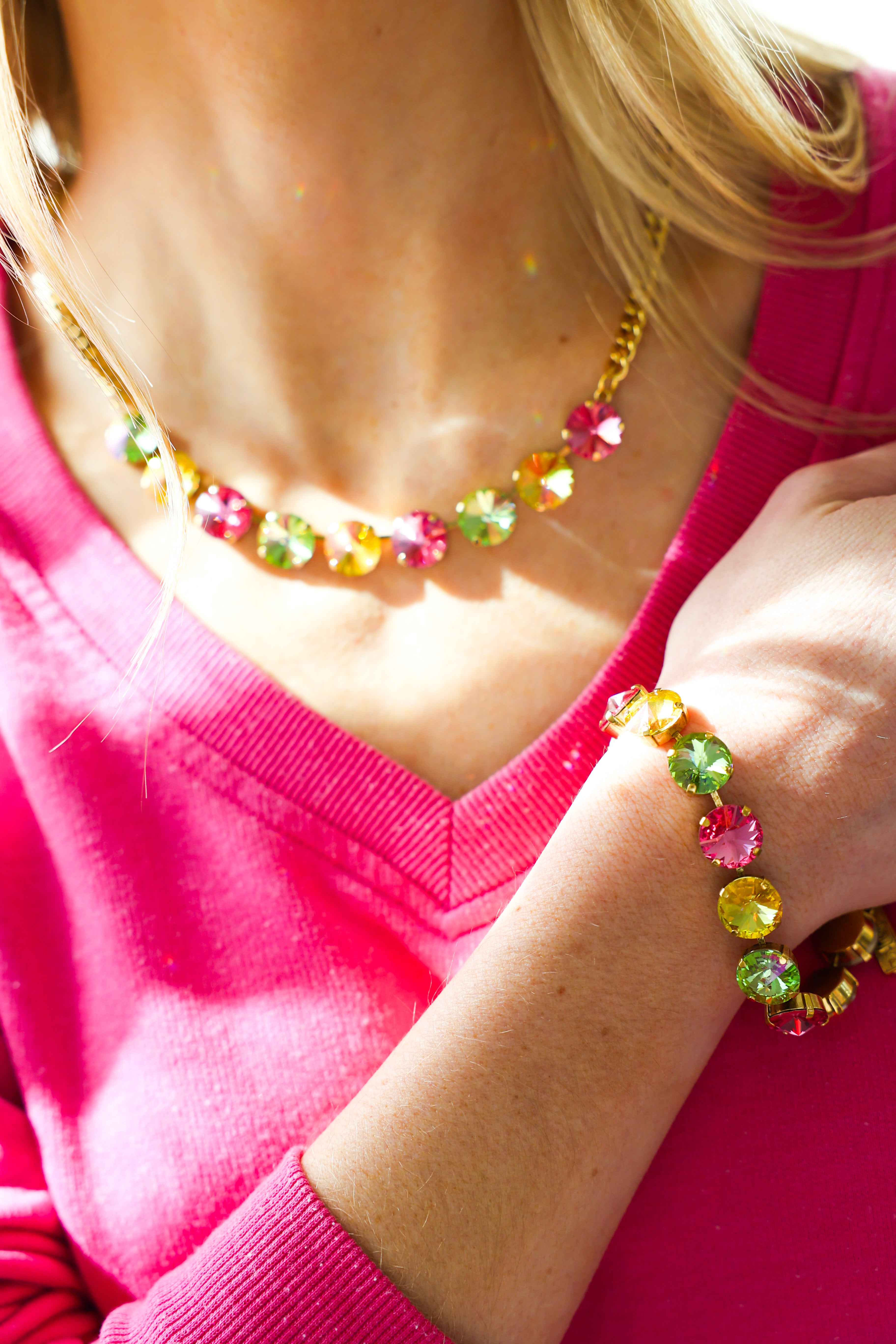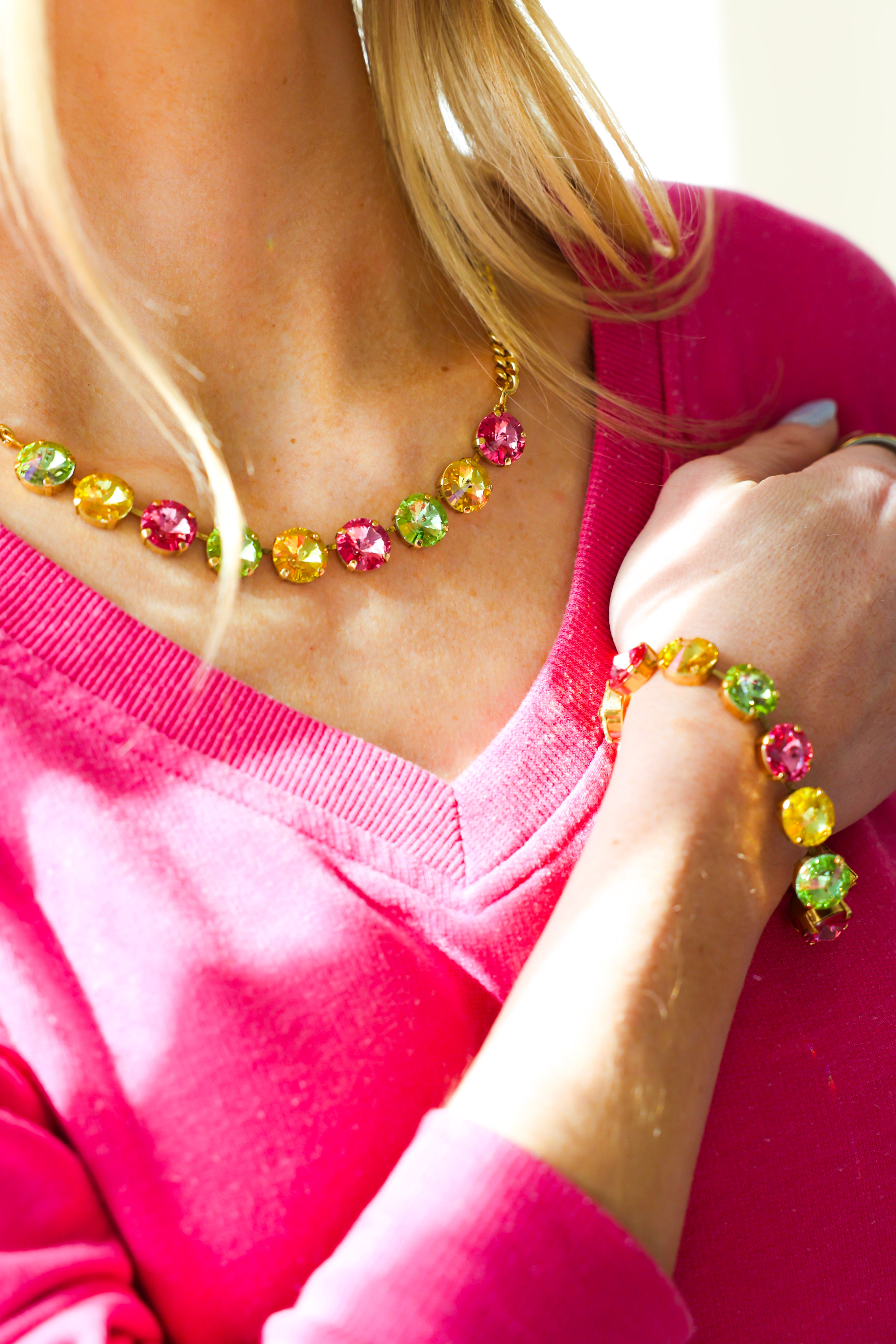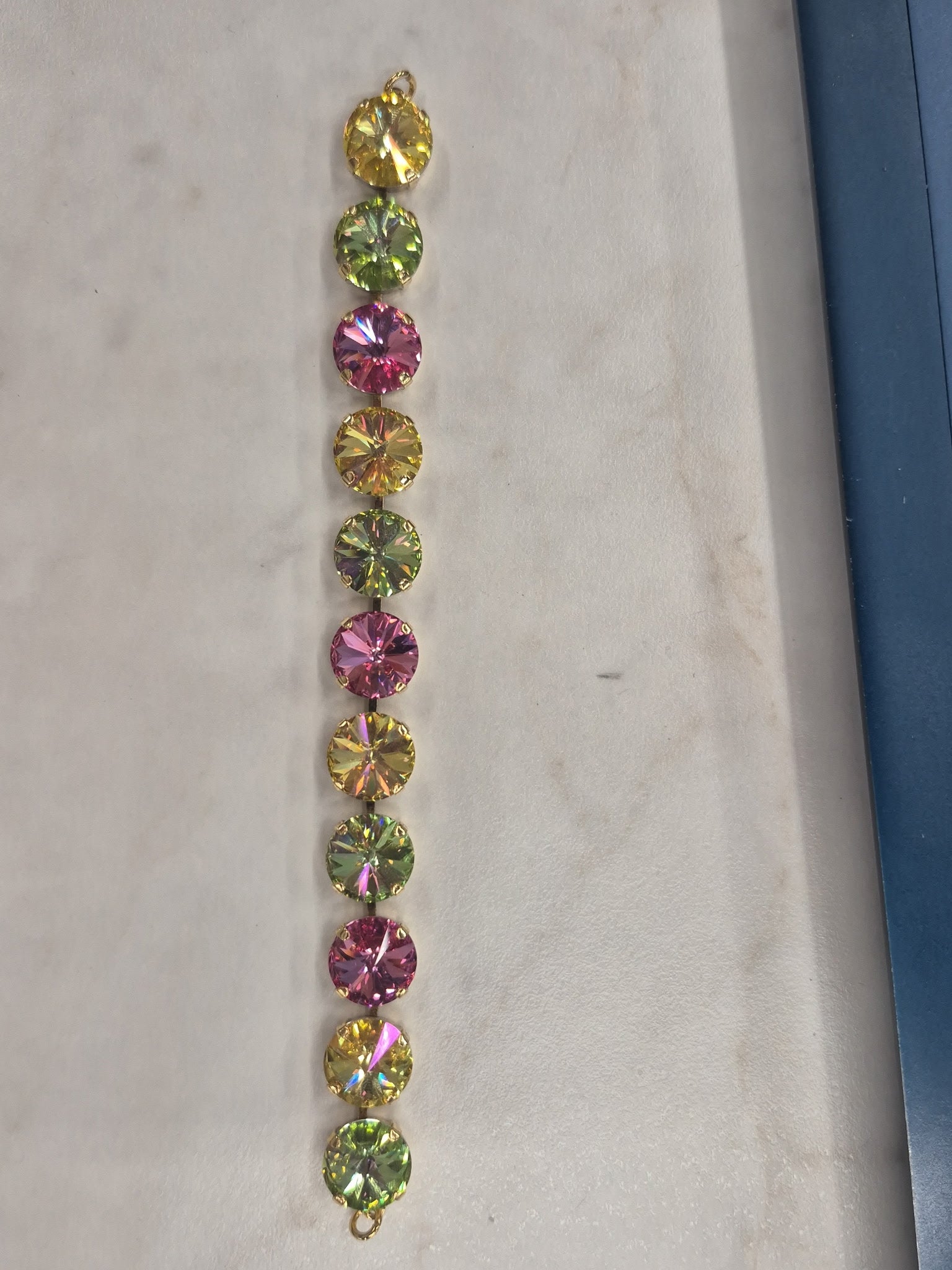 Bright, playful, and full of sparkle, the TOVA Croatia Bracelet – Lilypad is the perfect piece to add a vibrant pop of color to your jewelry collection. This stunning bracelet features dazzling lilypad-inspired crystals in shades of pink, green, and golden shimmer that catch the light beautifully with every movement!