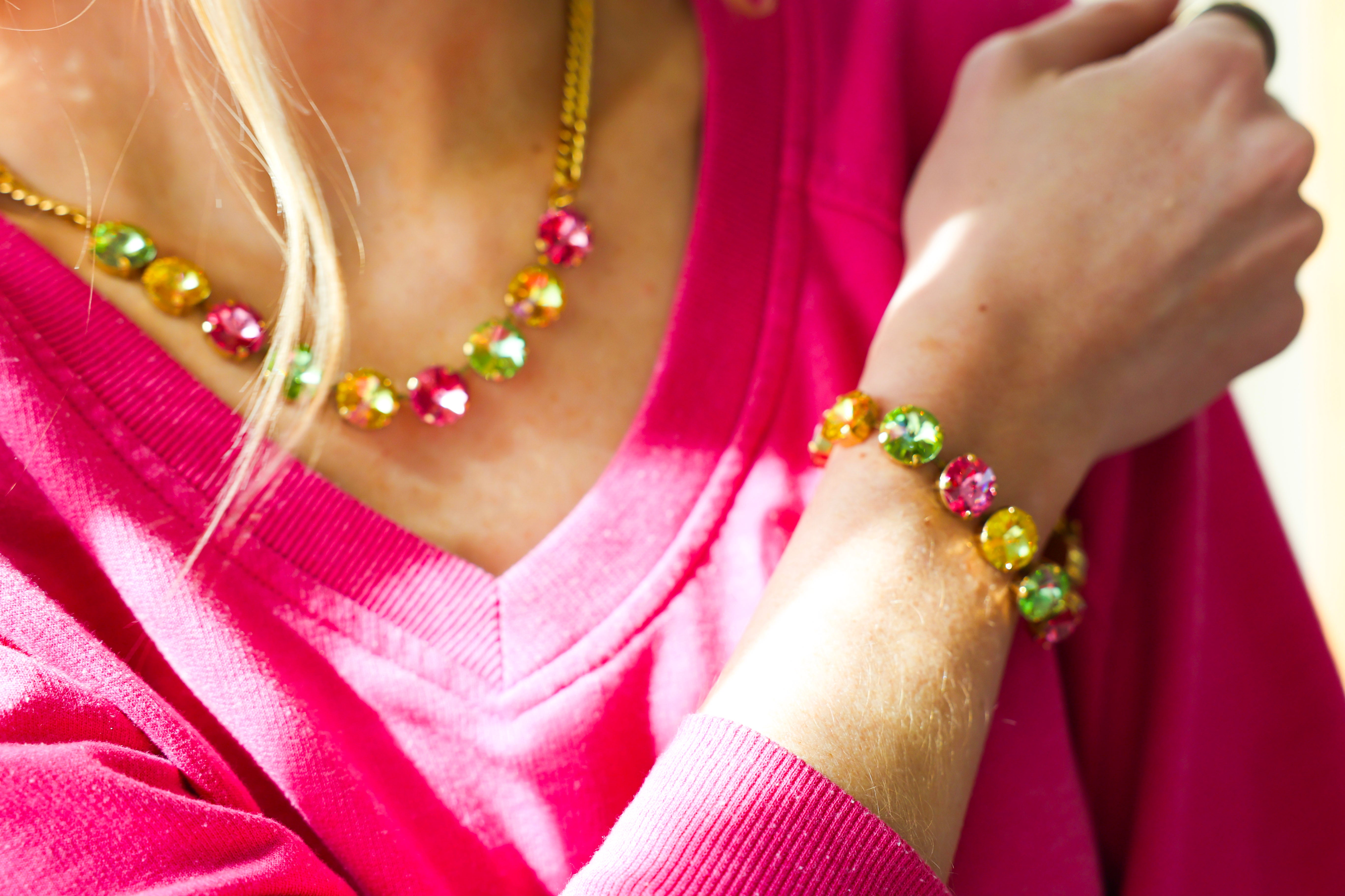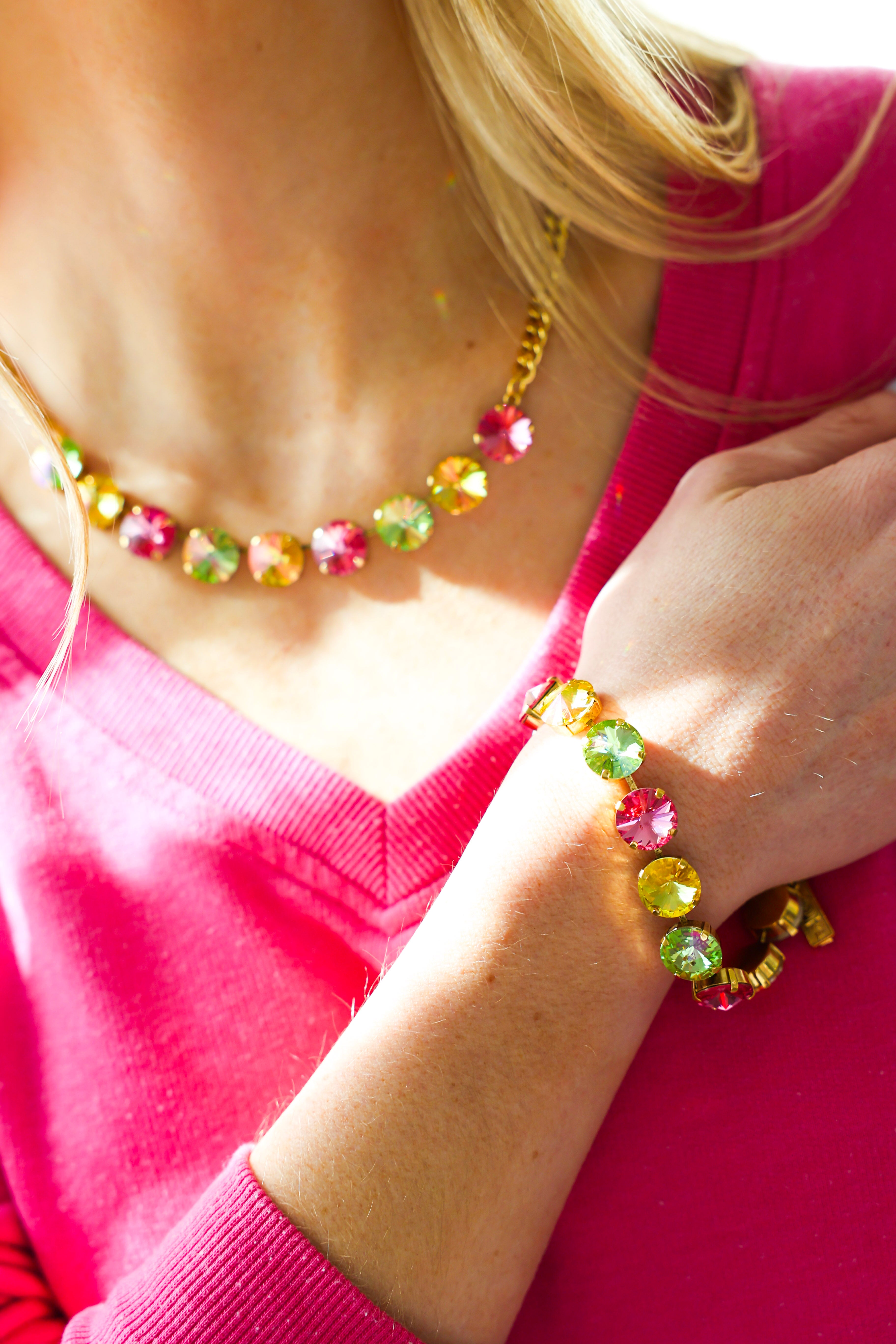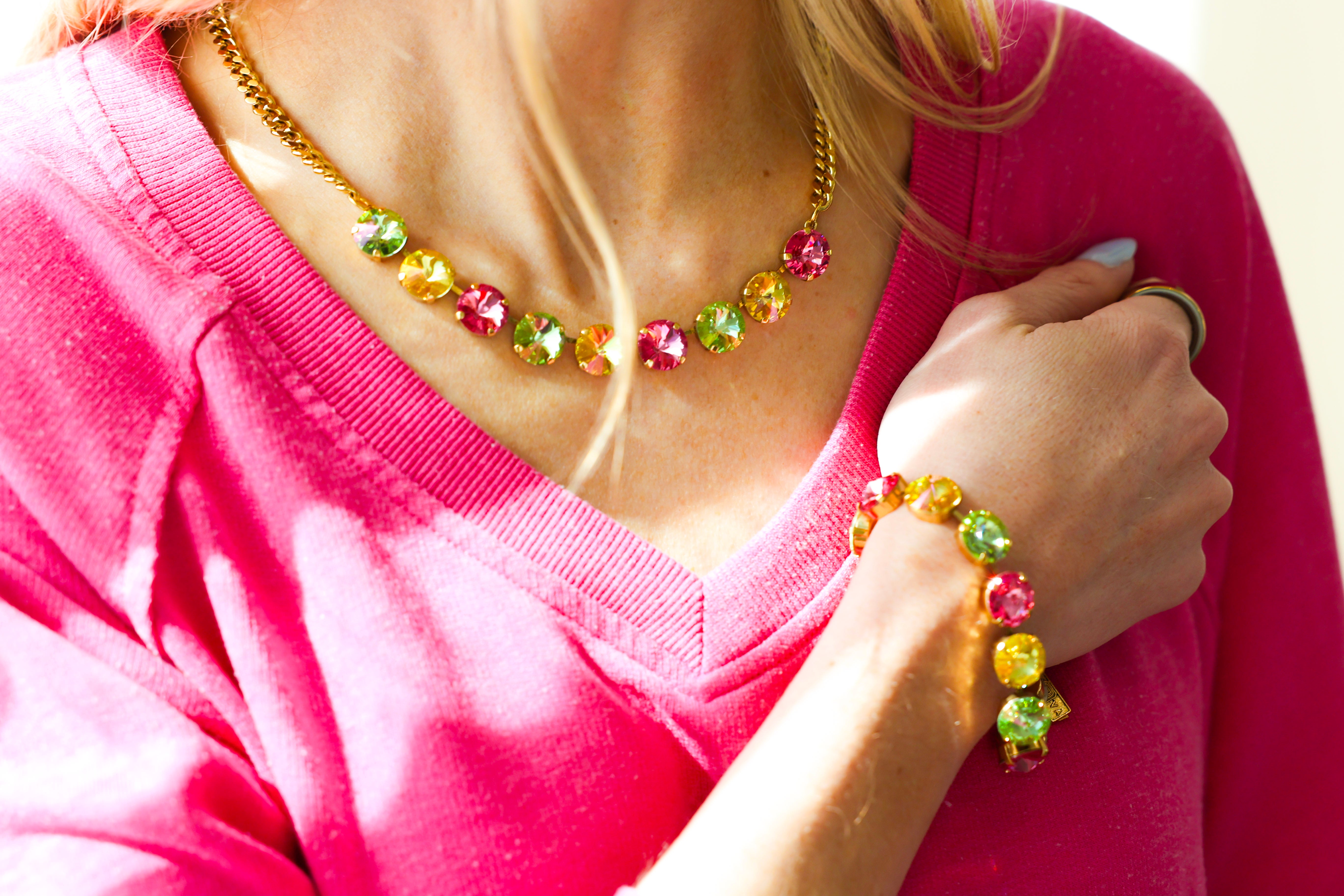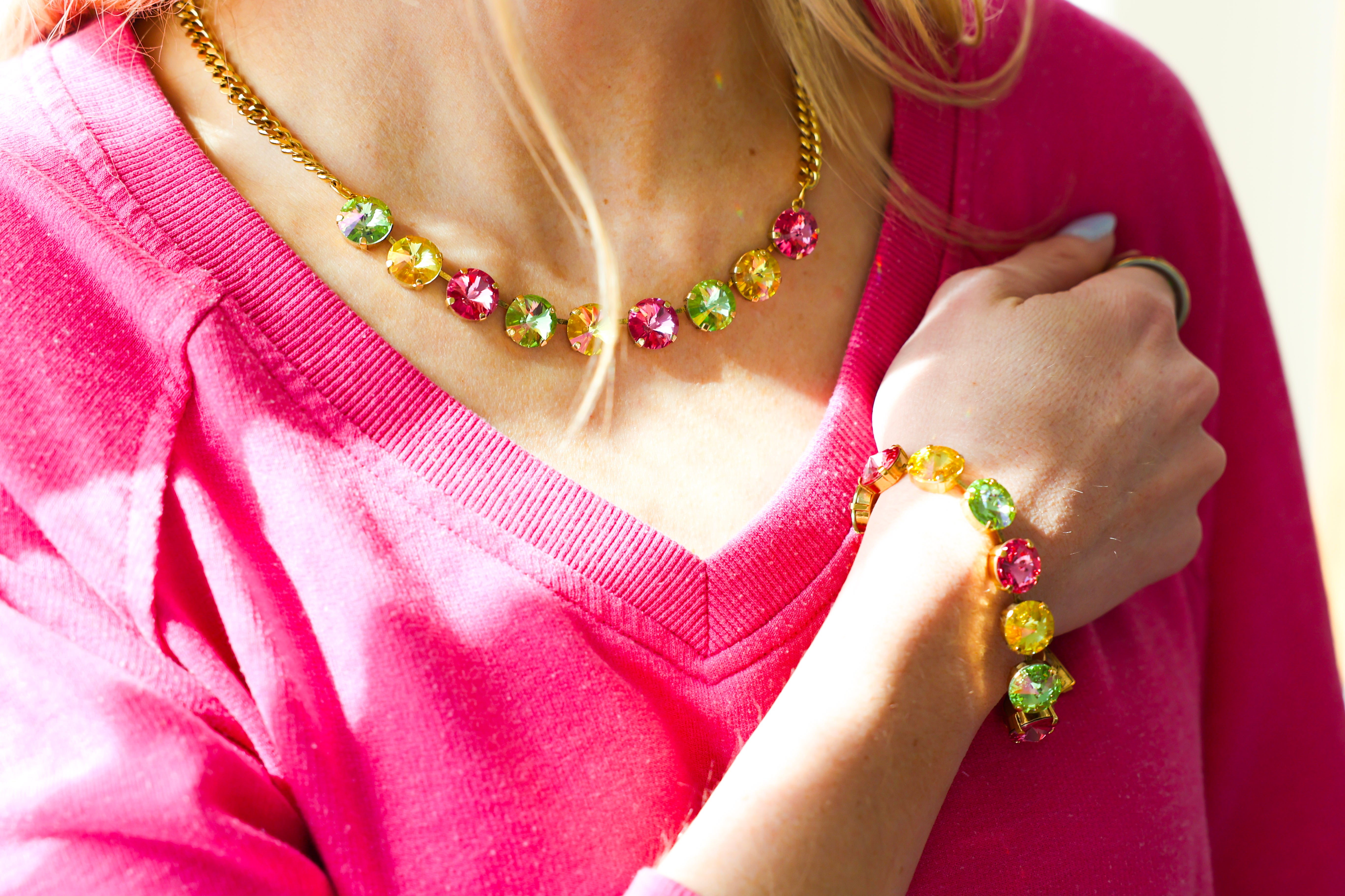 Bright, playful, and full of sparkle, the TOVA Croatia Bracelet – Lilypad is the perfect piece to add a vibrant pop of color to your jewelry collection. This stunning bracelet features dazzling lilypad-inspired crystals in shades of pink, green, and golden shimmer that catch the light beautifully with every movement!