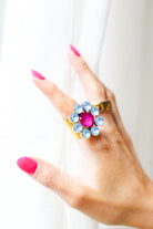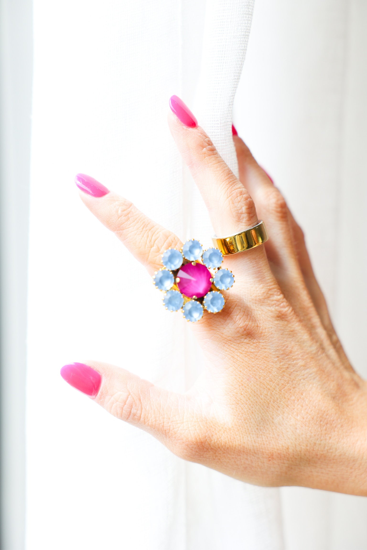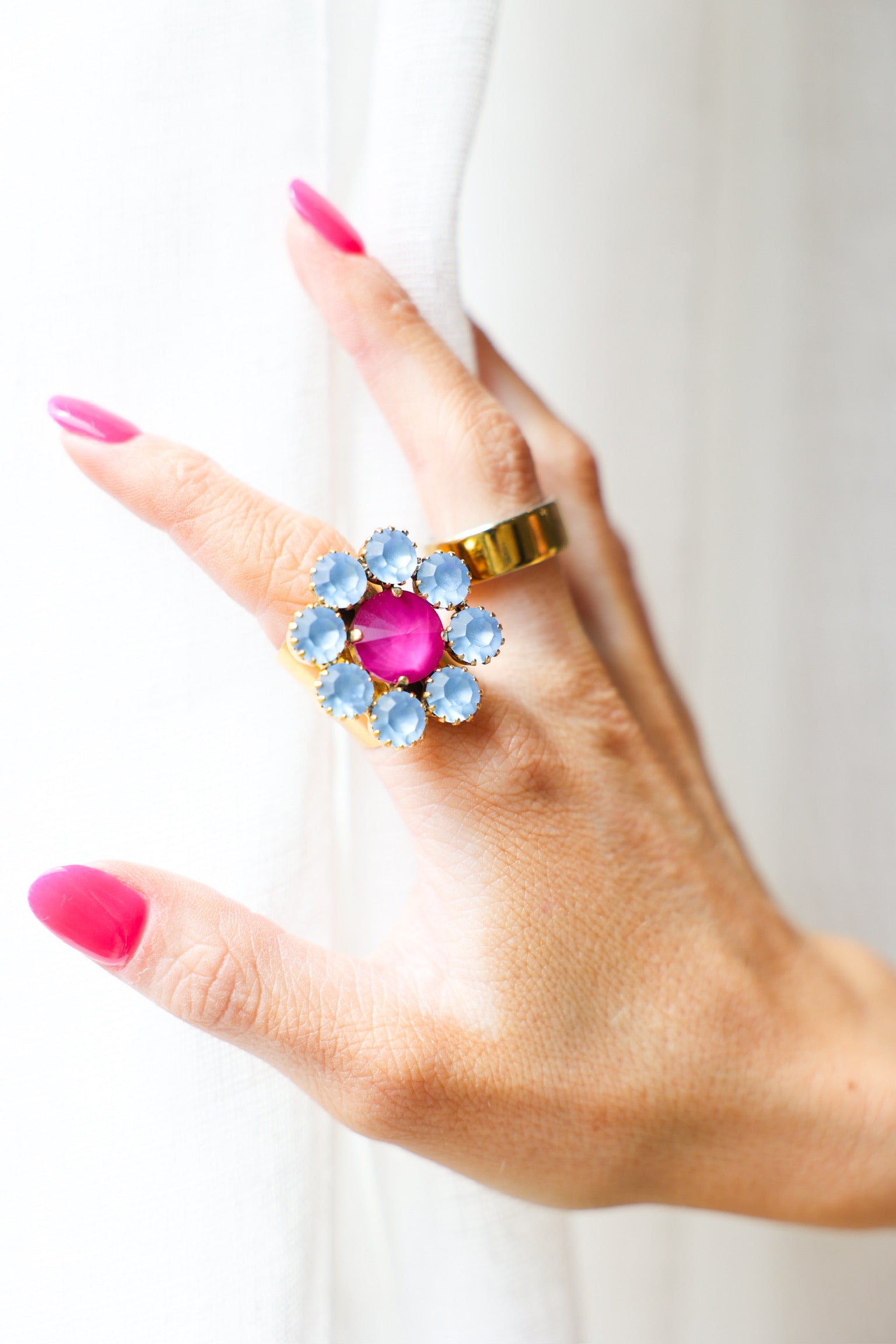 This ring is a true statement piece with a playful, feminine twist. Featuring a bold fuchsia center stone surrounded by soft matte blue stones, it creates a stunning contrast that instantly catches the eye. The gold setting adds warmth and polish, making it feel both vibrant and elevated.