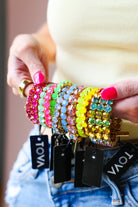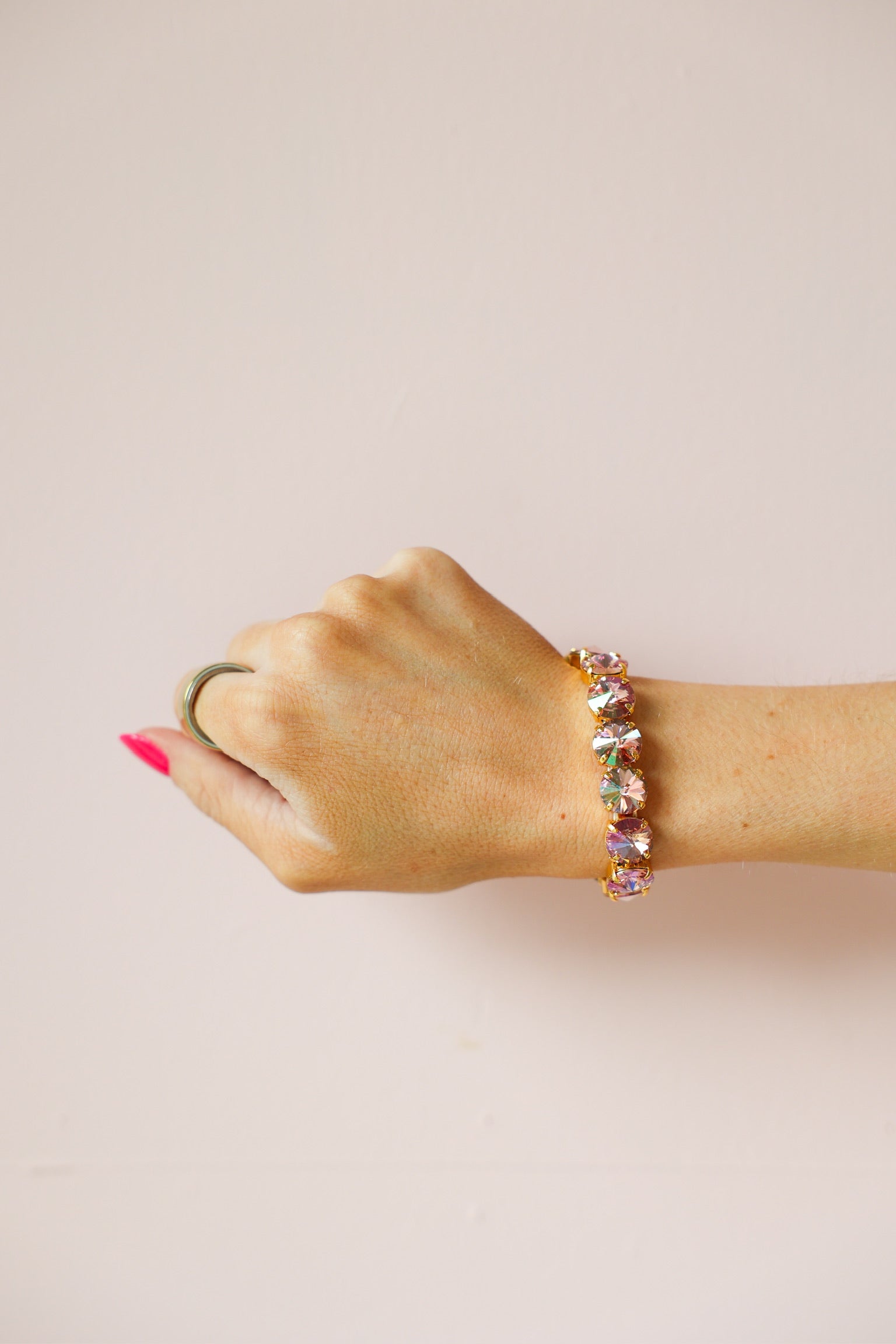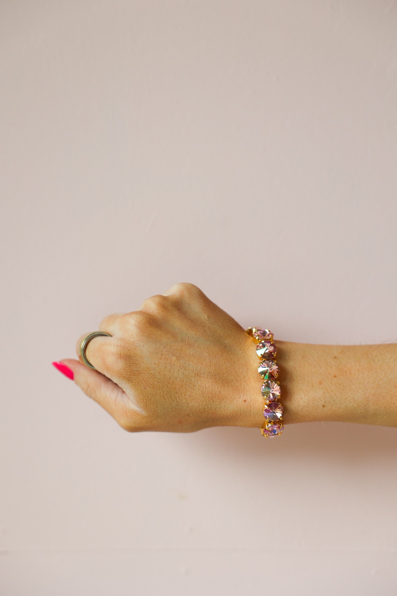 This bracelet is all about soft sparkle and feminine shine. Featuring light rose glimmer stones with an iridescent finish, it reflects subtle hints of pink, gold, and crystal tones for a beautifully radiant look.