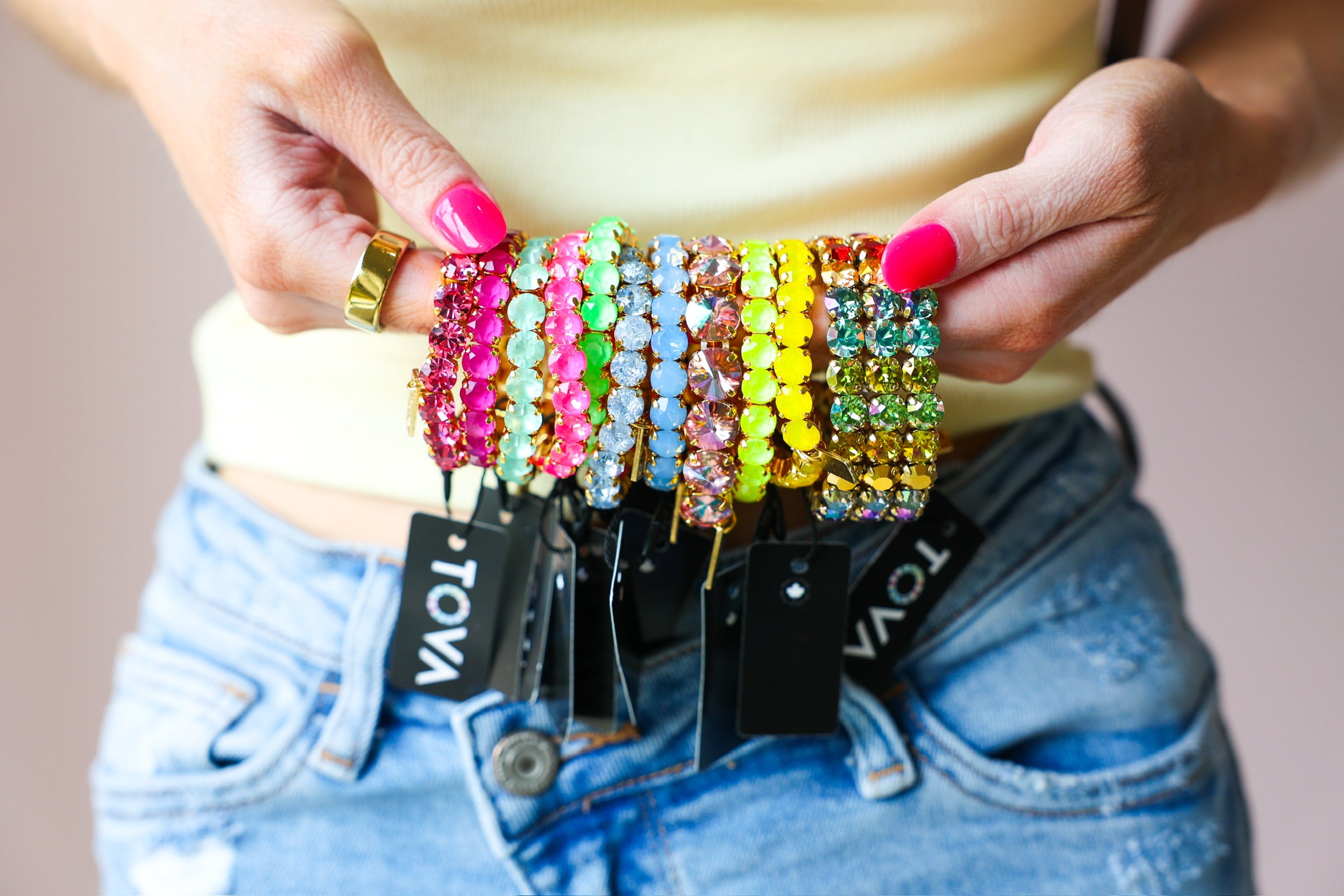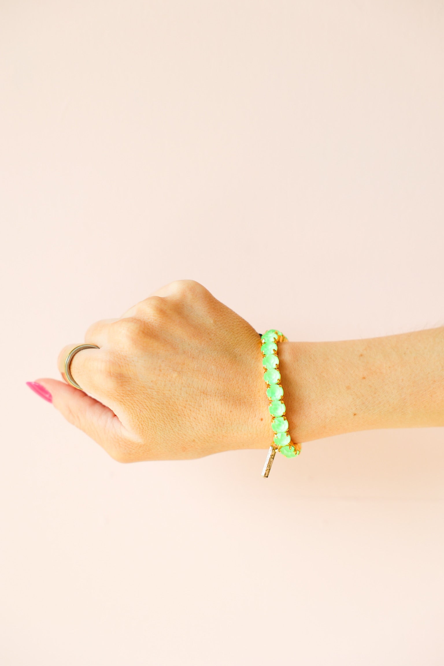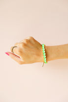 This bracelet is the ultimate pop of color for your stack. Featuring vibrant electric green stones set in a sleek gold-tone setting, it brings a bold, fresh energy that instantly brightens any look.