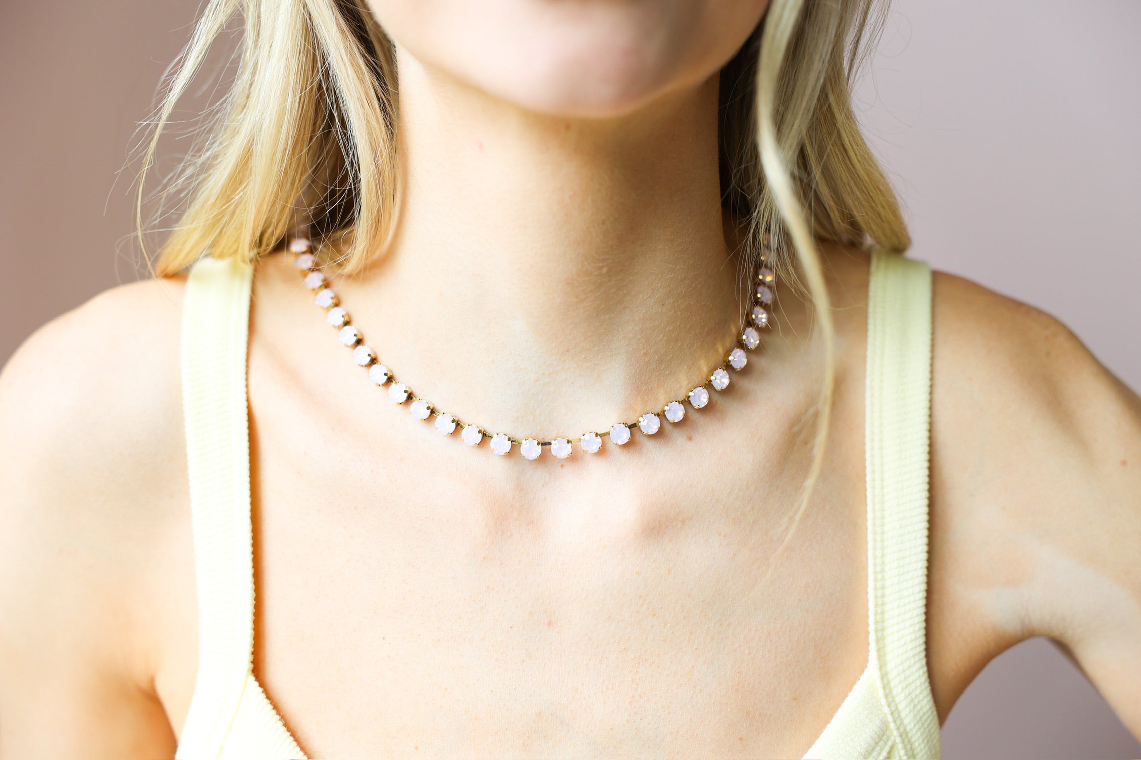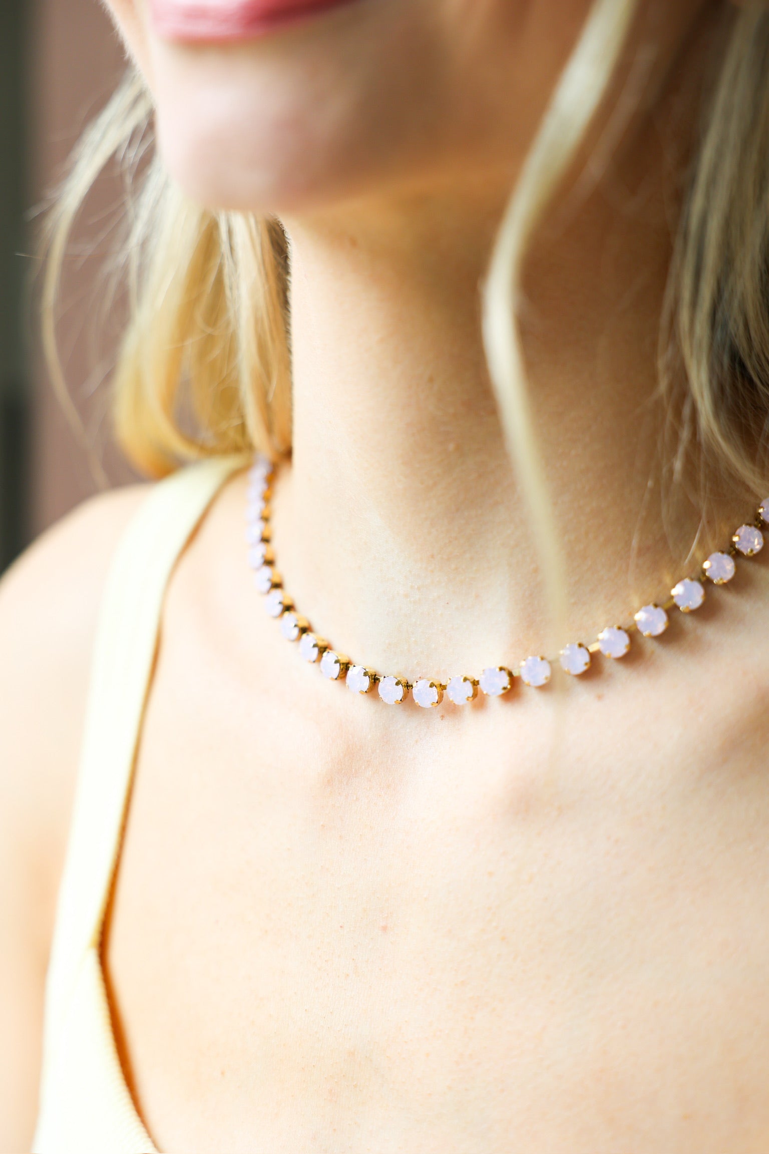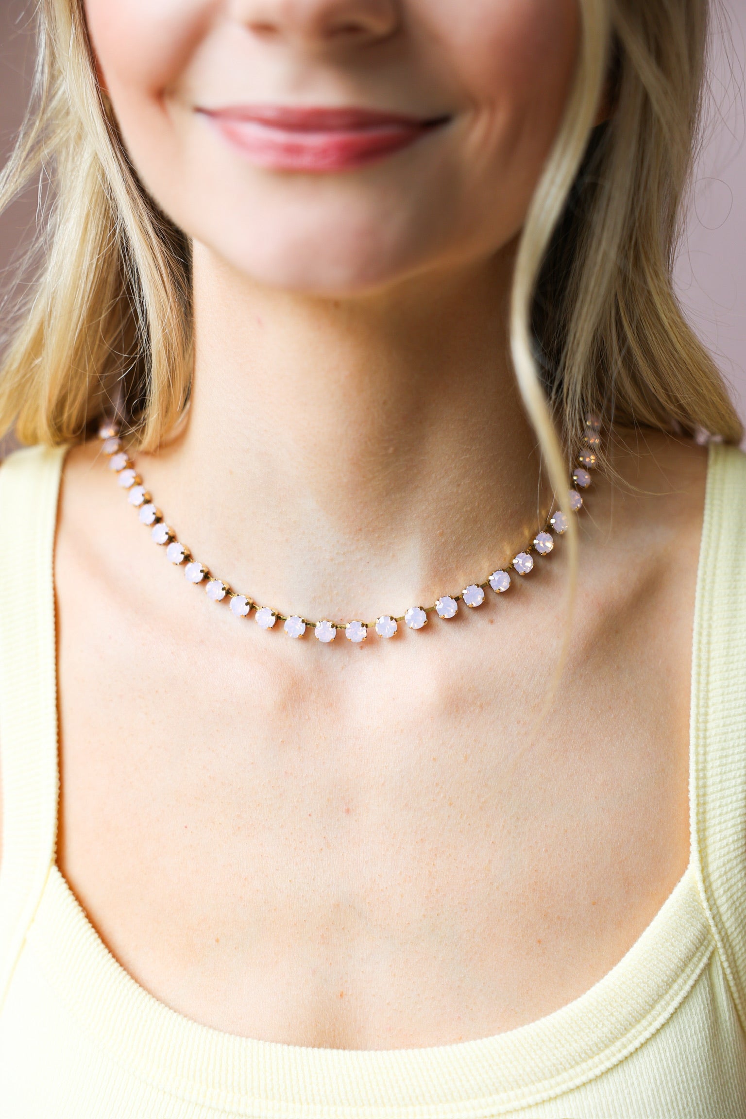 This necklace is soft, feminine, and effortlessly elegant. Featuring delicate rose opal stones with a milky, blush-toned glow, it adds a subtle touch of color while keeping your look light and refined.