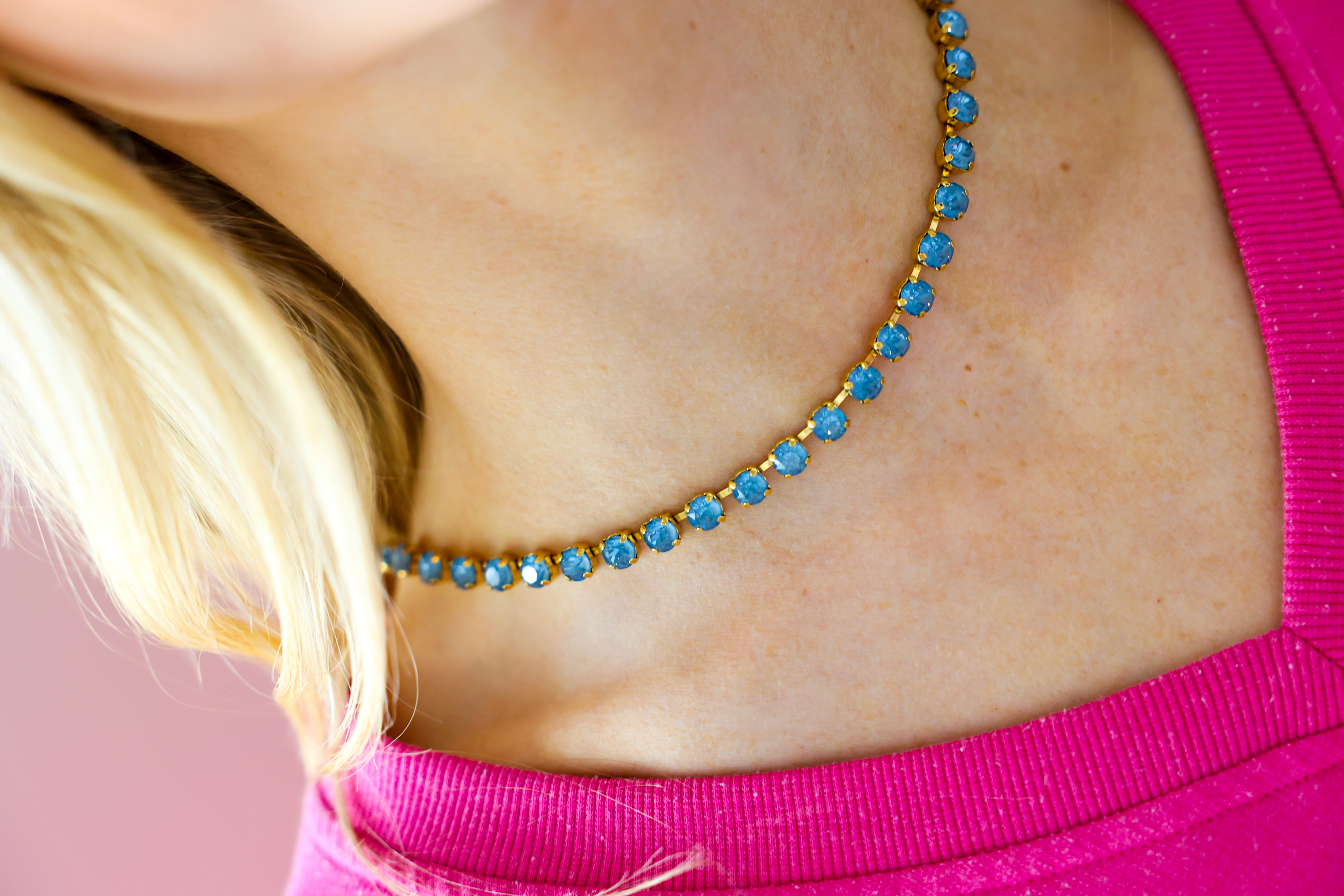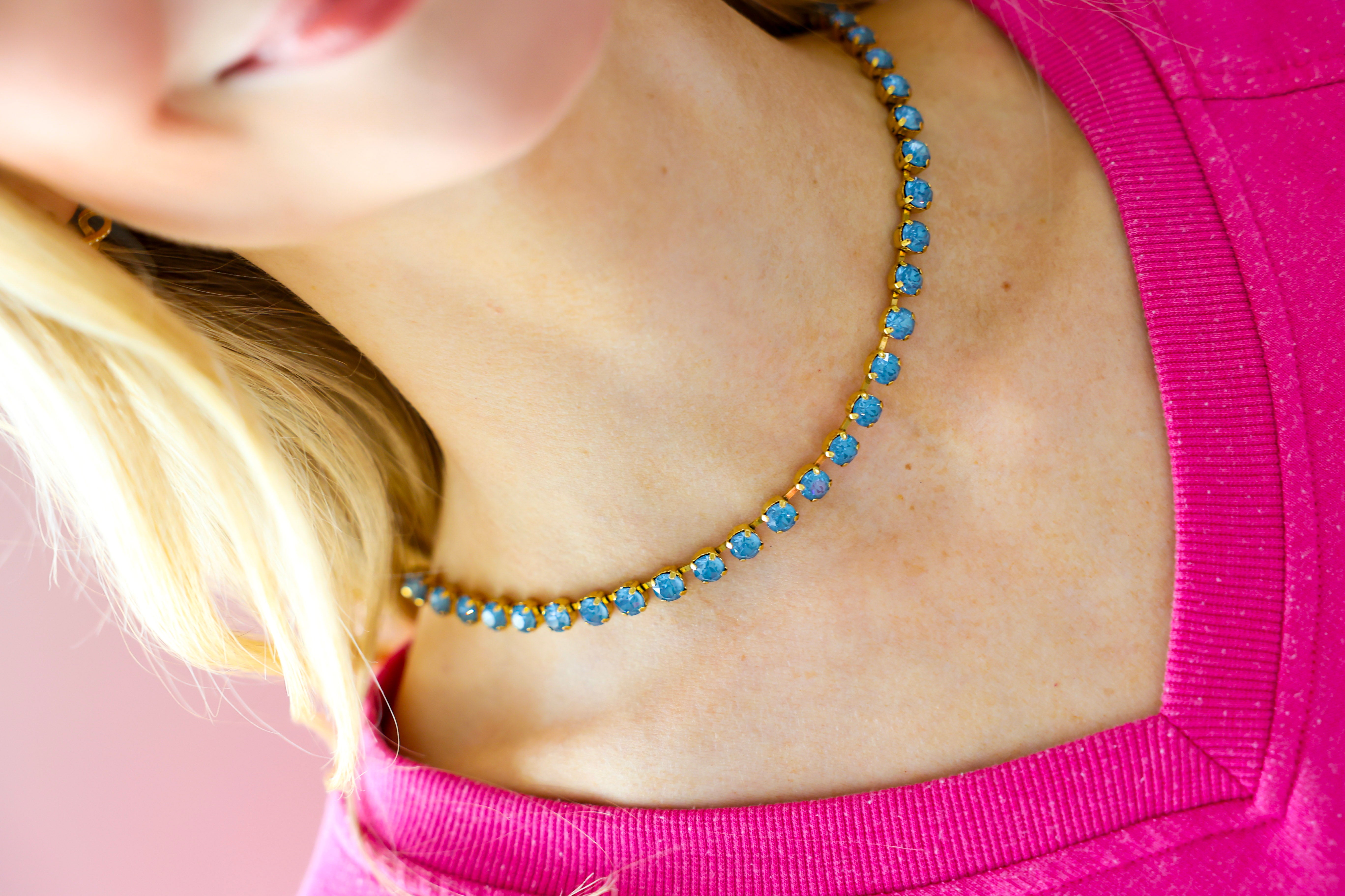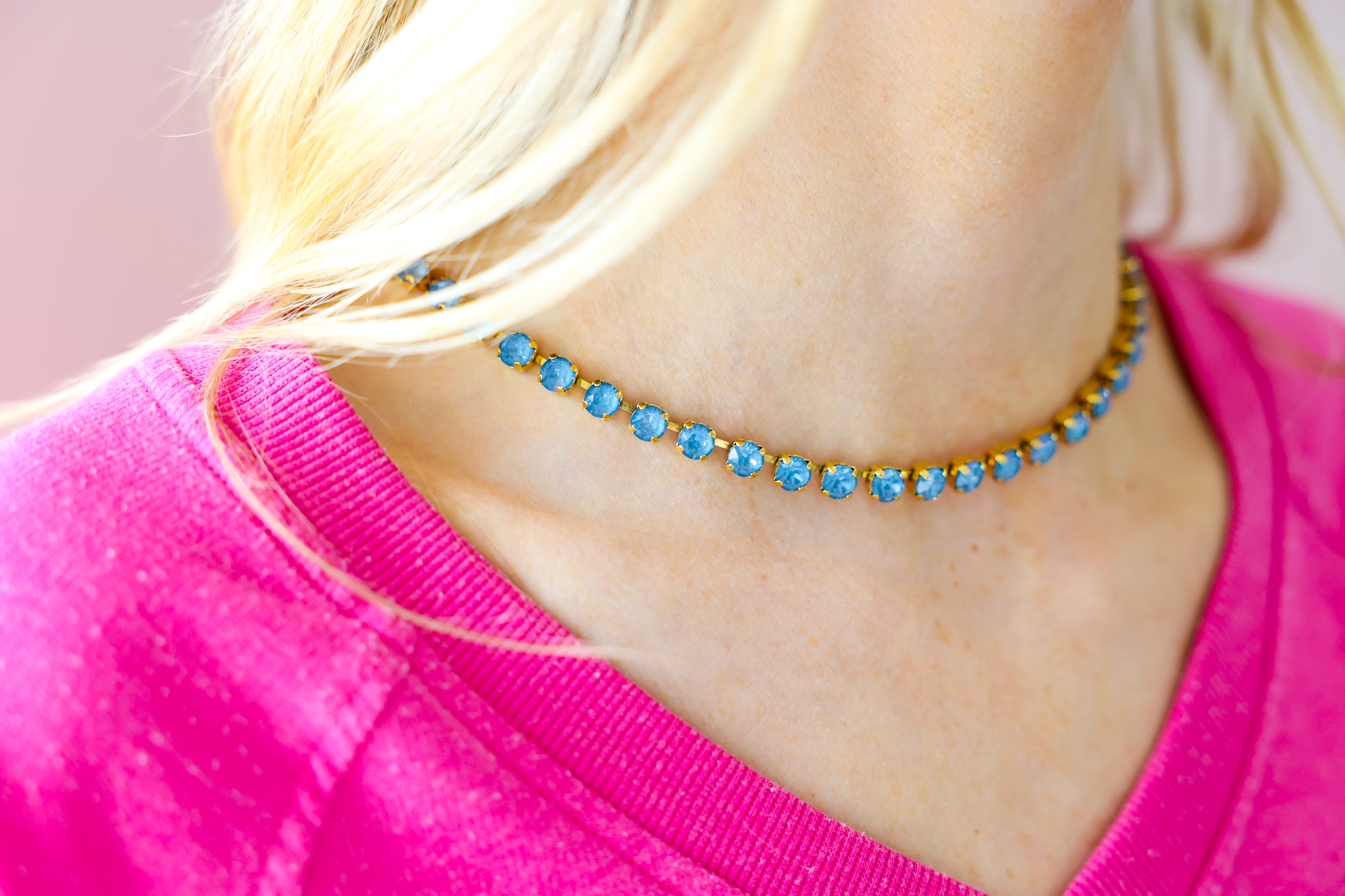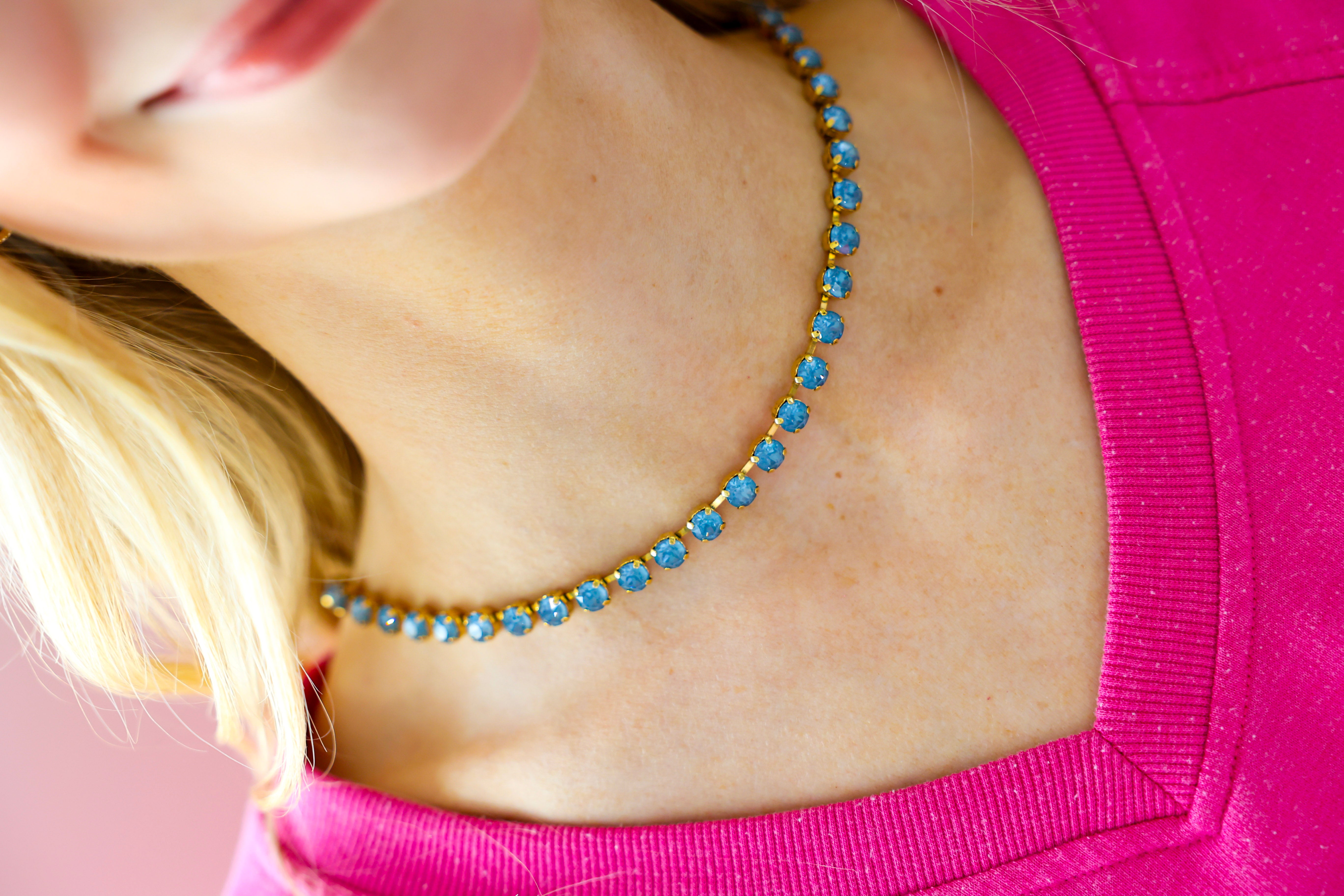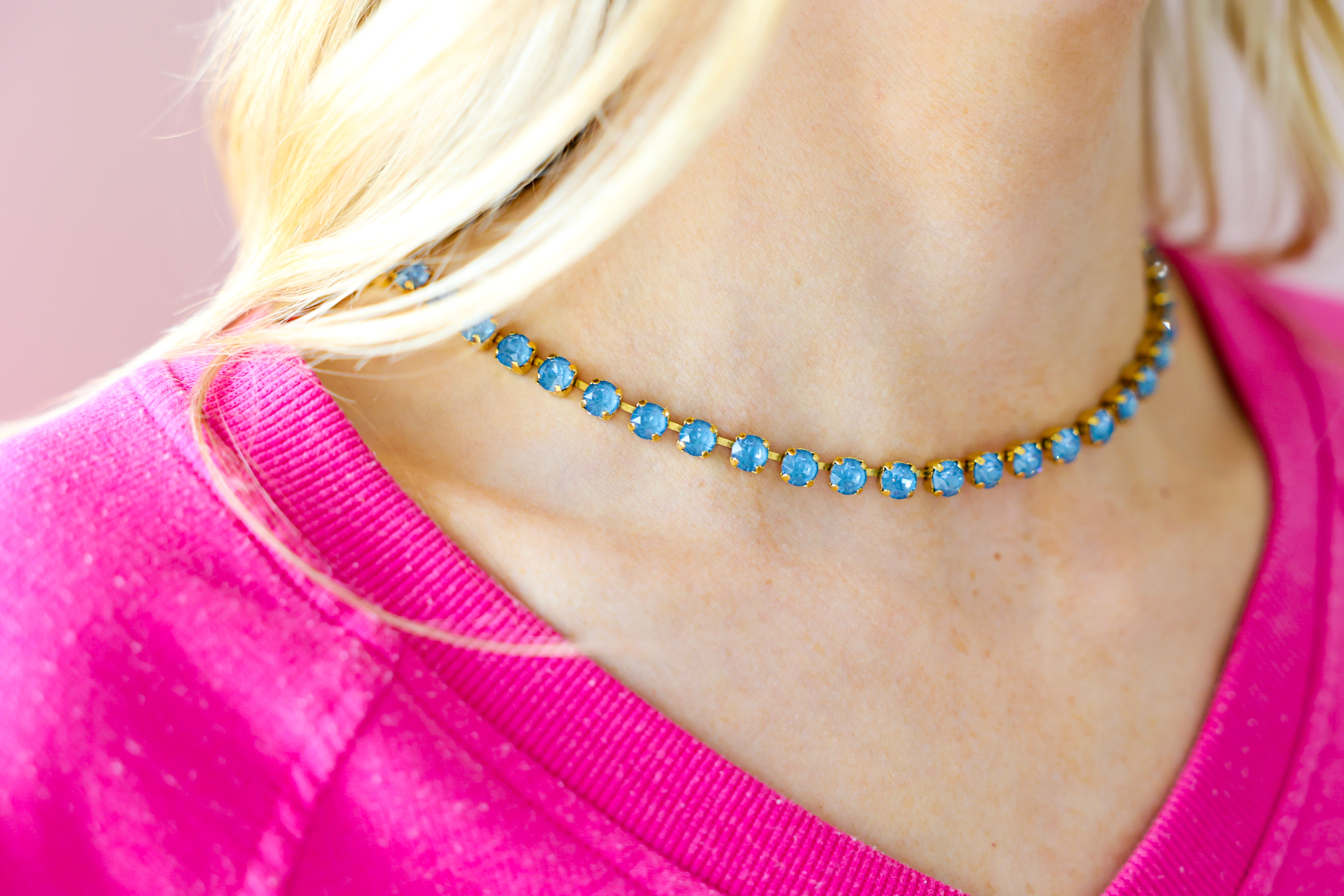 Add the perfect pop of sparkle with the TOVA Sarina Necklace in Midnight Express – Denim Ignite. Featuring antique gold plating and brilliant high-quality crystals, this eye-catching piece delivers just the right amount of glam for everyday styling or a night out. The rich denim-blue crystal tones create a bold yet versatile look that pairs effortlessly with everything from casual denim to dressier outfits.
