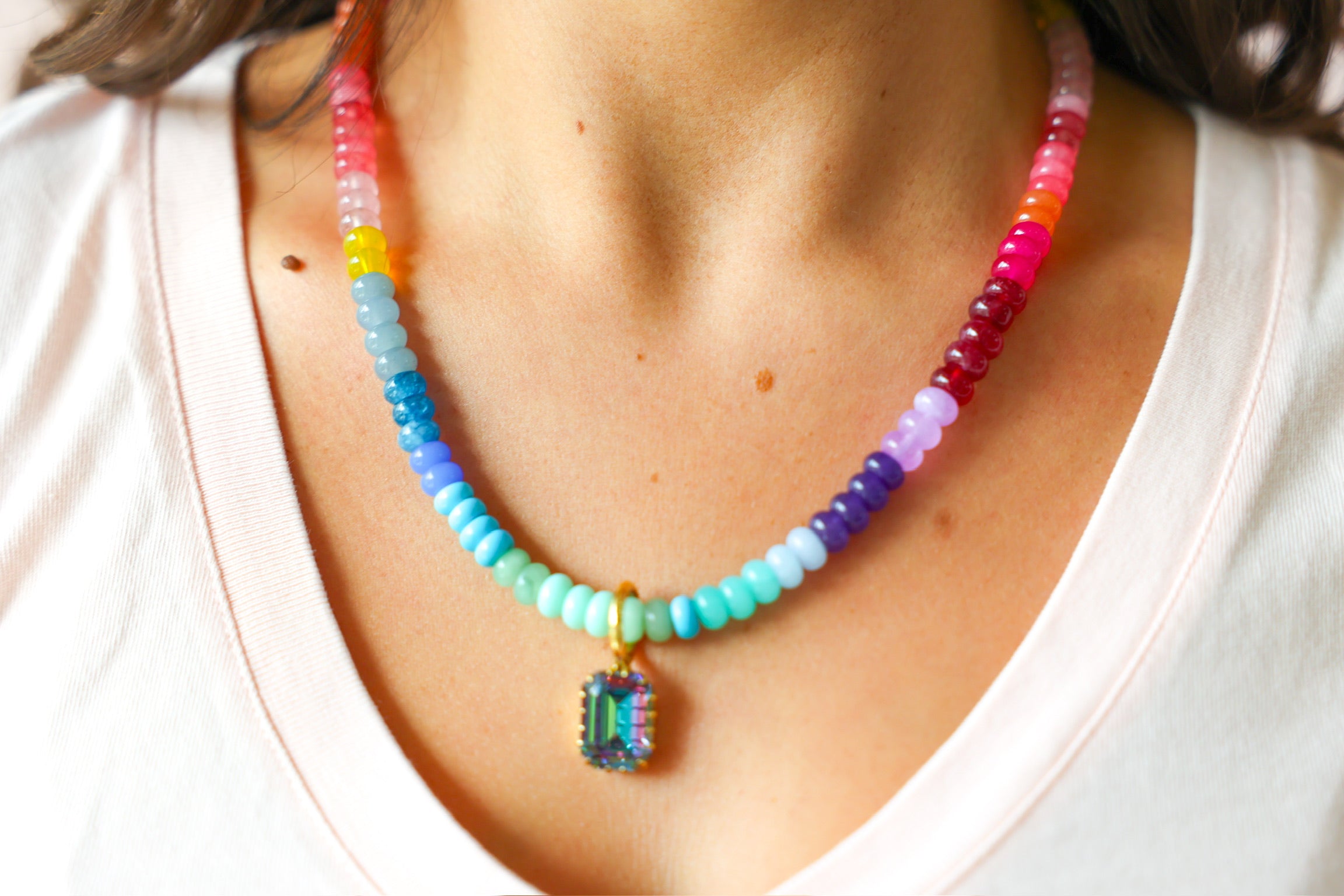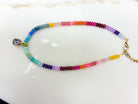 Bright, cheerful, and full of joy. The TOVA Candy Rainbow Necklace features a playful mix of colorful stones that instantly lift your look.