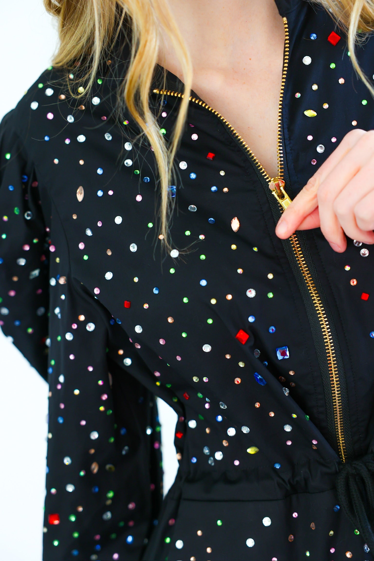 Black Multi Scattered Rhinestone Long Sleeve Romper Queen of Sparkles