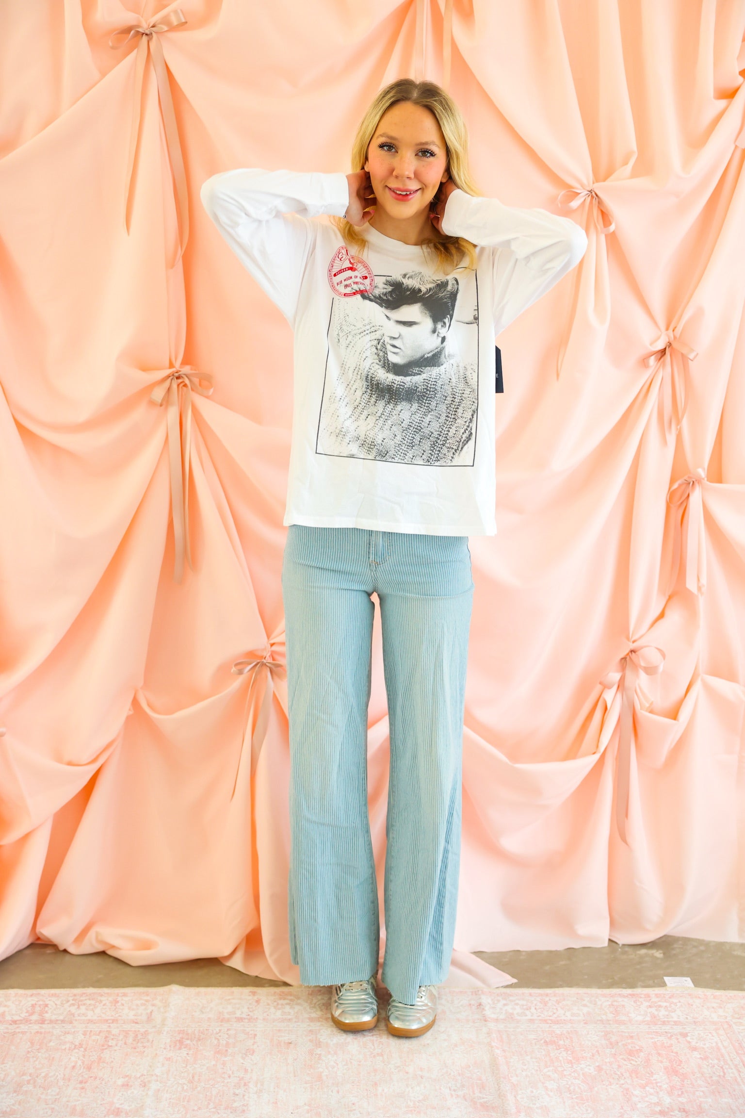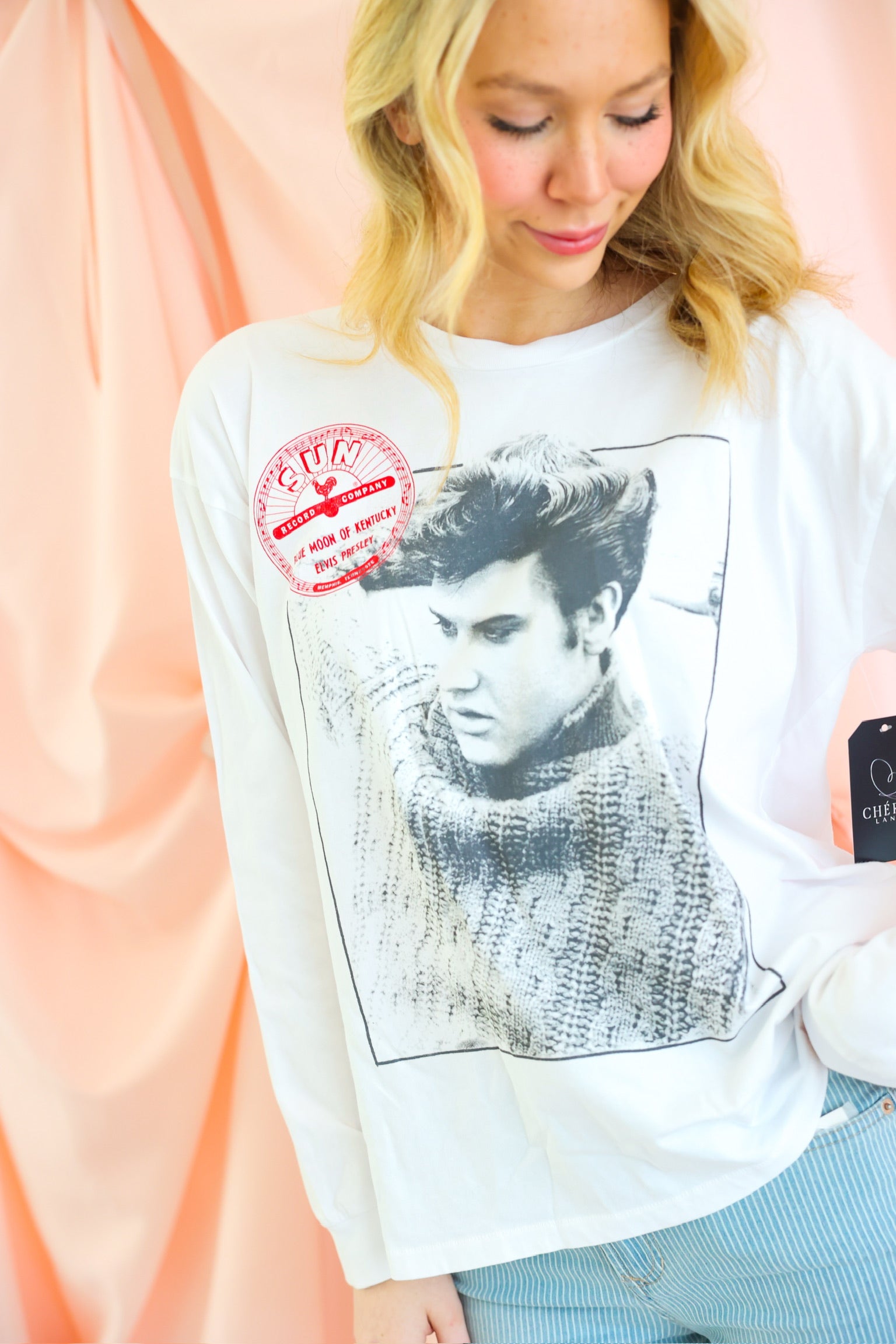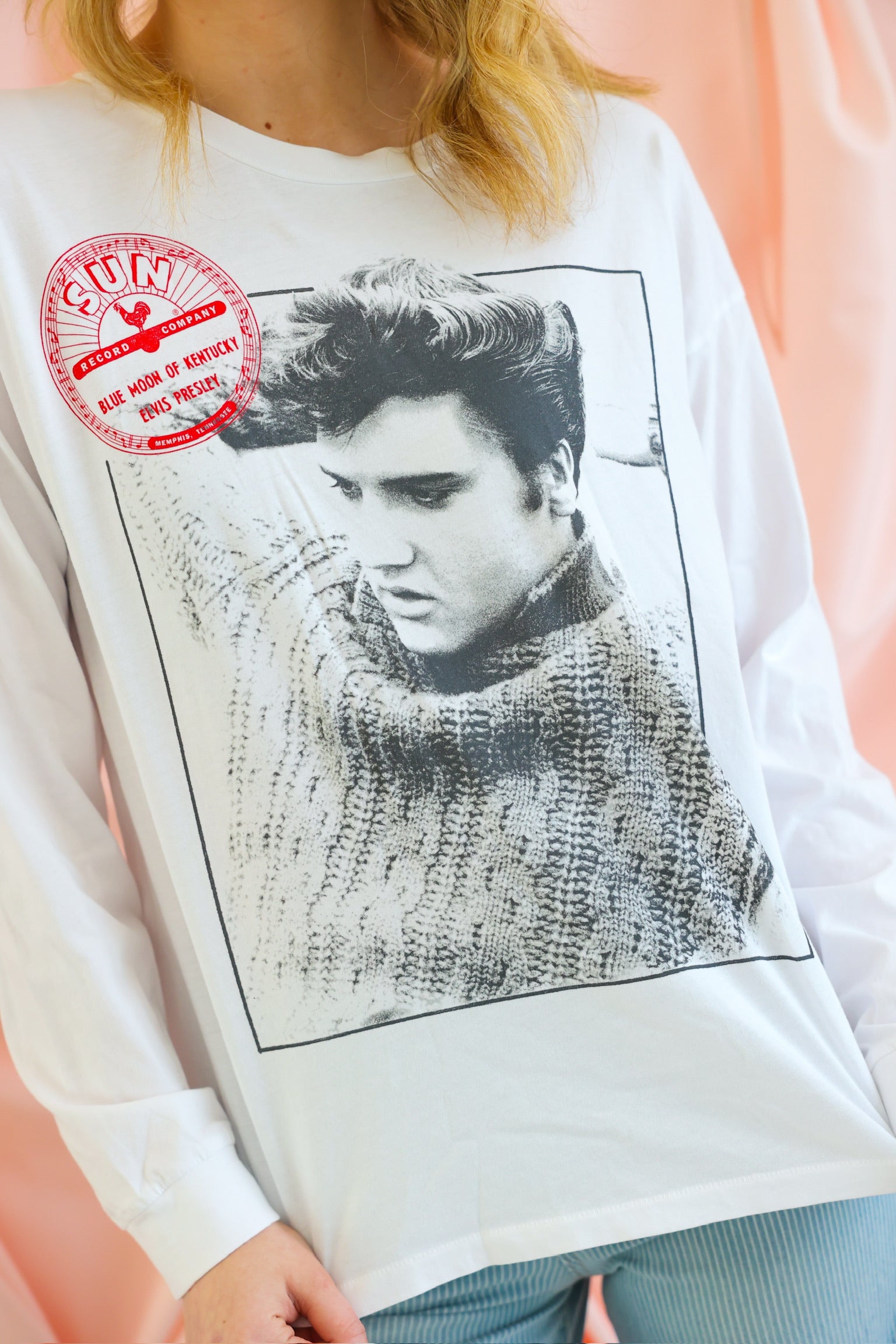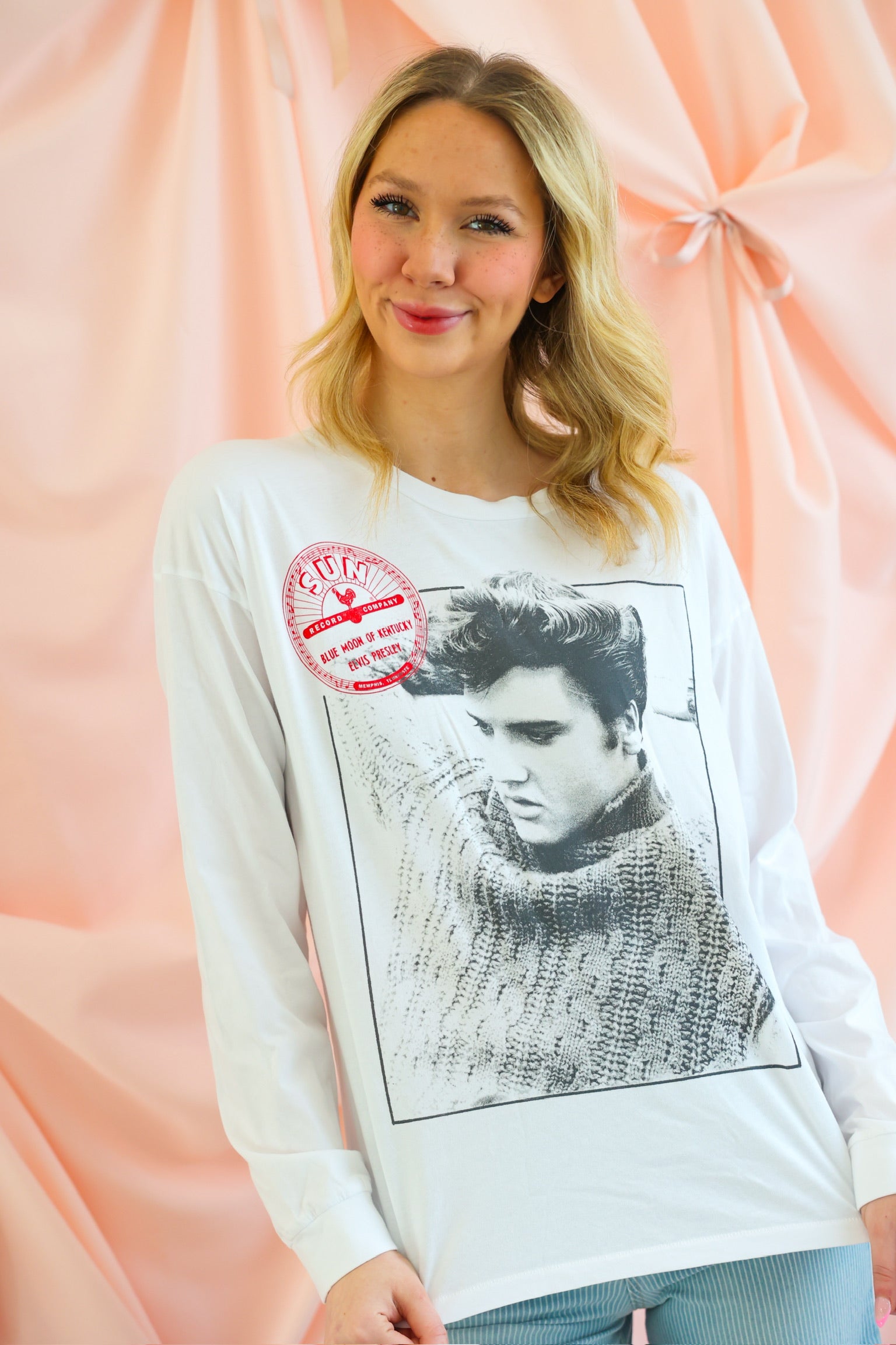 An icon. A label. A moment in music history. The Sun Records x Elvis Relaxing Merch Long Sleeve pays tribute to the King of Rock and Roll with a striking black-and-white portrait of Elvis Presley, finished with the legendary Sun Records label logo. Designed with an intentionally oversized silhouette and slouchy sleeves, this long sleeve delivers that effortless, borrowed-from-the-boys vibe with vintage edge. It is the kind of piece that feels timeless, cool, and endlessly wearable.