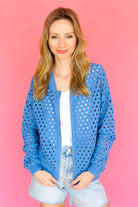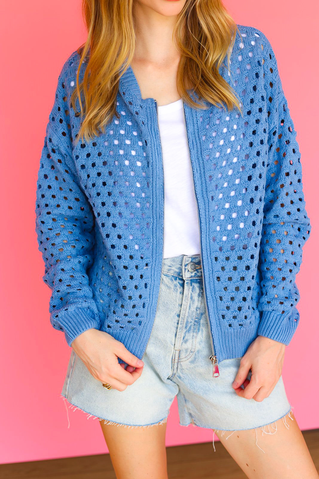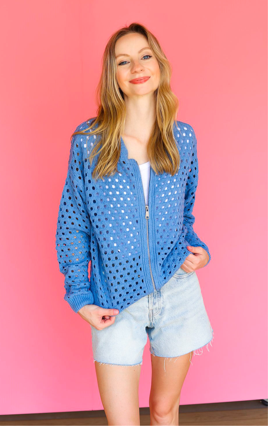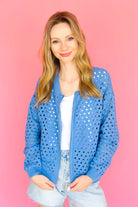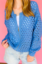 Experience the perfect blend of comfort and style with the Fall For You Crochet Zip-up by Elan in a soothing blue hue. This zip-up features delicate crochet craftsmanship that adds a unique, textured look while providing warmth for cooler days. Its versatile design makes it an ideal layering piece to elevate your fall wardrobe effortlessly. Stay cozy and chic with this must-have addition that brings both charm and practicality to your everyday outfits.