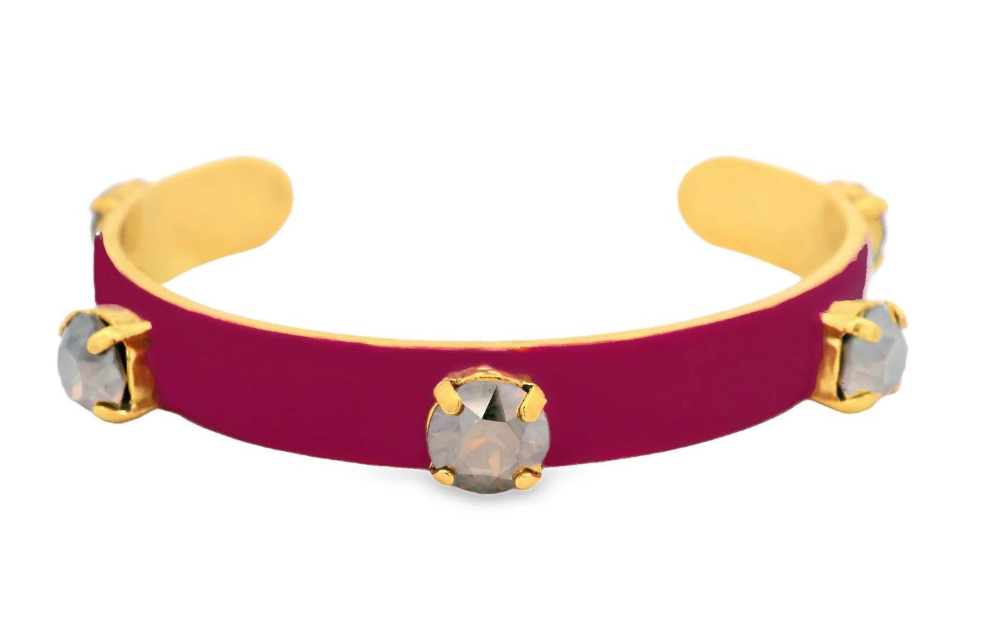 The Kennedy Cuff in Midnight Express - a playful and unique addition to your accessory collection. Made with antique gold plated brass, high quality crystals, and hand painted enamel, this cuff is a one-of-a-kind piece that will add a touch of quirk to any outfit!