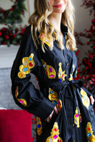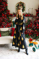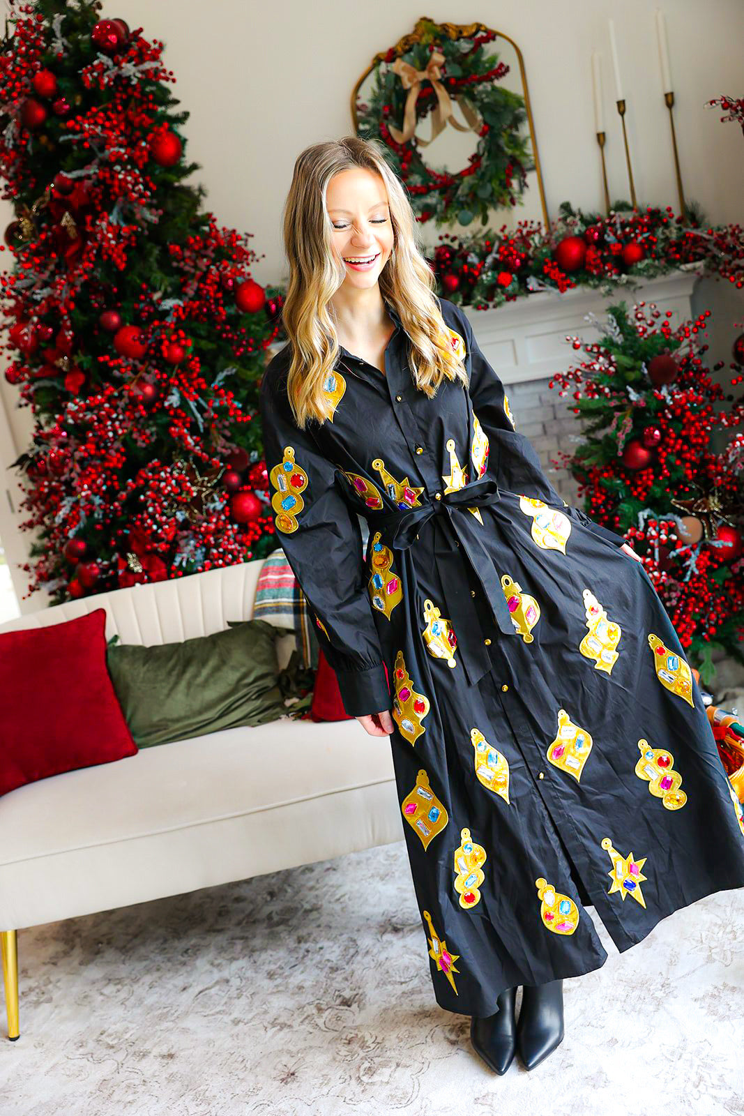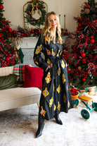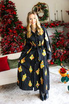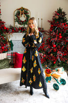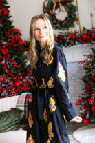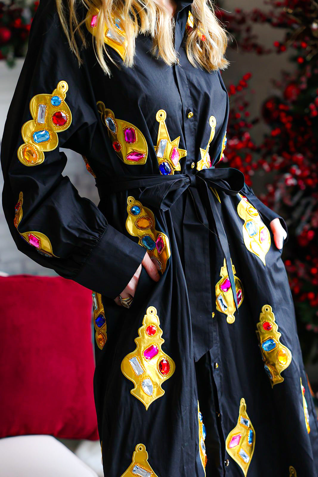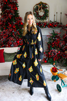Make a stunning statement this holiday season with the Black & Gold Jeweled Ornament Cotton Tie Midi Dress, designed for the Queen of Sparkles. Crafted from breathable cotton, this elegant midi dress features shimmering gold ornament details and a flattering tie waist for a perfect fit. Whether at a festive party or a special evening out, it effortlessly combines comfort and glamour to ensure you shine with confidence!