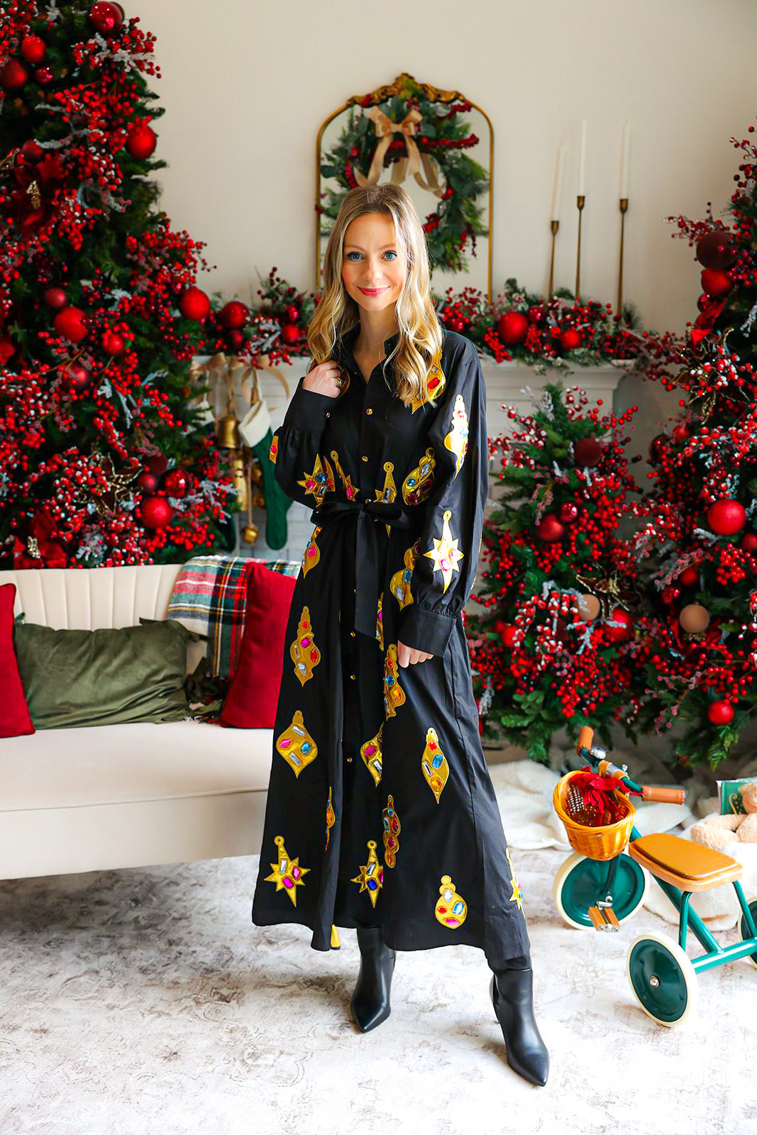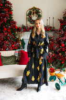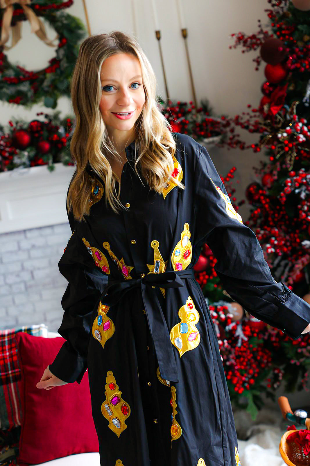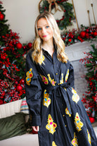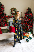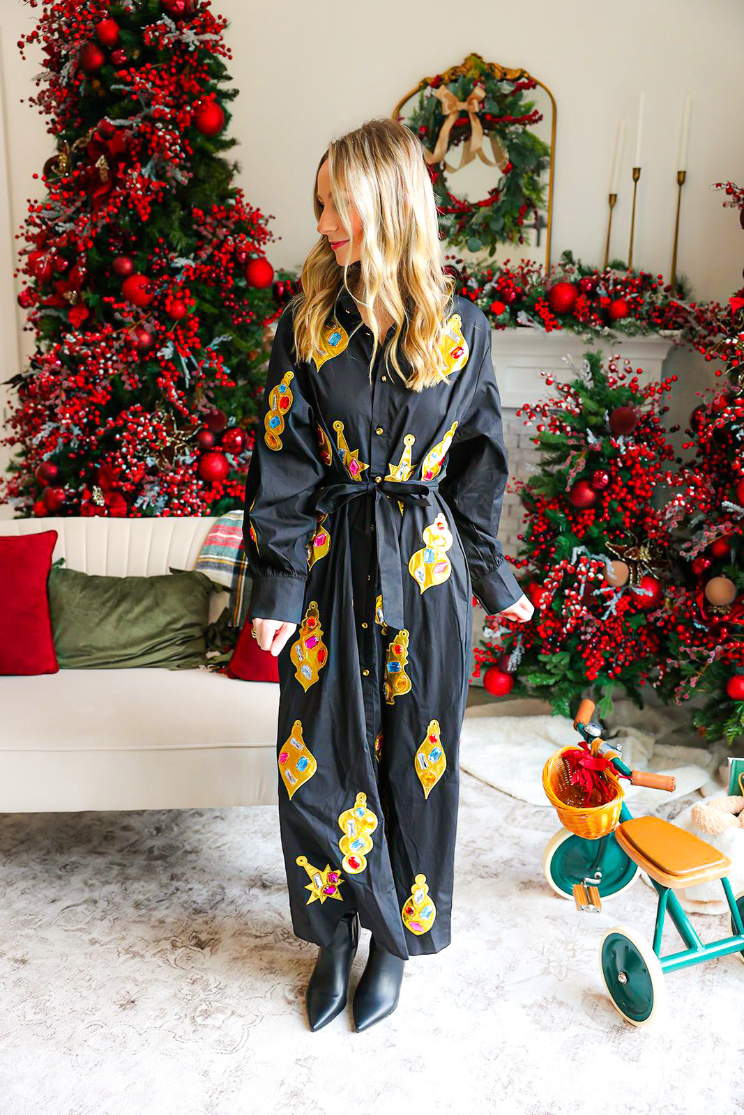 Make a stunning statement this holiday season with the Black & Gold Jeweled Ornament Cotton Tie Midi Dress, designed for the Queen of Sparkles. Crafted from breathable cotton, this elegant midi dress features shimmering gold ornament details and a flattering tie waist for a perfect fit. Whether at a festive party or a special evening out, it effortlessly combines comfort and glamour to ensure you shine with confidence!