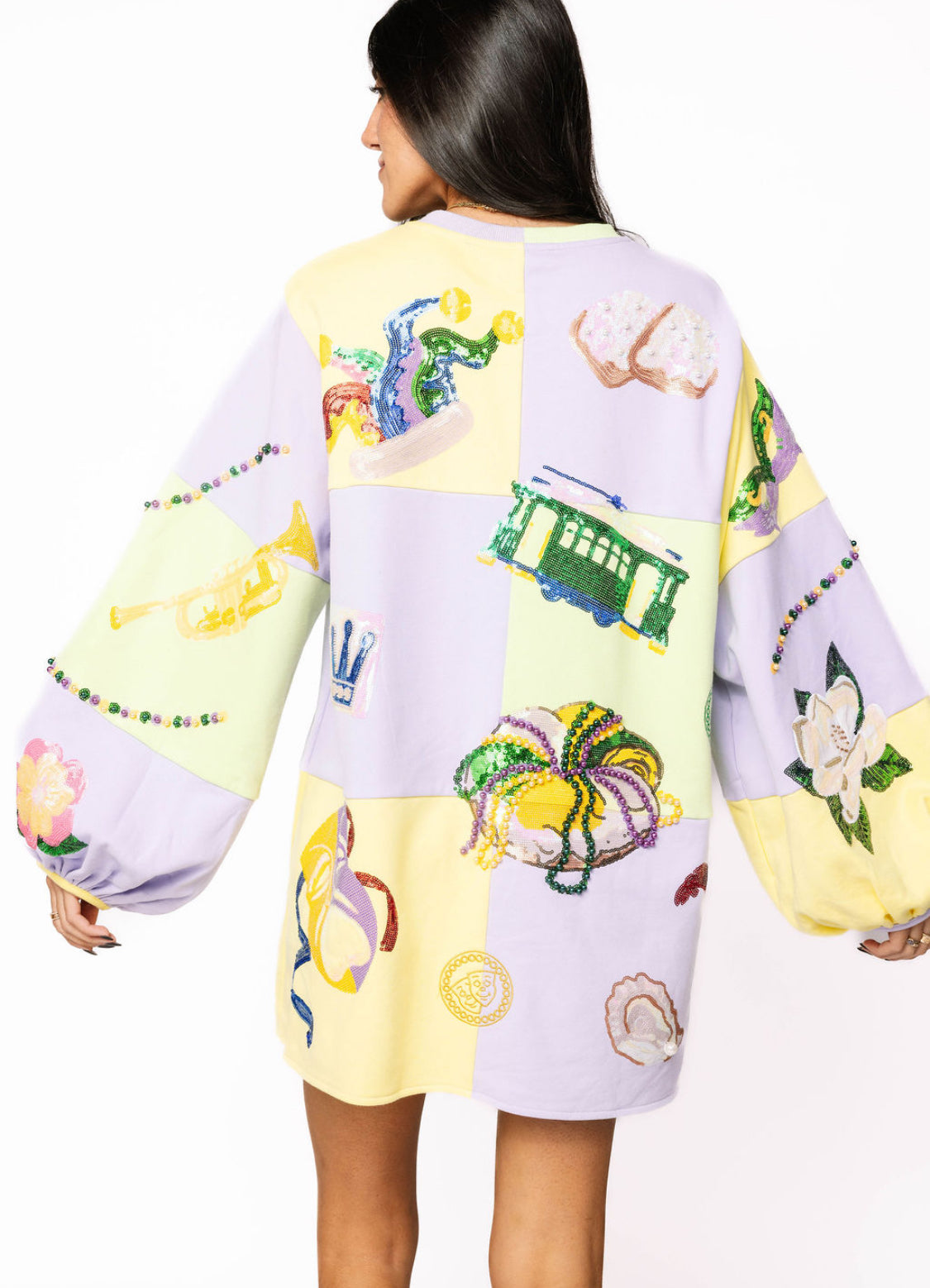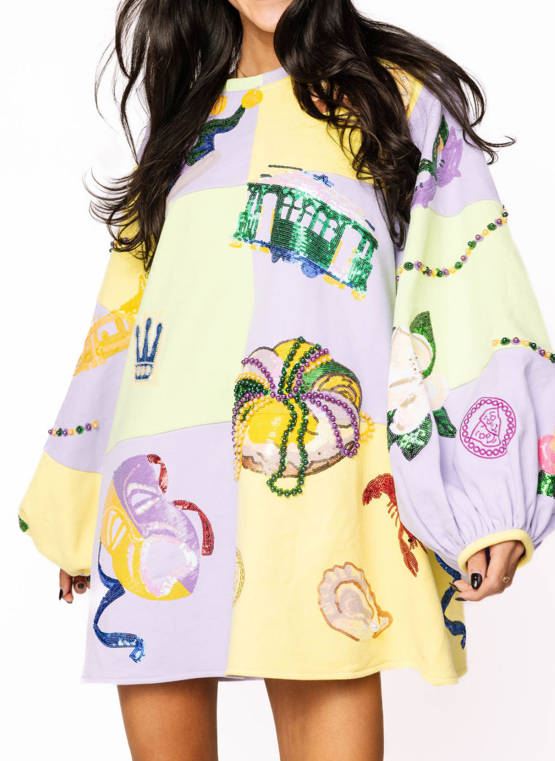 Celebrate in full sparkle with the Queen of Sparkles Checkered Mardi Gras Icon Balloon Sleeve Dress 🎭💜✨ This festive showstopper features a pastel checkered patchwork design adorned with oversized Mardi Gras icons—masks, crowns, beads, king cakes, streetcars, and more—each intricately embellished with sequins and beads for maximum shine 💚💛 The dramatic balloon sleeves add playful volume, making this the ultimate statement dress for parades, parties, and carnival celebrations.