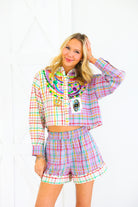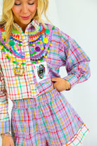 Celebrate the spirit of Mardi Gras in style with this vibrant Colorblock Gingham Button Up Top from Queen of Sparkles. Featuring bold, festive colorblocking paired with classic gingham detailing, this piece captures the playful energy of King Cake season. The structured button-up silhouette offers versatility—dress it up for parade season or down for everyday wear. Perfect for anyone who loves making a statement with their fashion choices, this top brings joy and personality to your wardrobe. Embrace the magic of New Orleans-inspired style with a piece that's as fun and fabulous as you are.