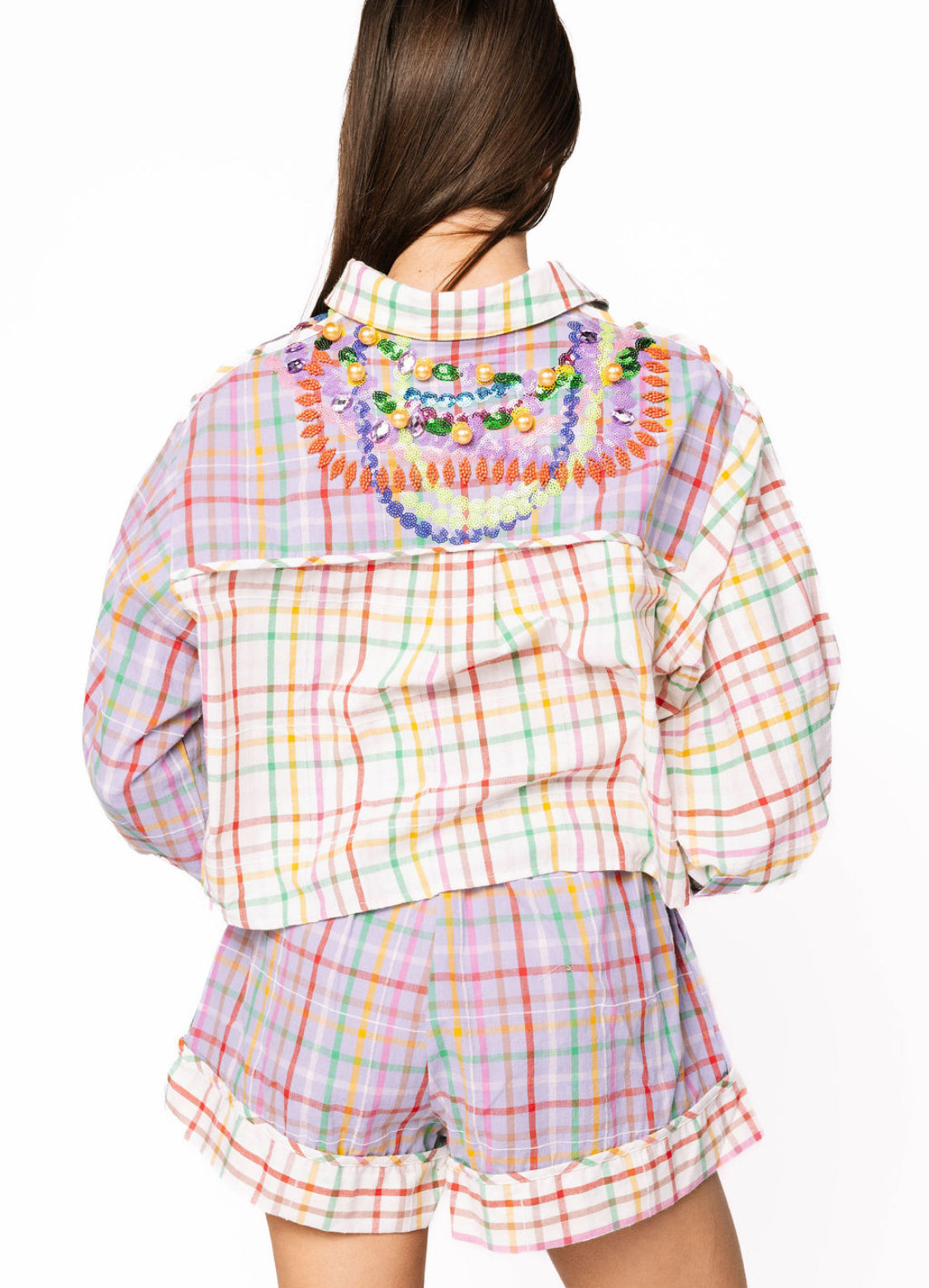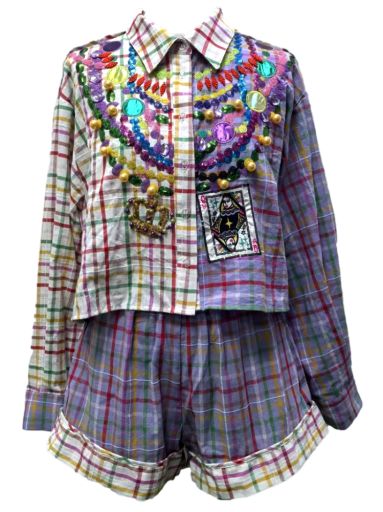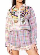 Celebrate Mardi Gras in full sparkle with the Queen of Sparkles Colorblock Plaid Mardi Gras Beads Button Up Top 🎭✨ This vibrant colorblock plaid button-up is adorned with signature Queen of Sparkles embellishments—layered sequin bead strands, jeweled appliqués, gold baubles, and a festive Mardi Gras playing card patch 💚💜💛 The cropped silhouette keeps the look fun and modern while bringing all the carnival flair. Pair it with the matching shorts for the complete show-stopping set!