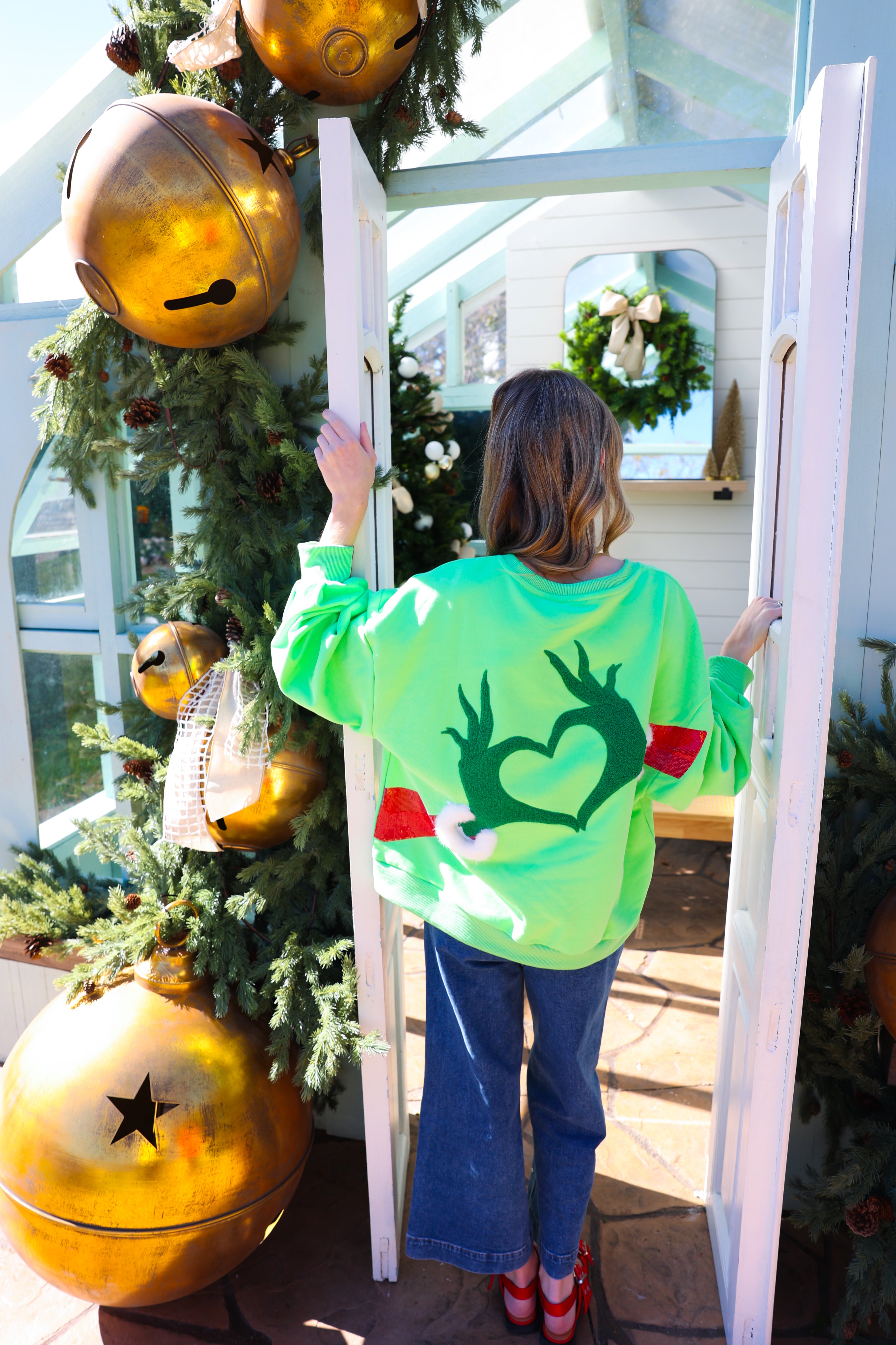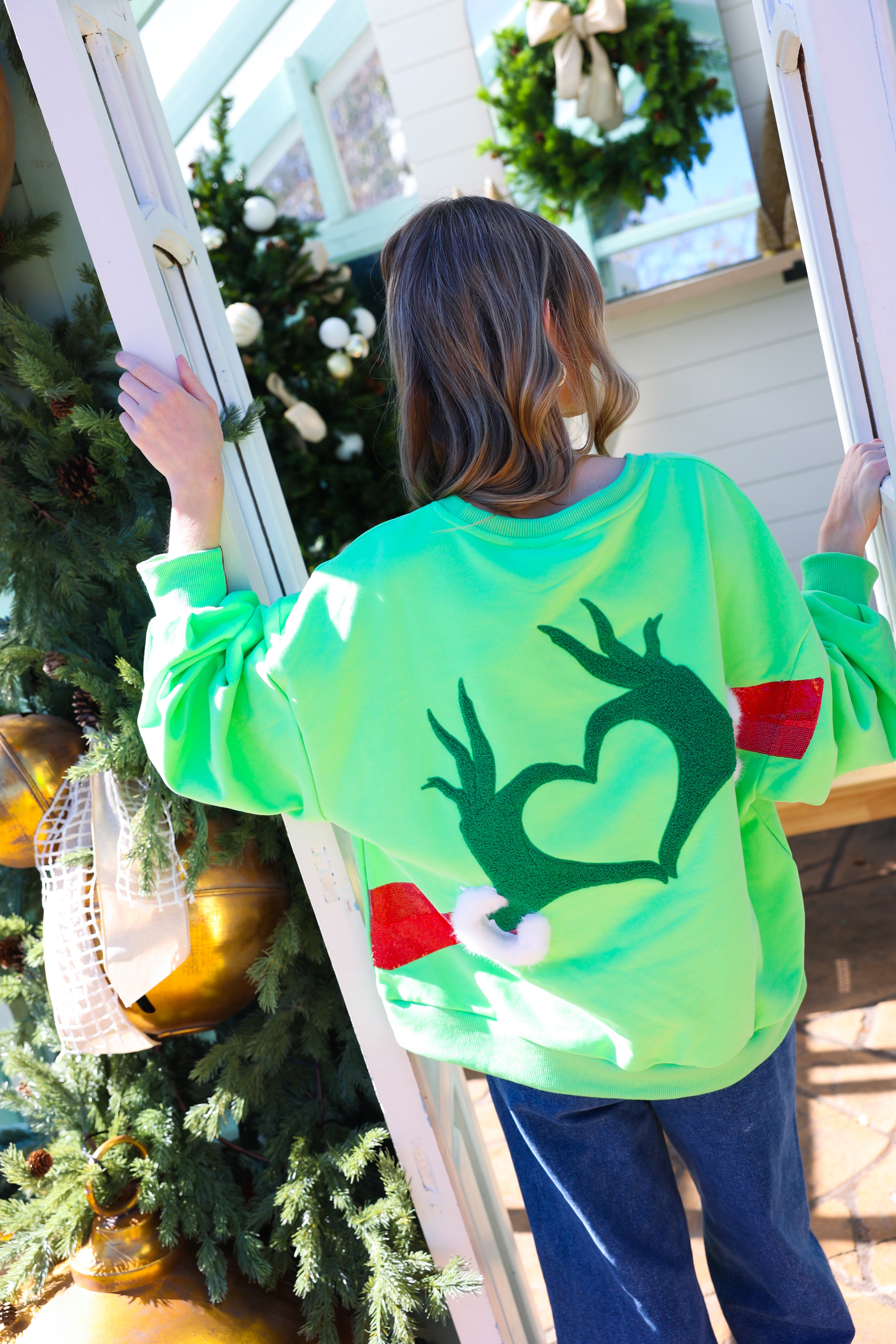 Green Grinch Heart Hands Sweatshirt Queen of Sparkles