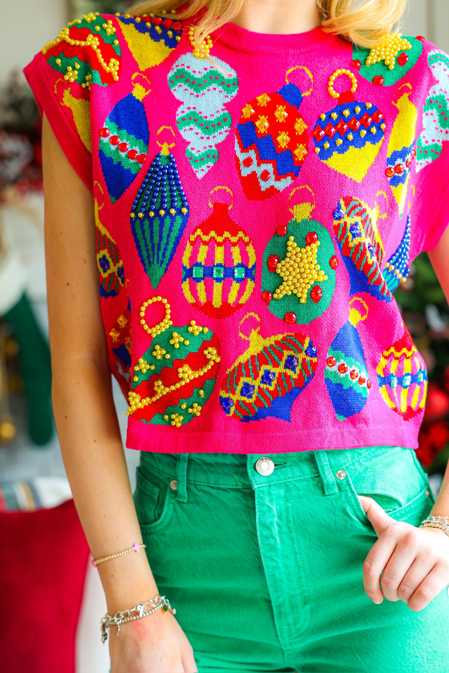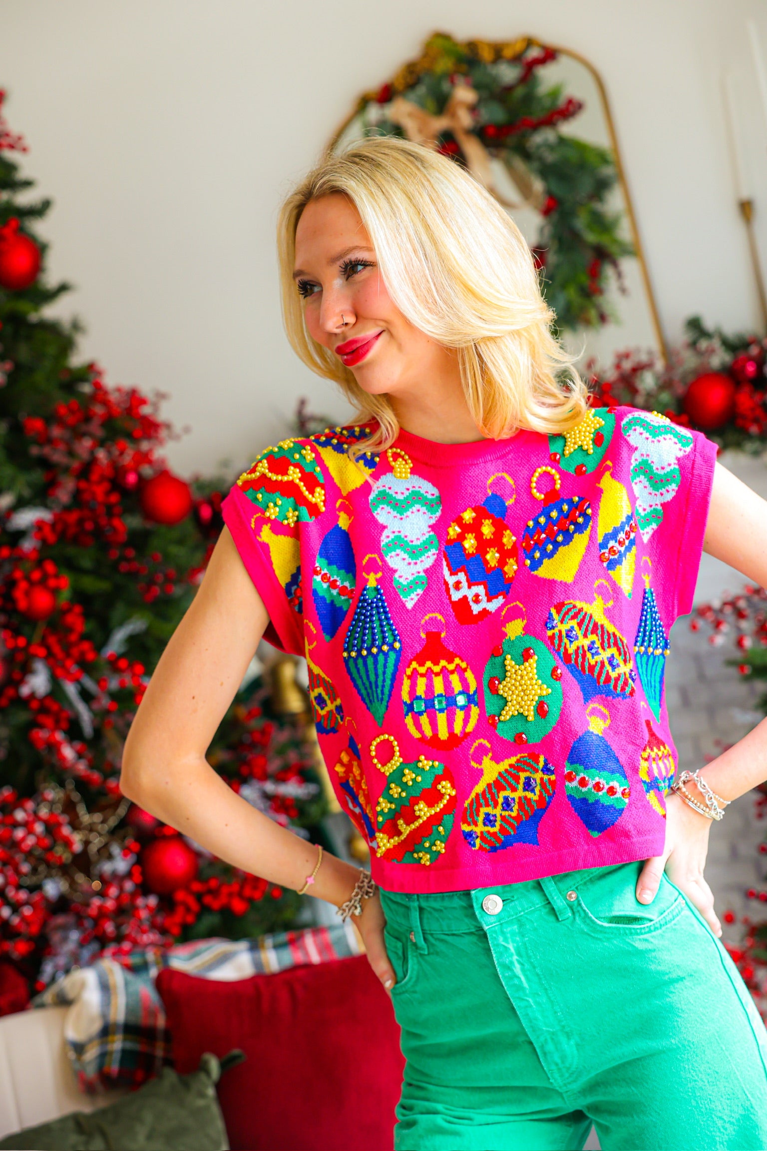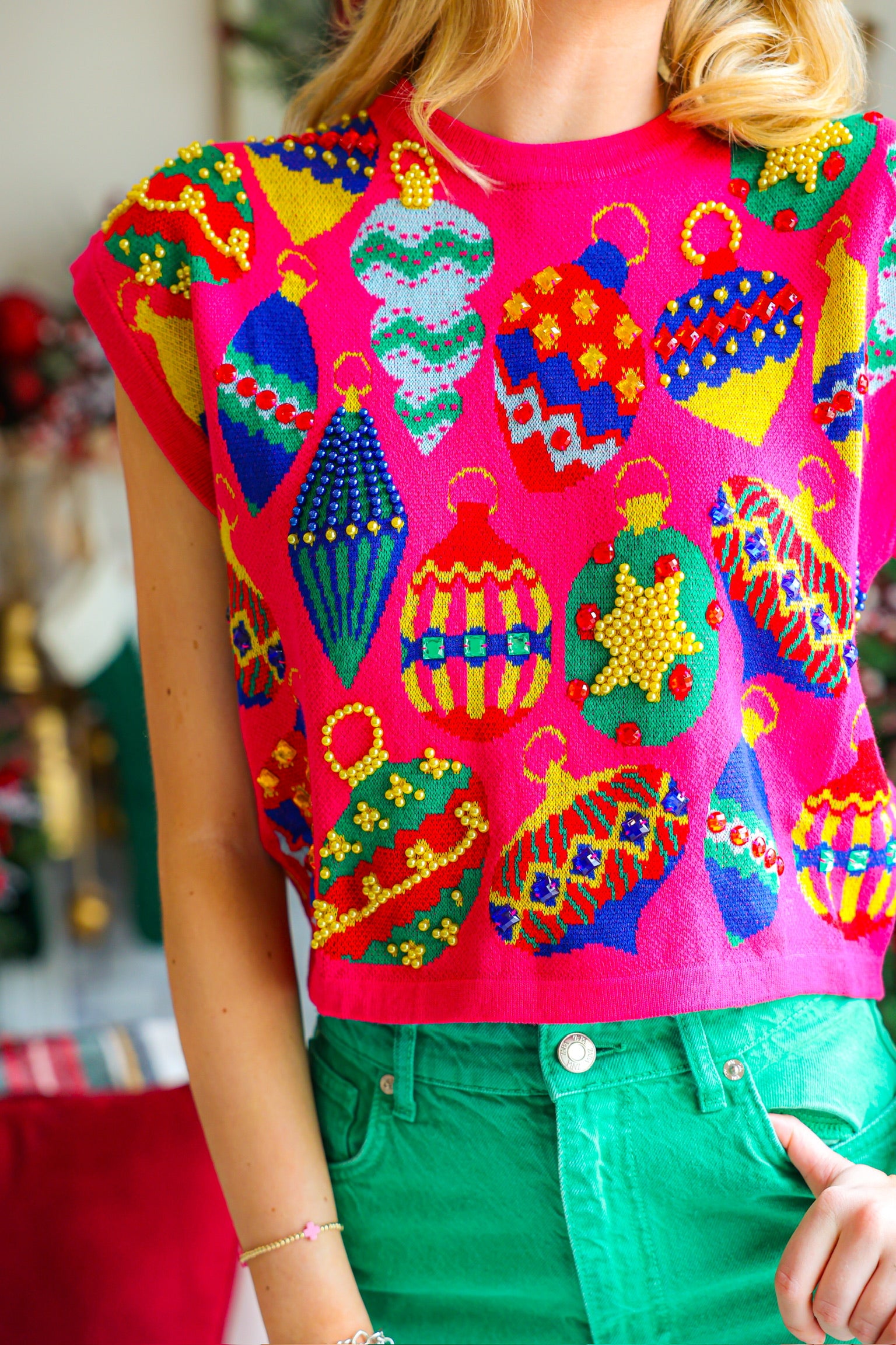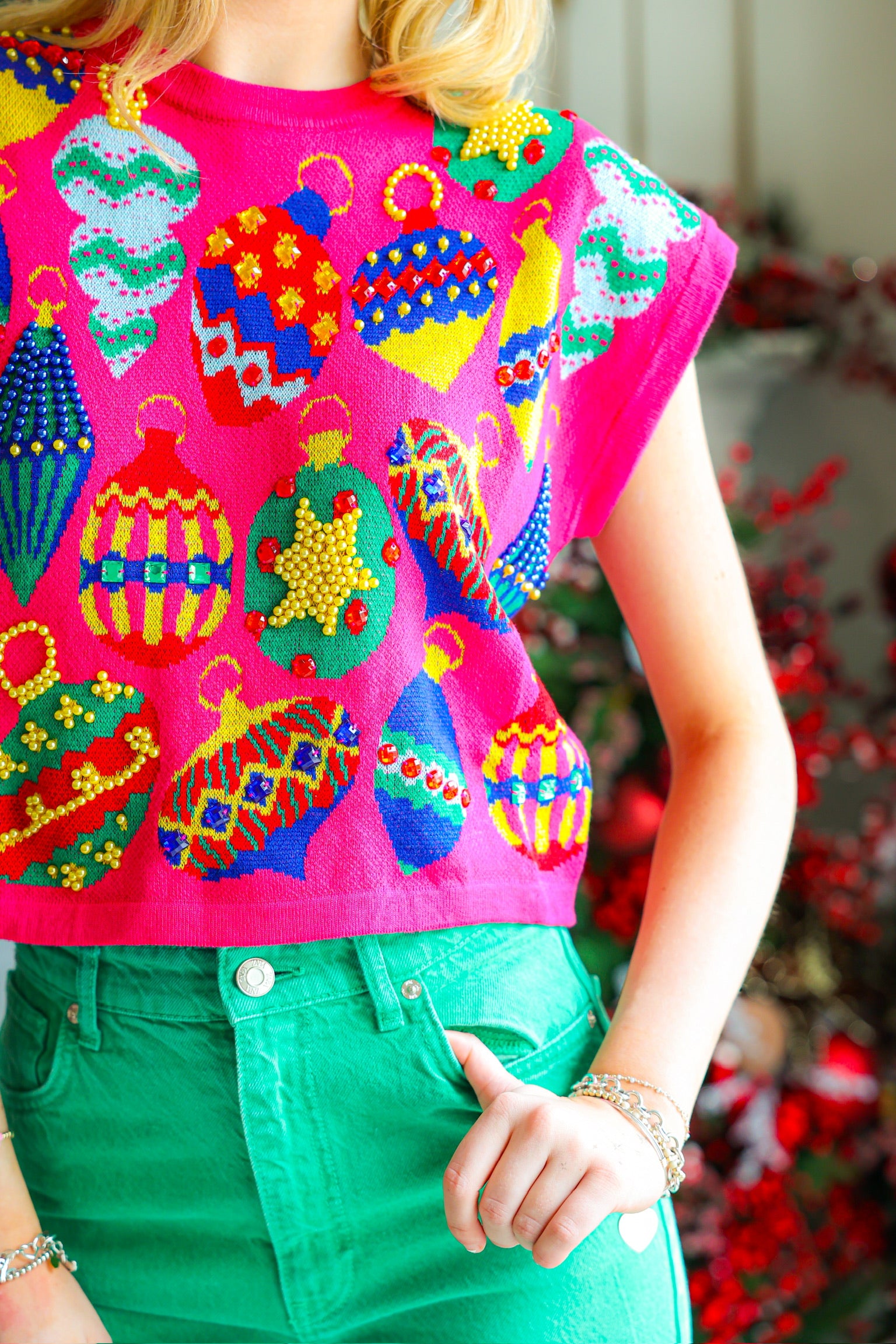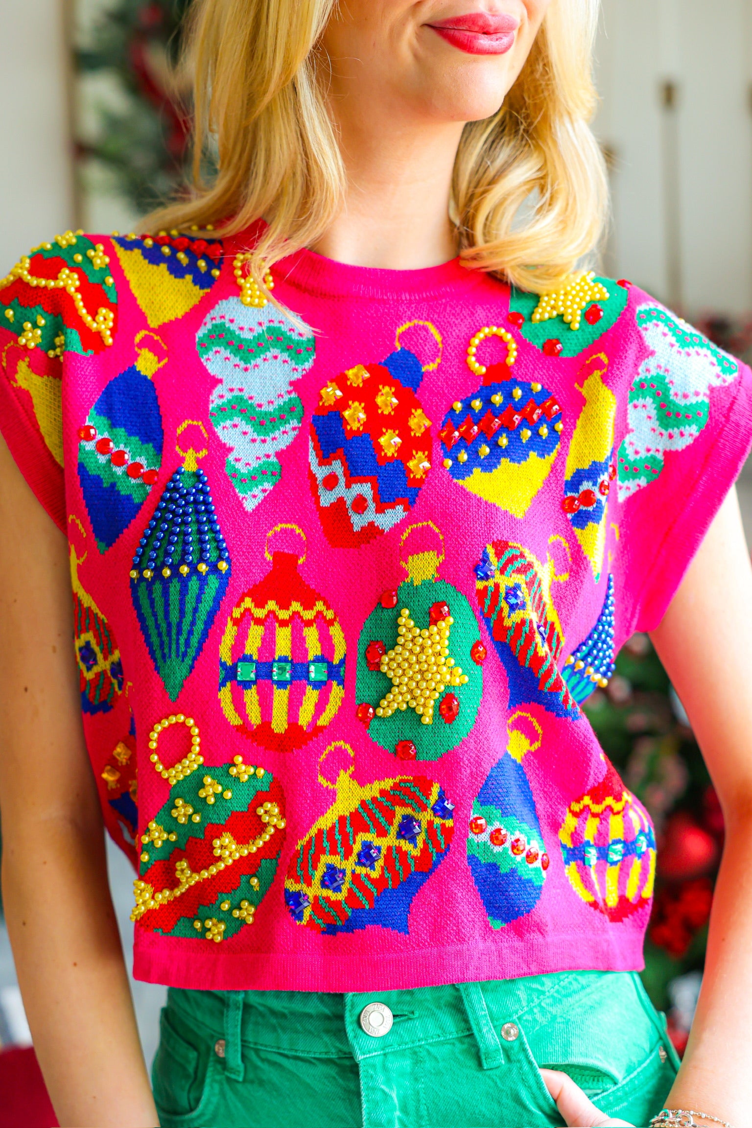 - Soft knit with vibrant hot pink base & multi‑jeweled ornament embellishments