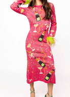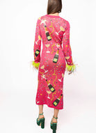 Hot Pink Popping Champagne Bottle & Coupe Feather Sleeve Midi Dress Queen of Sparkles