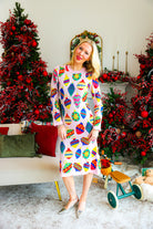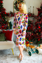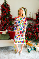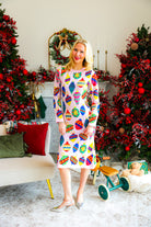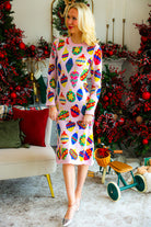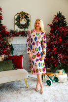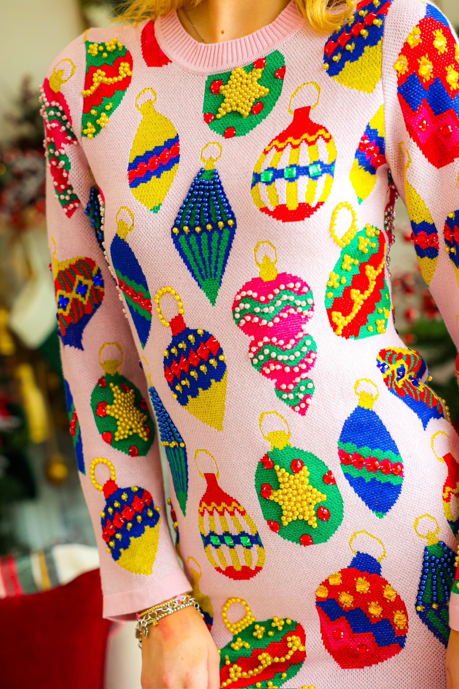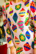 Elevate festive style with this light pink knit midi dress adorned with multi-jeweled ornament details. Soft and comfortable, it offers a graceful fit perfect for holiday gatherings or special occasions. Let your child dazzle as the queen of sparkles, combining warmth and elegance in one stunning outfit.
