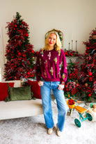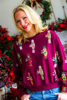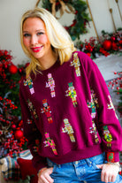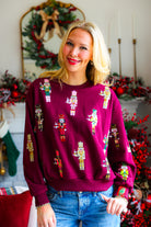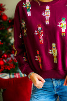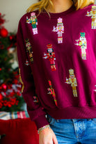 Step into festive elegance with the Plum Cocktail Serving Nutcracker Sweatshirt from Queen of Sparkles. This rich plum-colored sweatshirt features a charming nutcracker design serving cocktails, blending holiday whimsy with sophisticated style. Perfect for gatherings and cozy nights, it keeps you comfortable while making a memorable statement. Celebrate the season with warmth, sparkle, and a playful twist.