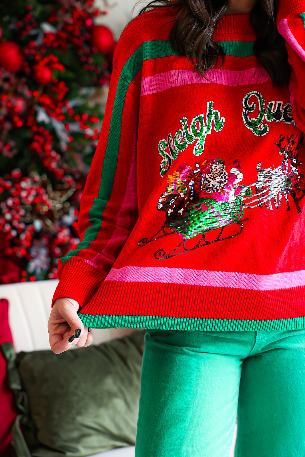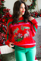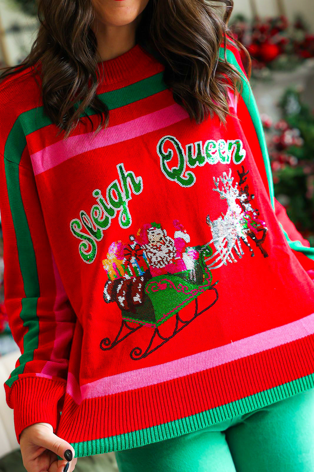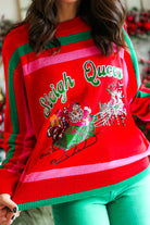 Celebrate the season in vibrant style with the Red, Green & Pink 'Sleigh Queen' Stripe Sweater, designed for the Queen of Sparkles. Featuring festive stripes and a bold “Sleigh Queen” statement, this cozy sweater keeps you comfortable while showcasing your holiday spirit. Perfect for parties or casual winter days, it brings playful charm and sparkling confidence to your festive wardrobe.