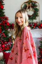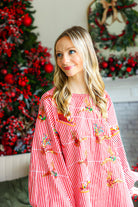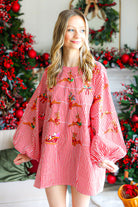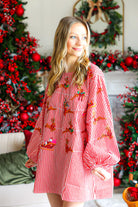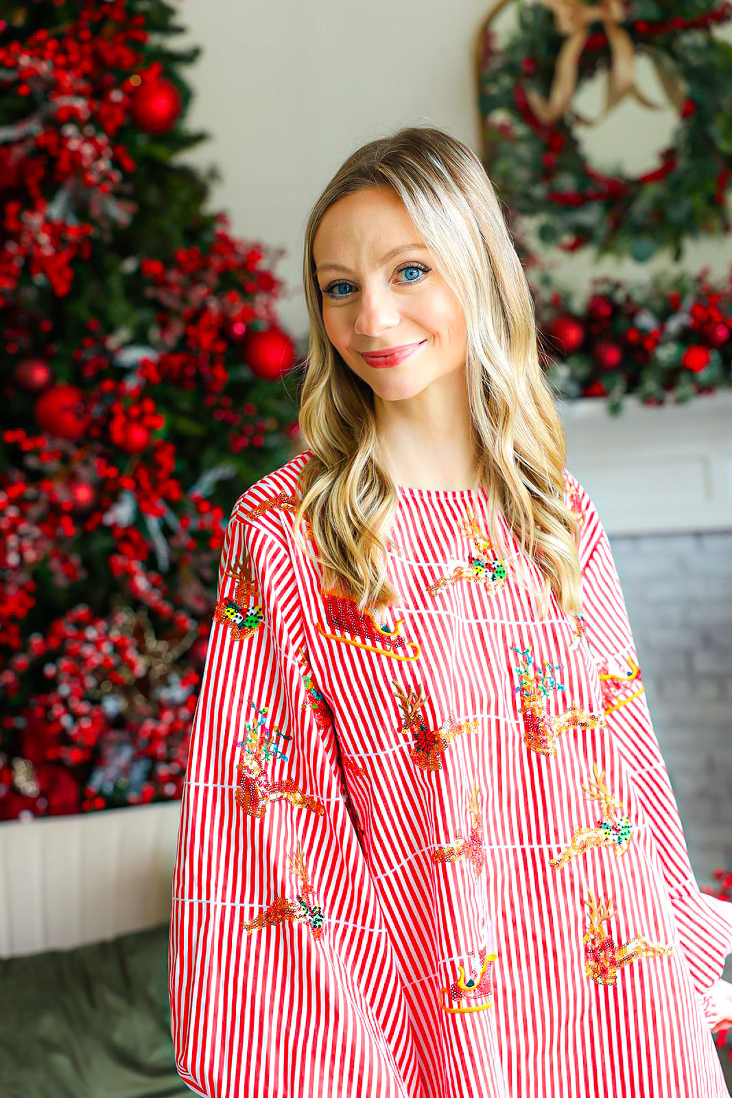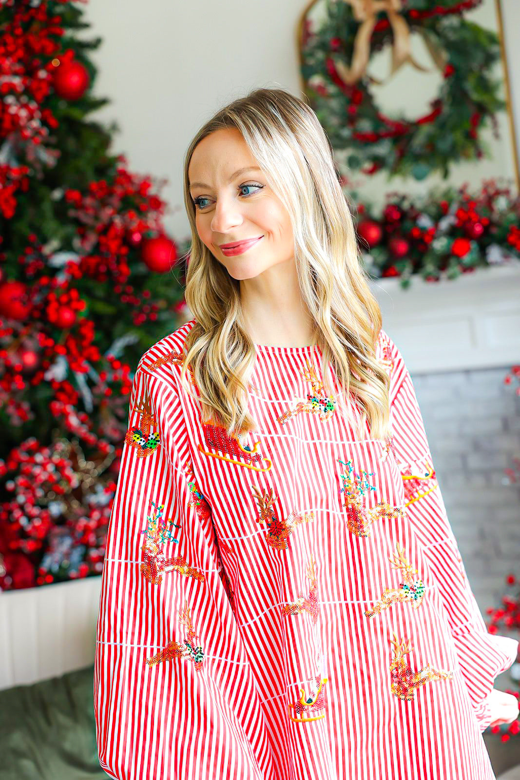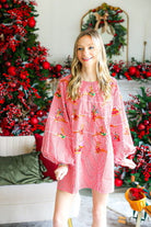 Celebrate the holiday season in style with the Red Striped Flying Santa & Reindeer Long Sleeve Dress, the perfect statement piece from Queen of Sparkles. Featuring festive red stripes and a whimsical flying Santa and reindeer pattern, this dress blends playful charm with cozy comfort. The long sleeves offer warmth for chilly winter days, making it ideal for holiday parties or festive gatherings. Embrace the spirit of joy and stand out effortlessly with a design that brings cheer wherever you go.