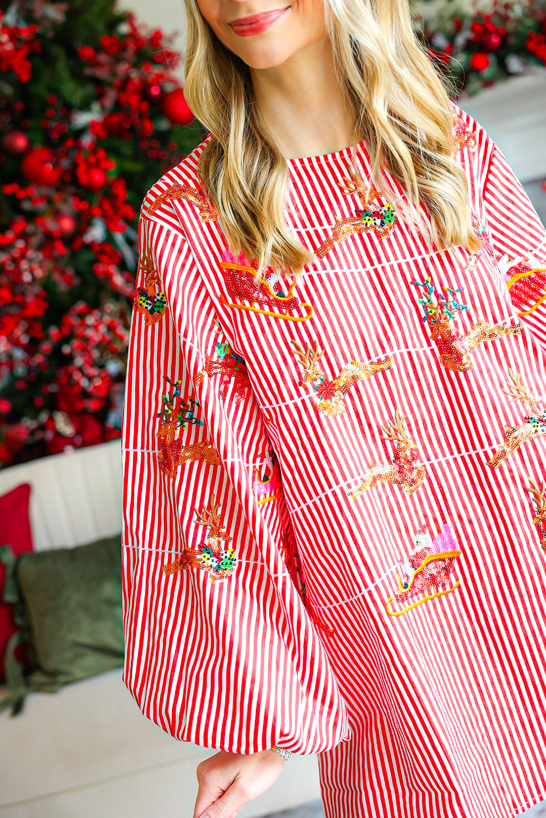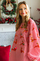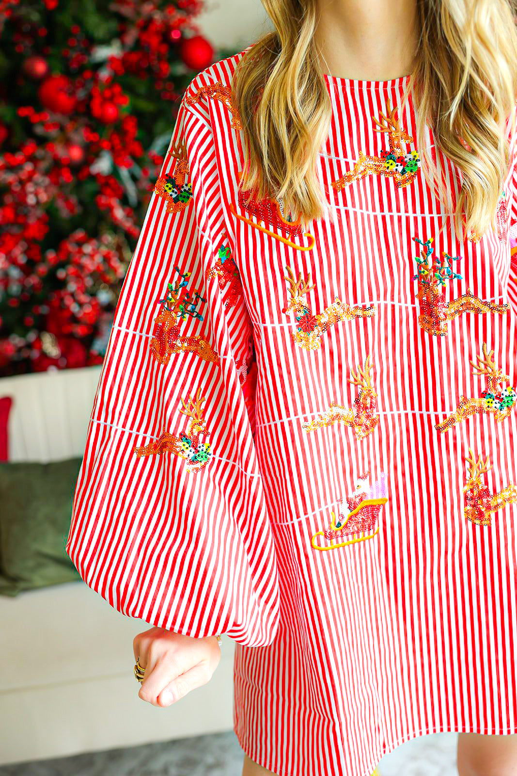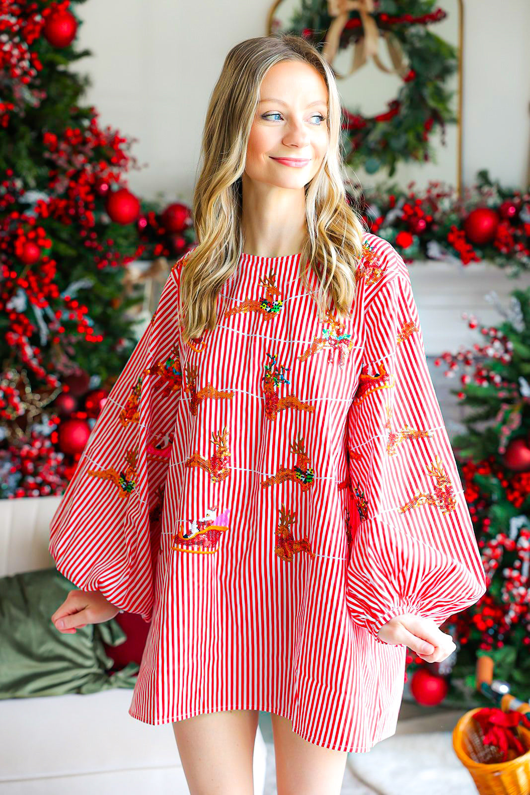 Red Striped Flying Santa & Reindeer Long Sleeve Dress Queen of Sparkles