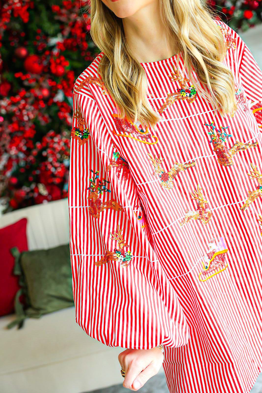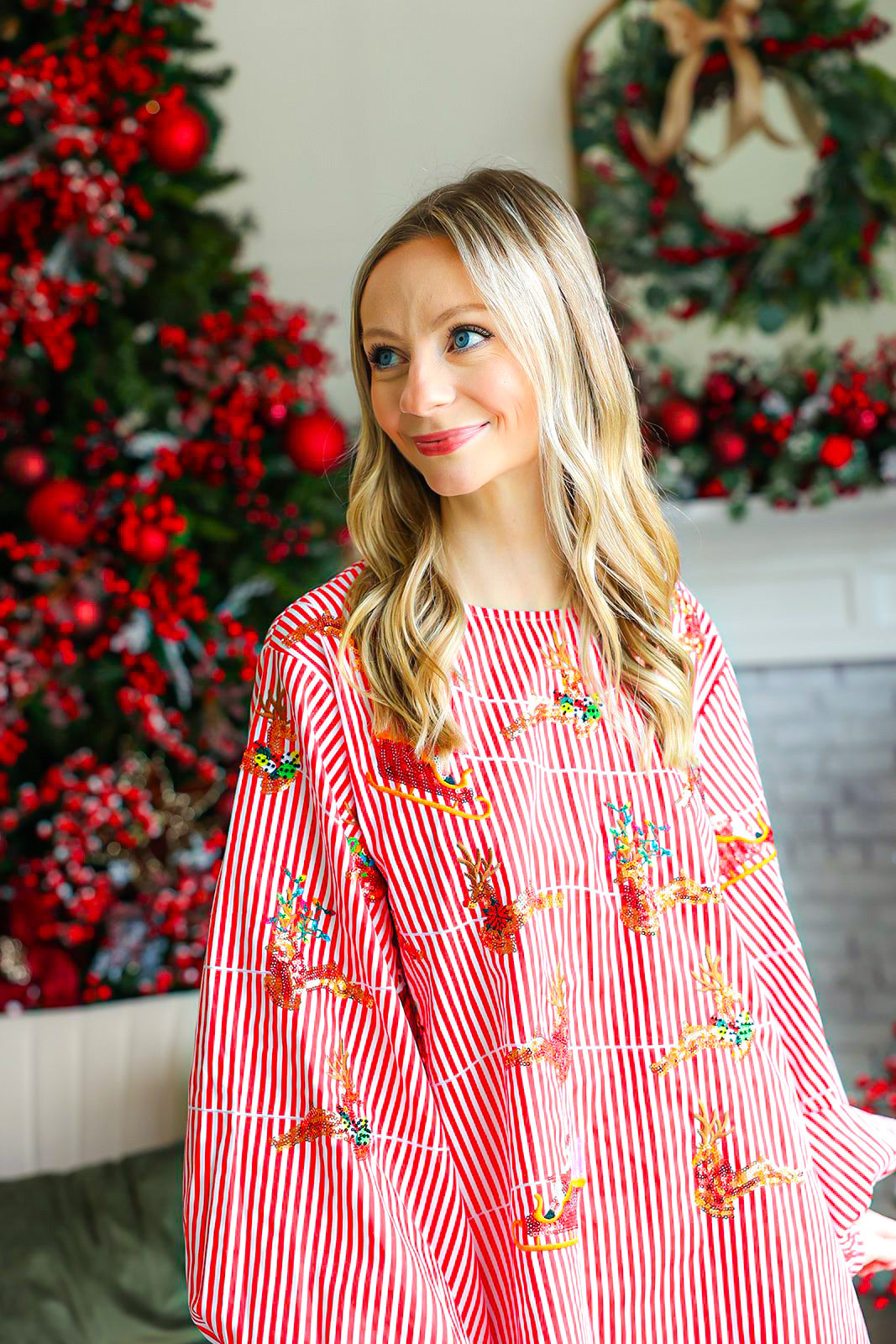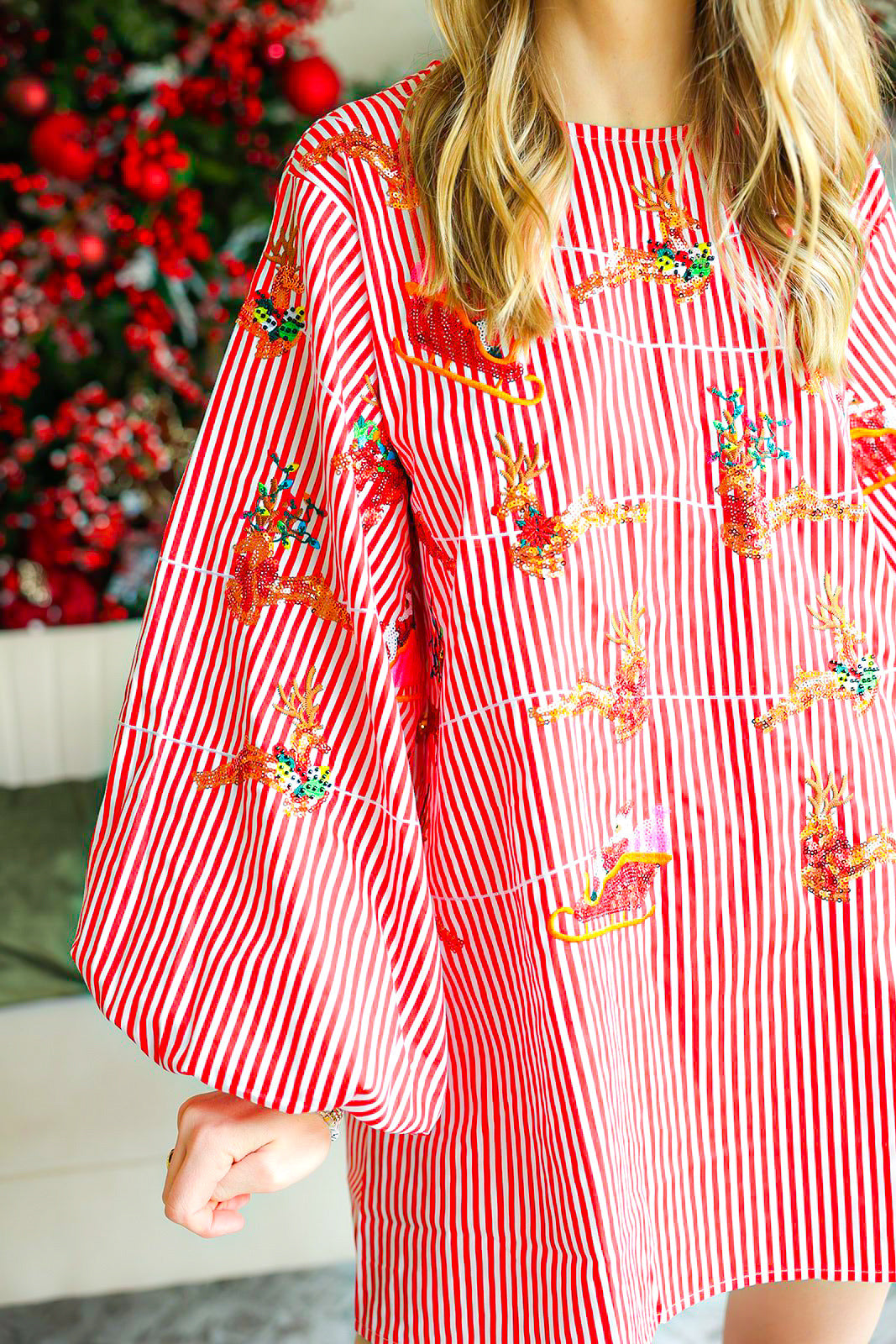Red Striped Flying Santa & Reindeer Long Sleeve Dress Queen of Sparkles