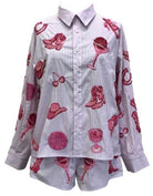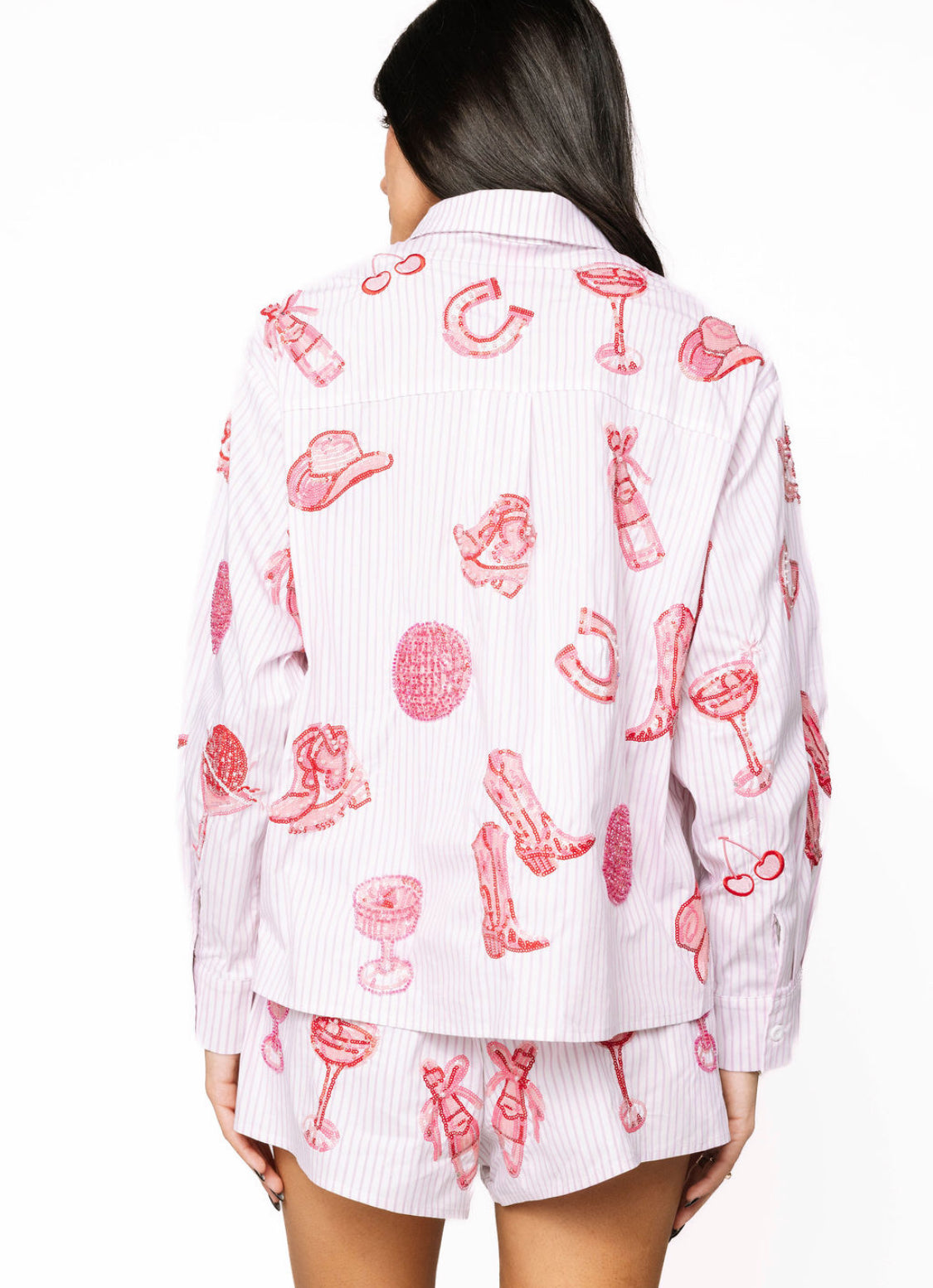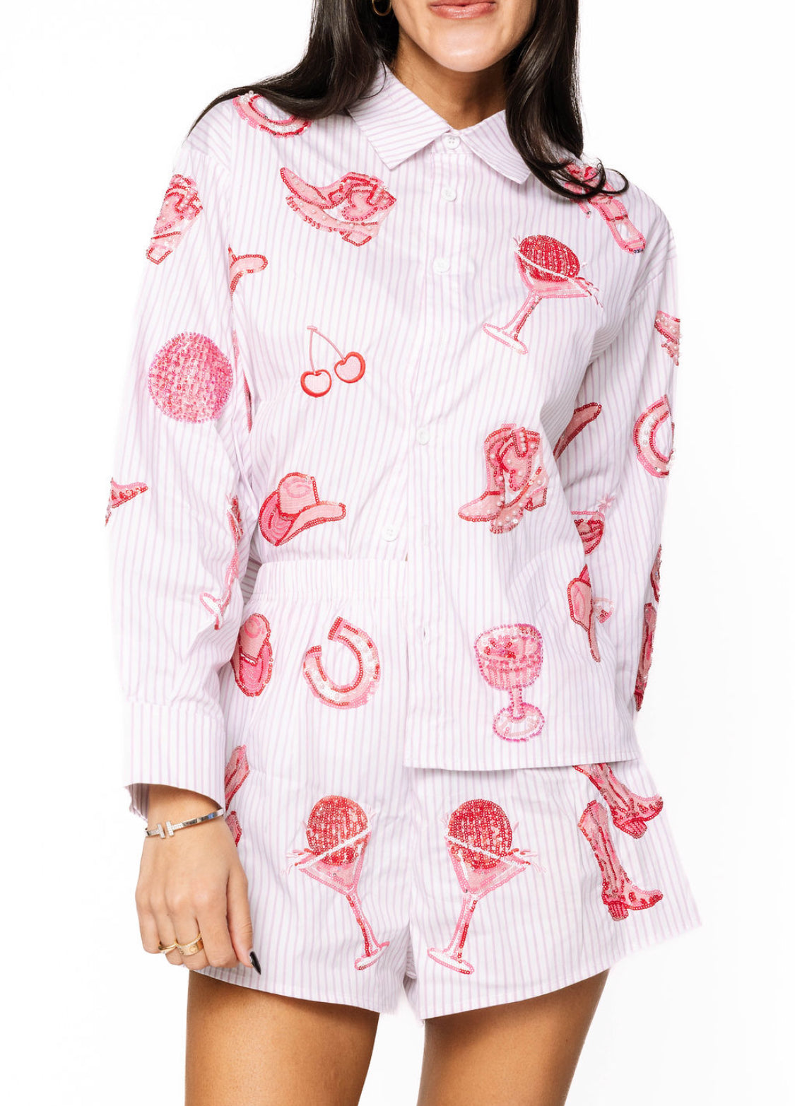 Saddle up and shine in the Queen of Sparkles Striped Pink Disco Cowgirl Button Up Collared Top 🤠💗✨ This playful striped button-up is covered in sparkly pink sequin disco balls, cowgirl hats, boots, cherries, and cocktail icons—bringing all the girly Western glam in true Queen of Sparkles fashion. The crisp collared neckline keeps it polished while the bold graphics make it fun, festive, and totally unforgettable. Pair it with the matching shorts for the full disco cowgirl set!