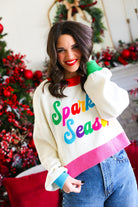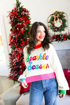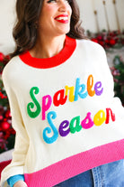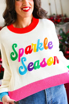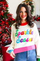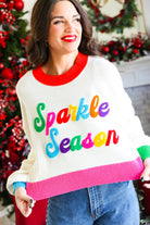 Embrace cozy elegance with the White Colorblock 'Sparkle Season' Sweater from Queen of Sparkles. This stylish sweater combines a crisp white base with chic colorblock details, perfectly capturing the festive mood. Soft and comfortable, it’s designed to keep you warm during chilly days while adding a touch of seasonal sparkle to any outfit. Whether you’re relaxing at home or celebrating with friends, this sweater is your go-to for effortless holiday style.