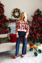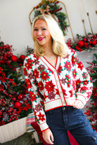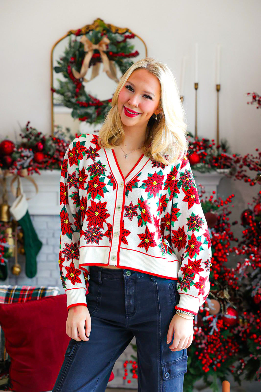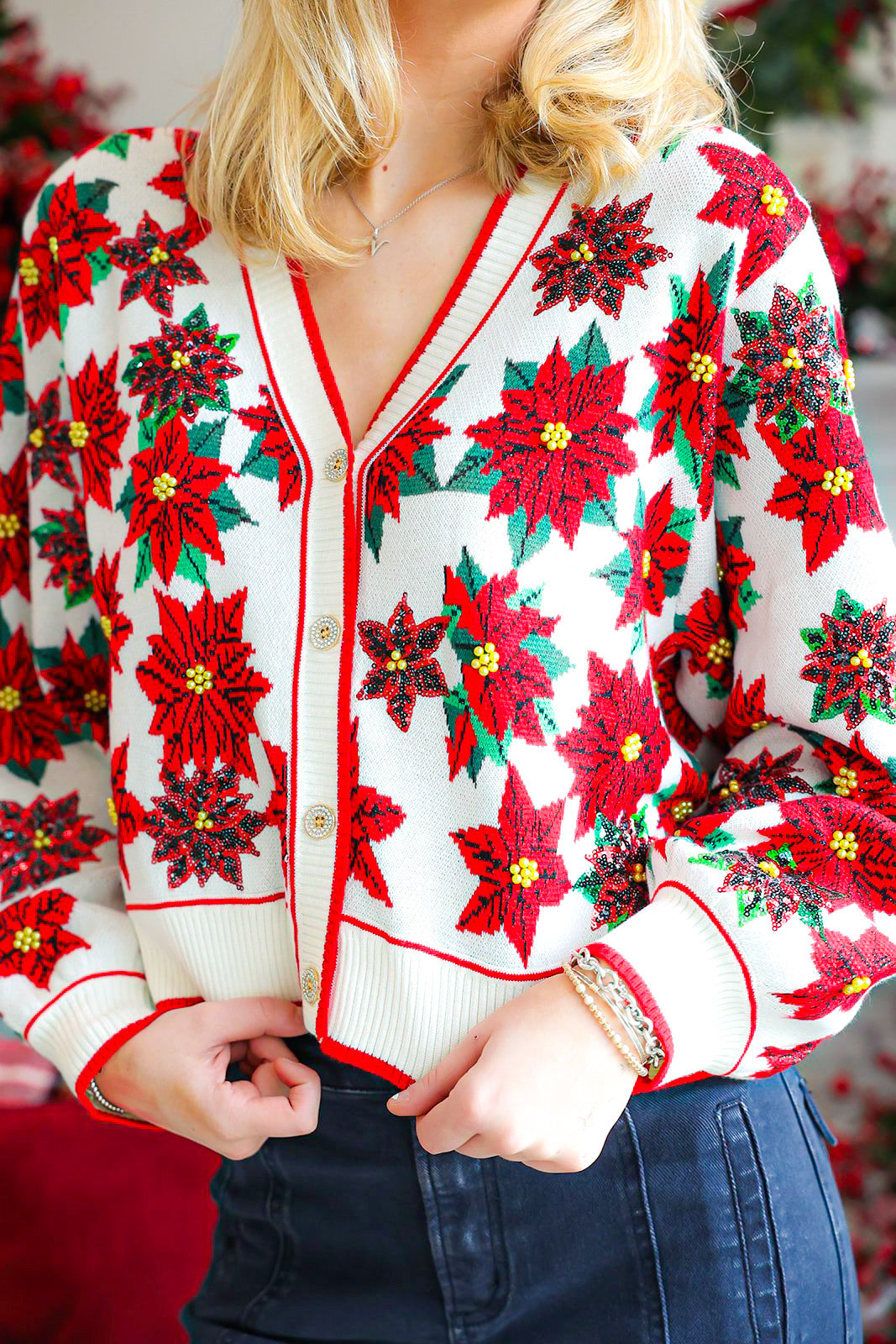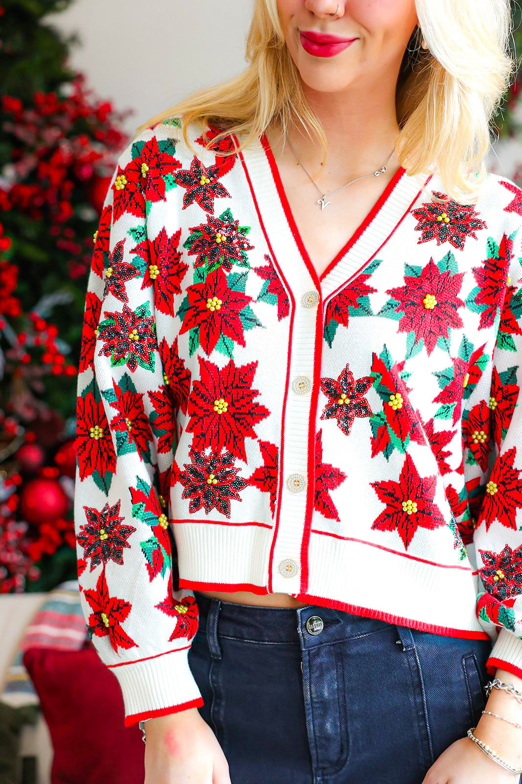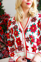 White & Red Poinsettia Button Up Cardigan Queen of Sparkles