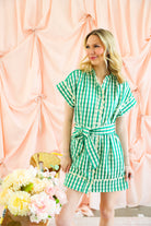 Fresh, playful, and effortlessly polished, this green gingham dress by THML is a warm-weather standout. With charming scalloped trim, a flattering tie waist, and an easy button-front design, it’s the kind of piece that feels special without trying too hard.