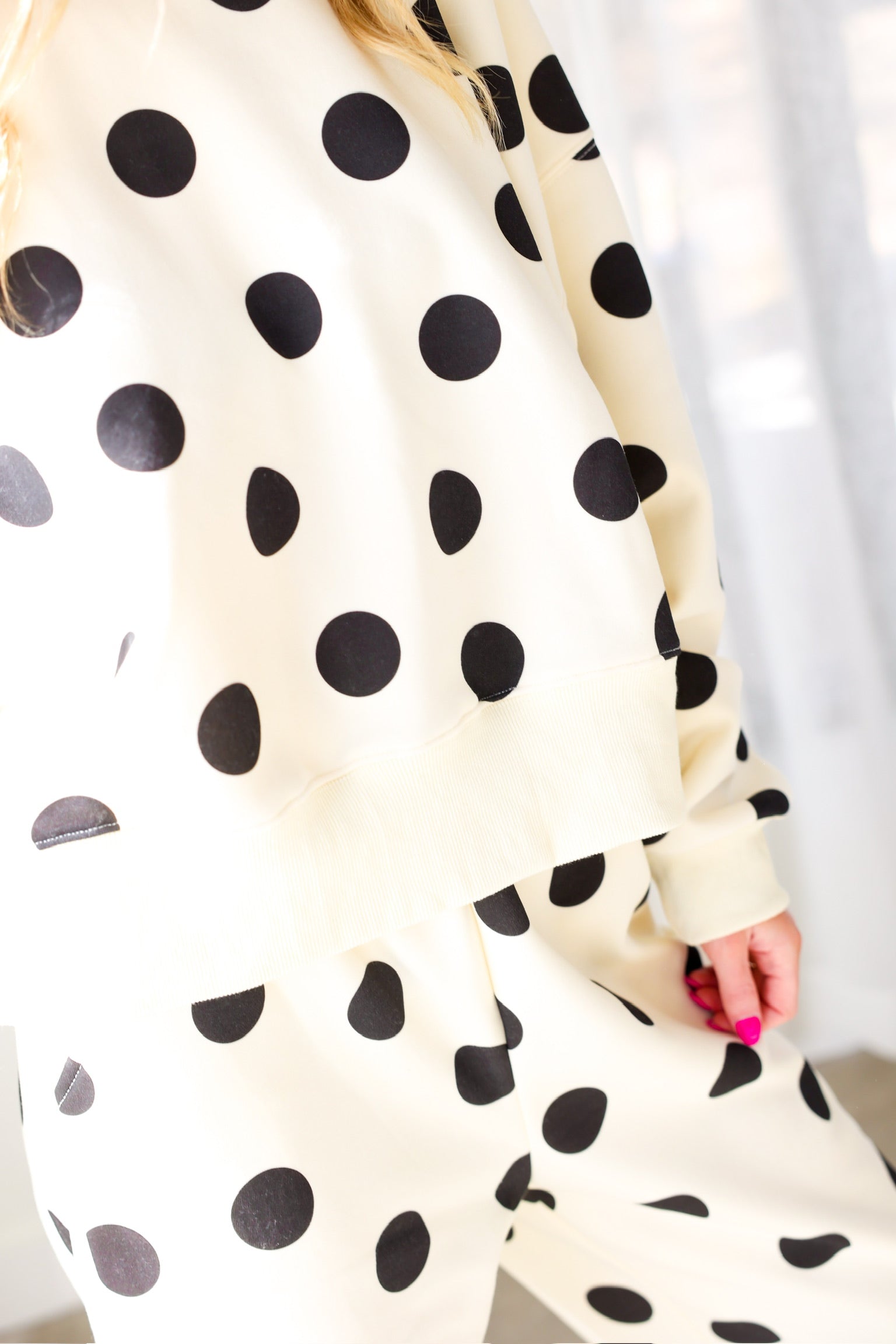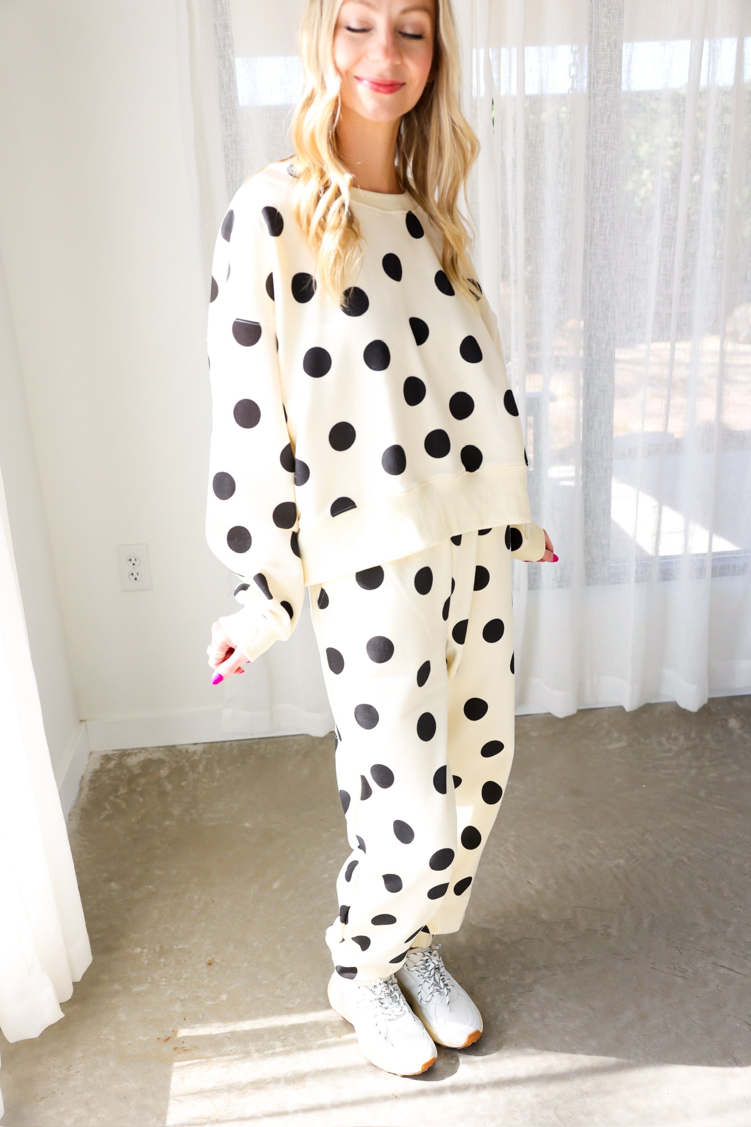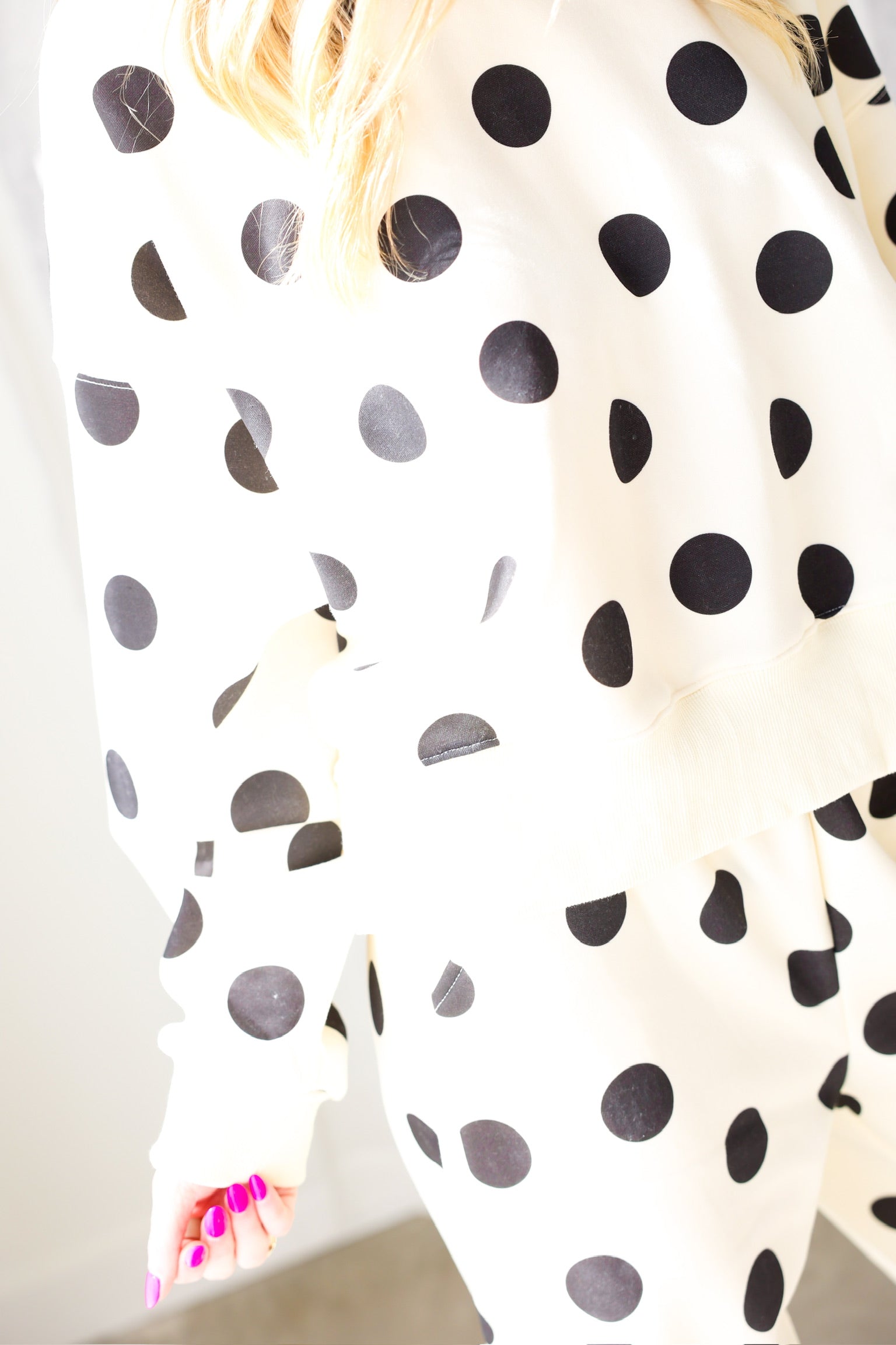 Cozy meets playful in the Polka Dot Crop Sweatshirt – Ivory. Featuring a classic black polka dot print in our standard, bold dot size, this sweatshirt delivers timeless charm with an easy, relaxed feel. The cropped silhouette and soft fabric make it perfect for casual days, lounging, or styling up with your favorite bottoms.