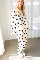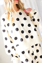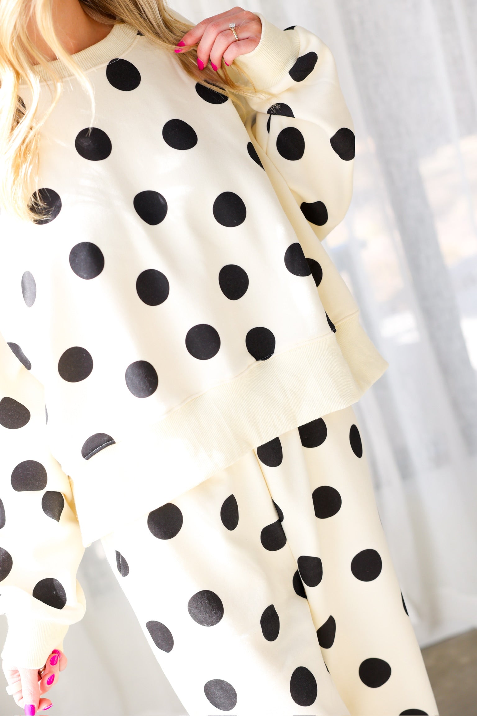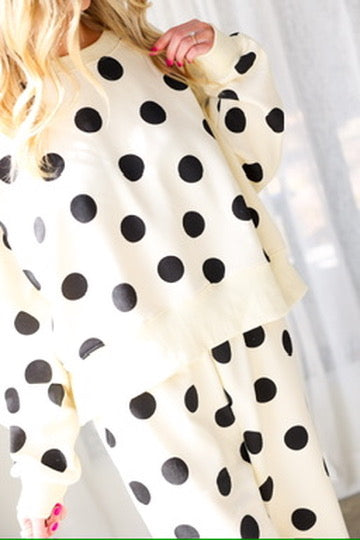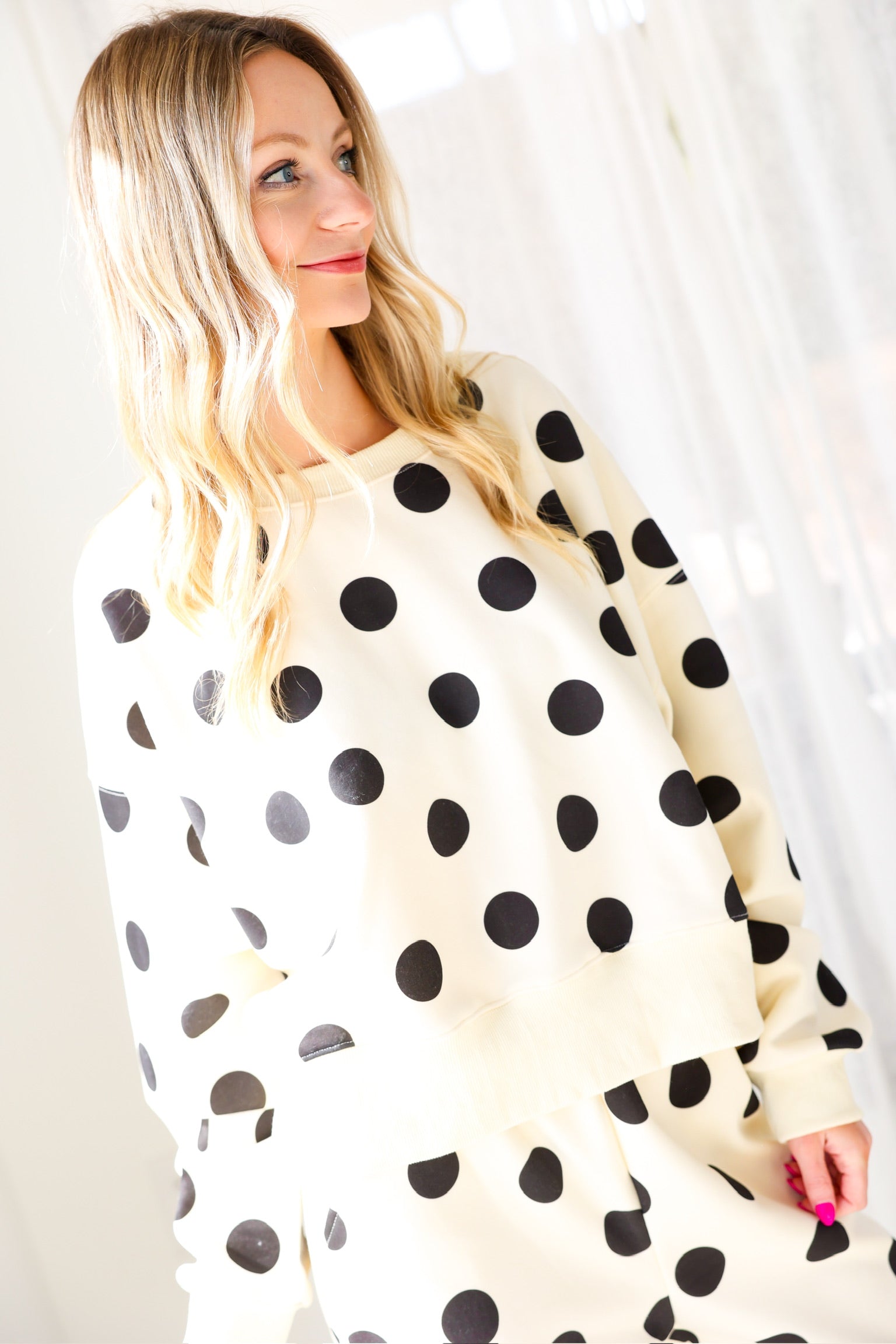 Cozy meets playful in the Polka Dot Crop Sweatshirt – Ivory. Featuring a classic black polka dot print in our standard, bold dot size, this sweatshirt delivers timeless charm with an easy, relaxed feel. The cropped silhouette and soft fabric make it perfect for casual days, lounging, or styling up with your favorite bottoms.