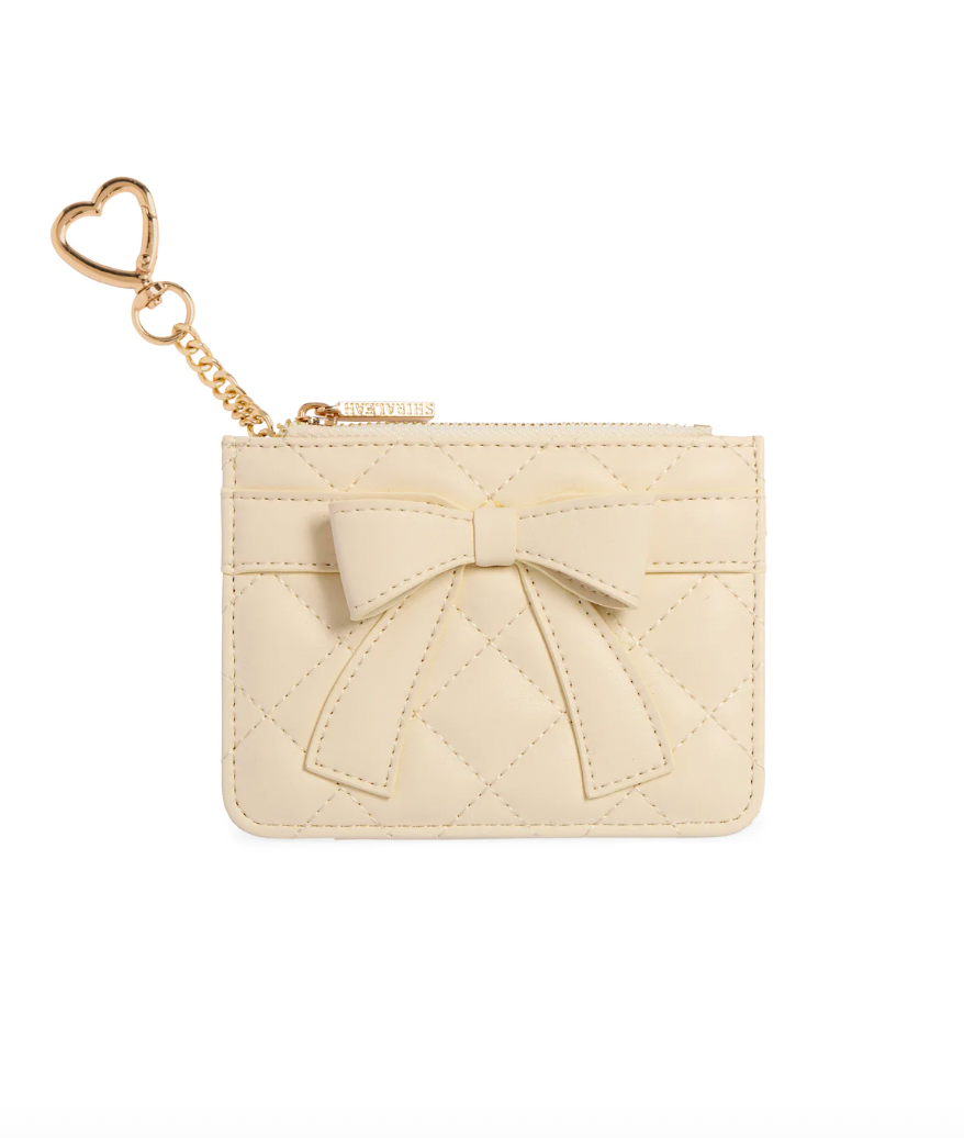 The Quilted Bow Card Case is where elegance meets everyday function. With a diamond-quilted design, a sweet oversized bow, and a luxe faux leather finish, this case adds charm to your daily essentials. It features multiple card slots and a zippered pouch for cash, coins, or tiny treasures. Topped off with a gold heart-shaped key ring, it clips easily to your bag or keys for on-the-go cuteness.
