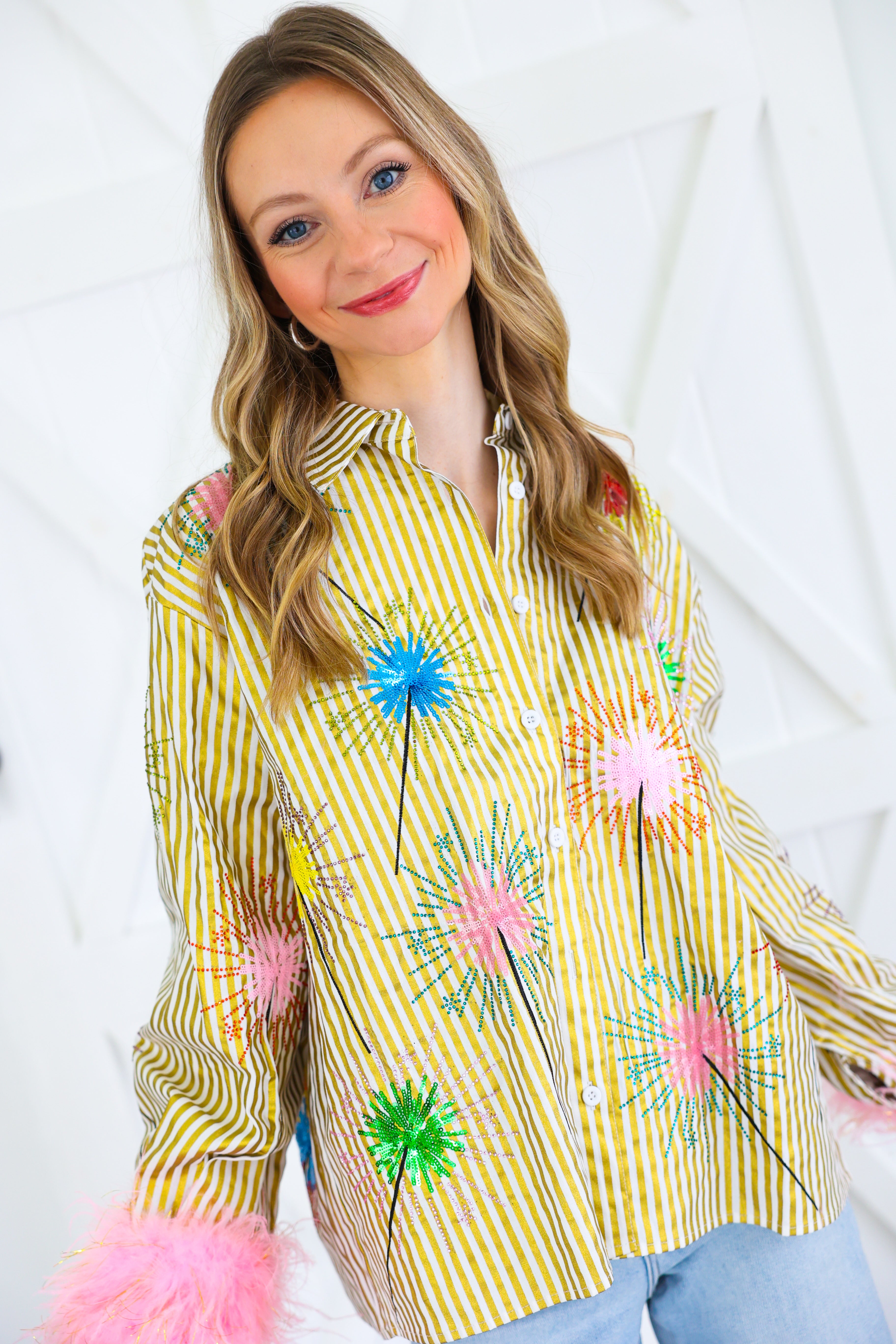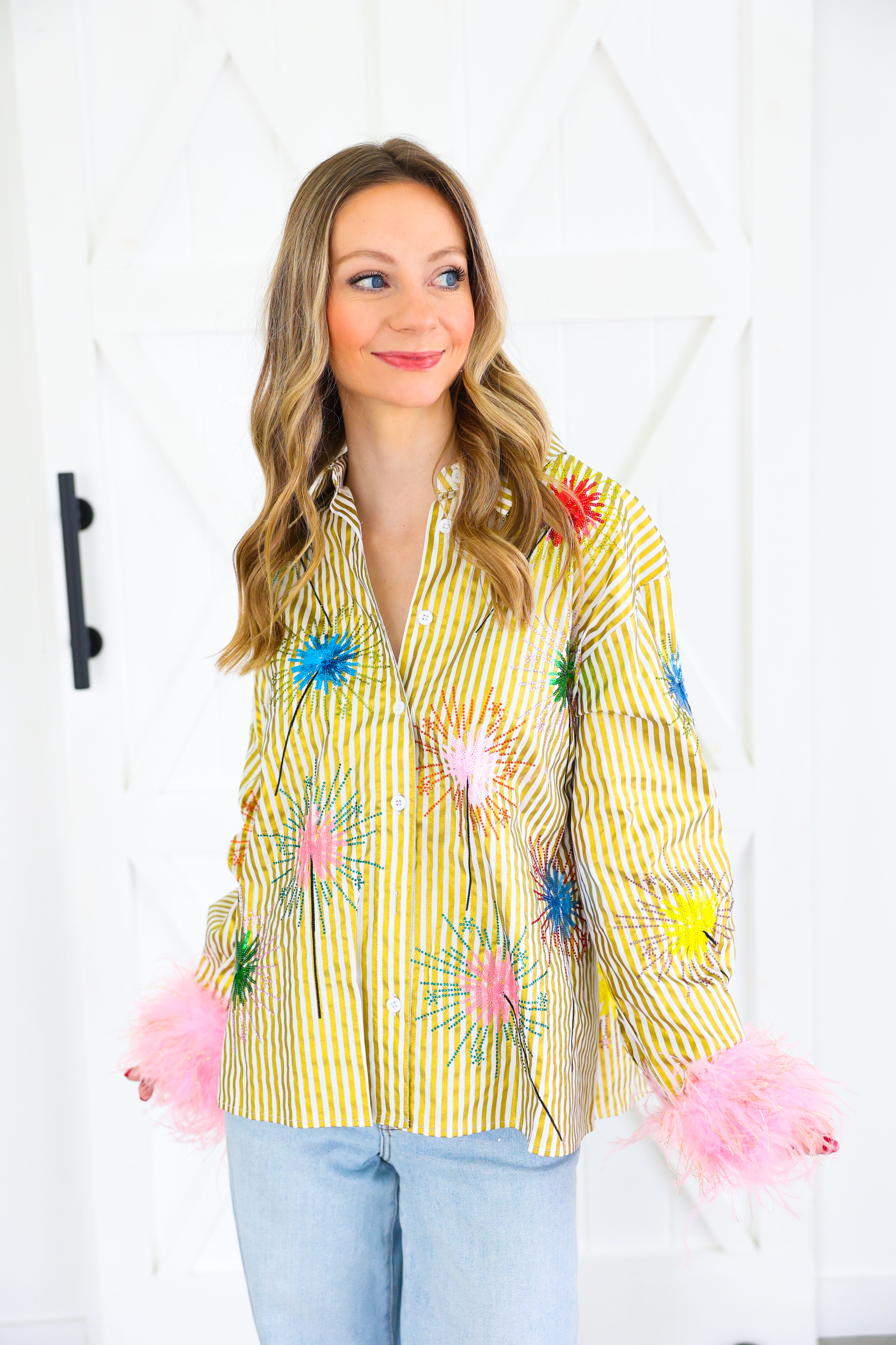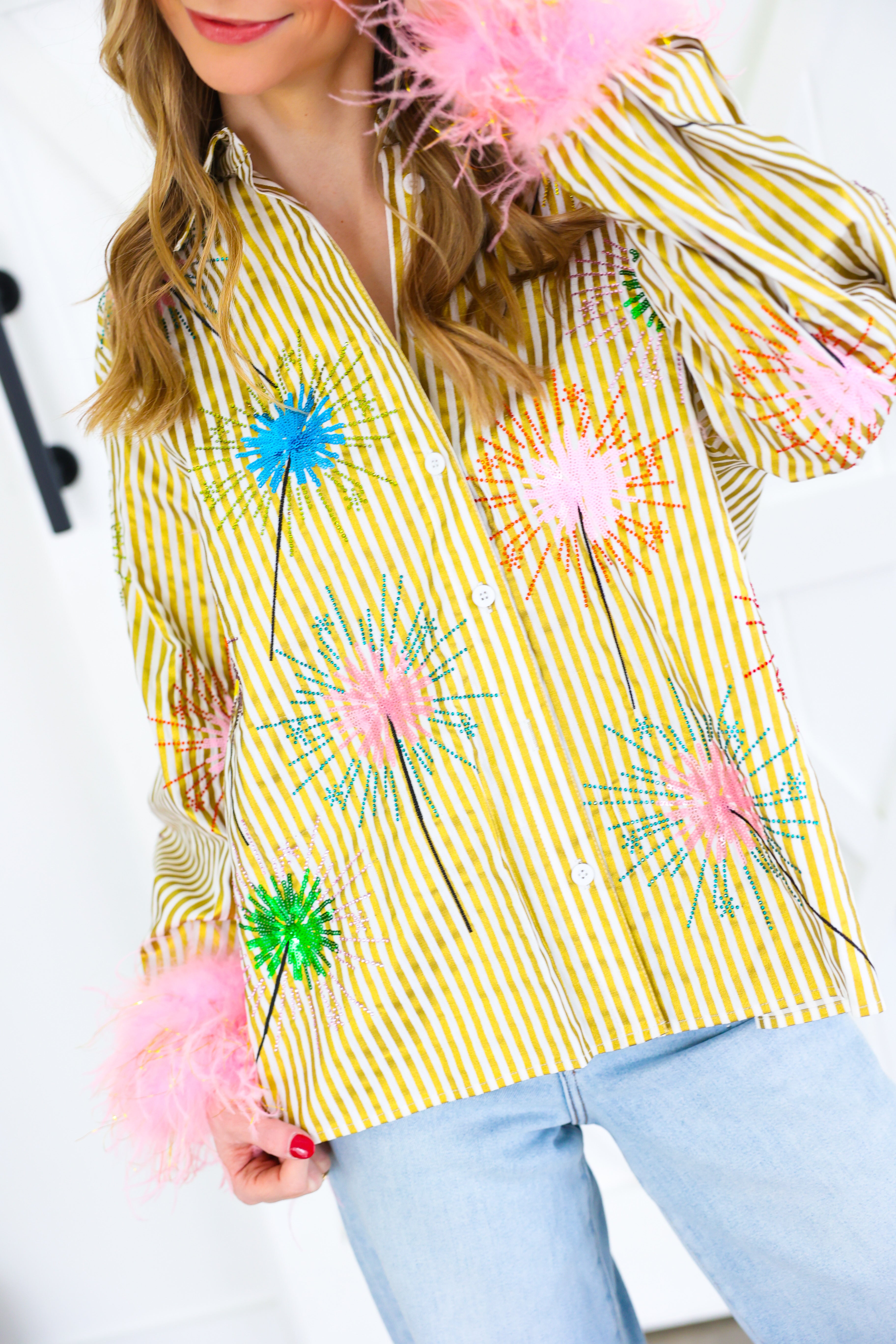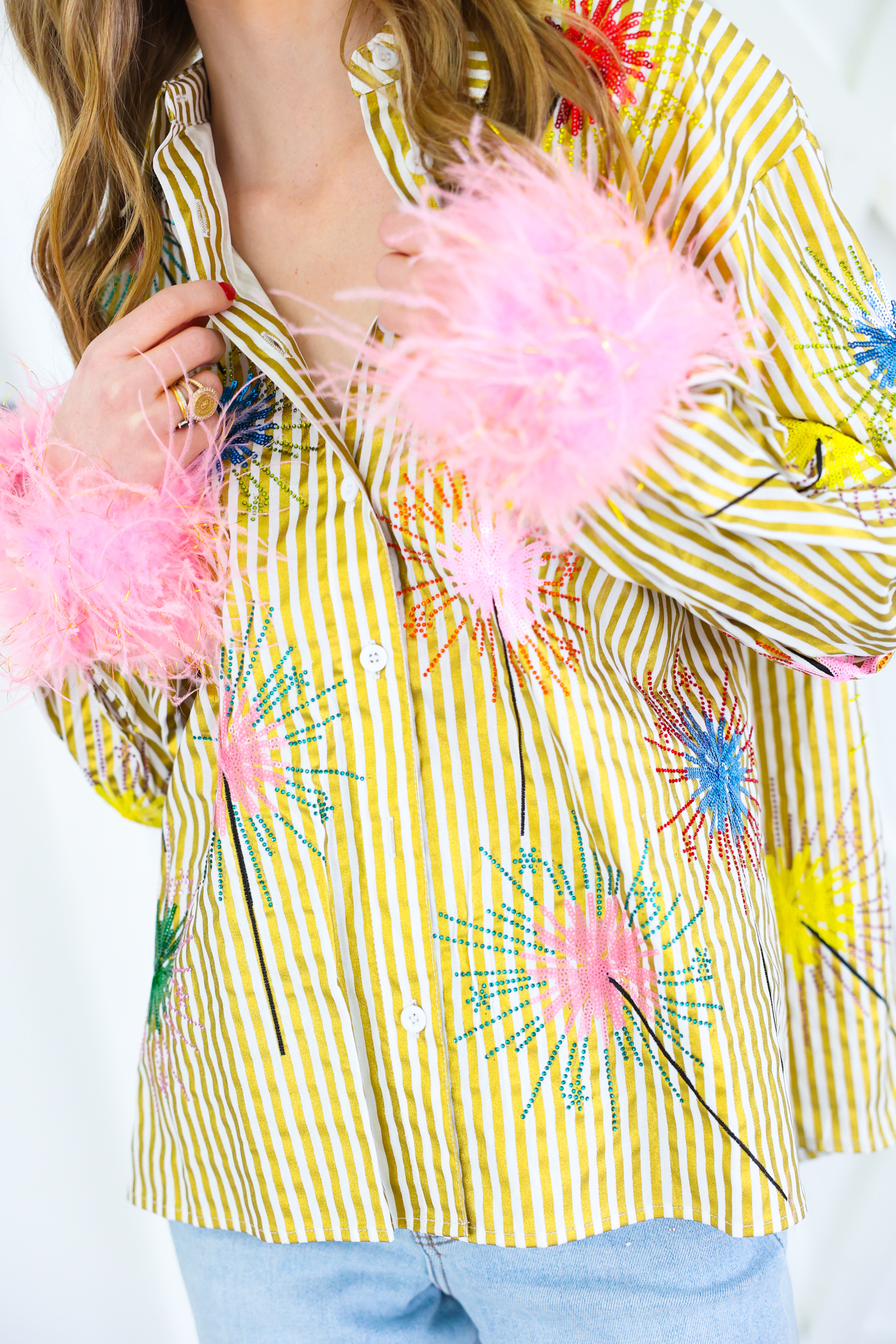 Gold Stripe Multi Sparkler Button Up Top With Pink Feather Sleeve Queen of Sparkles