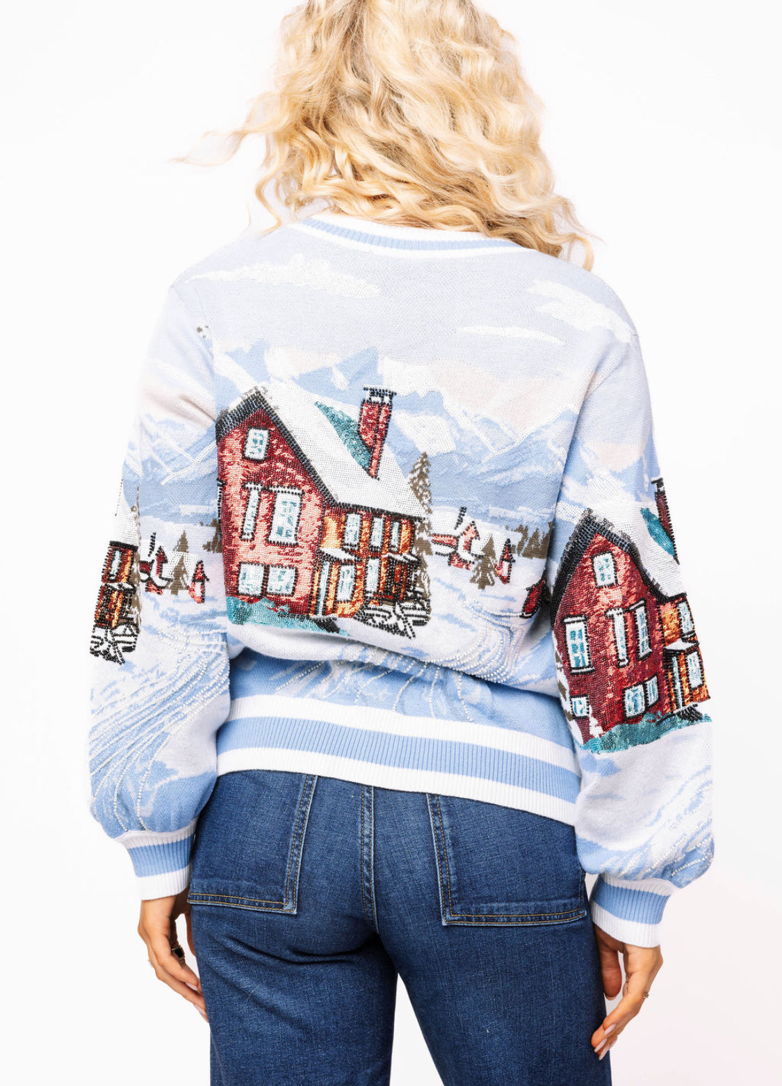 Blue & White Snowy Town Scene Button Up Cardigan Queen of Sparkles