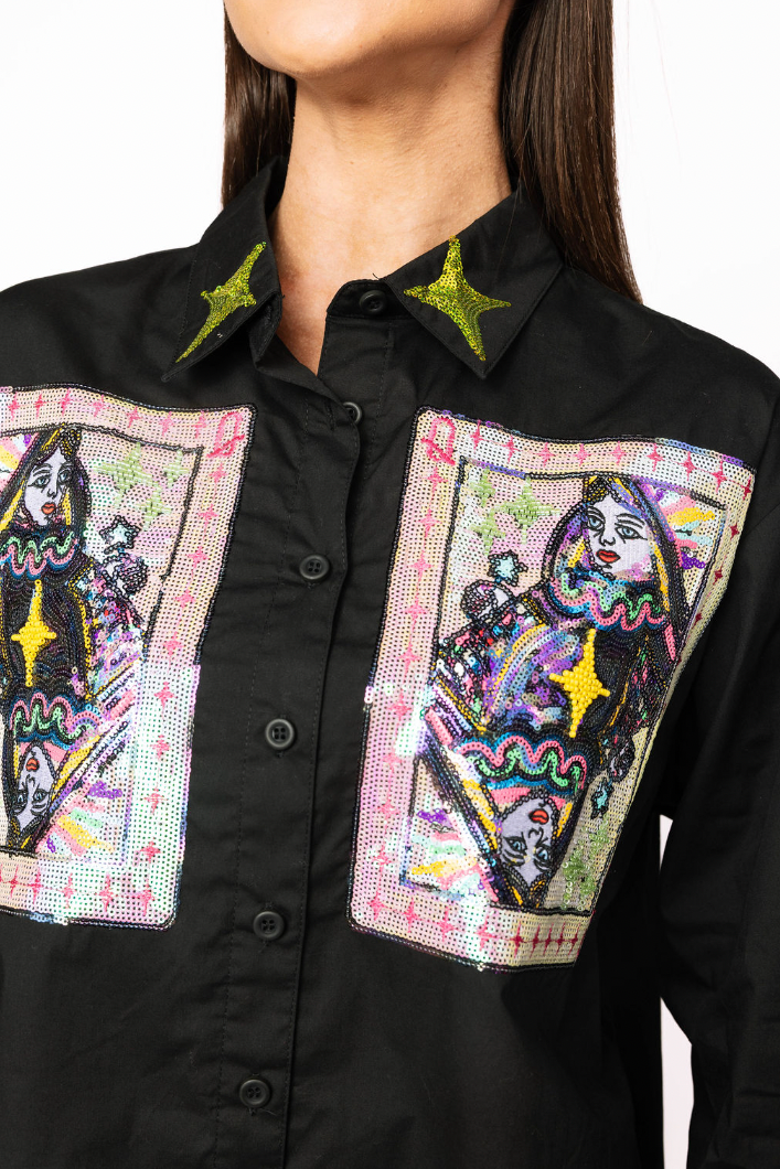 Black Queen Card & Sparkle Collar Button Up Cotton Top Queen of Sparkles
