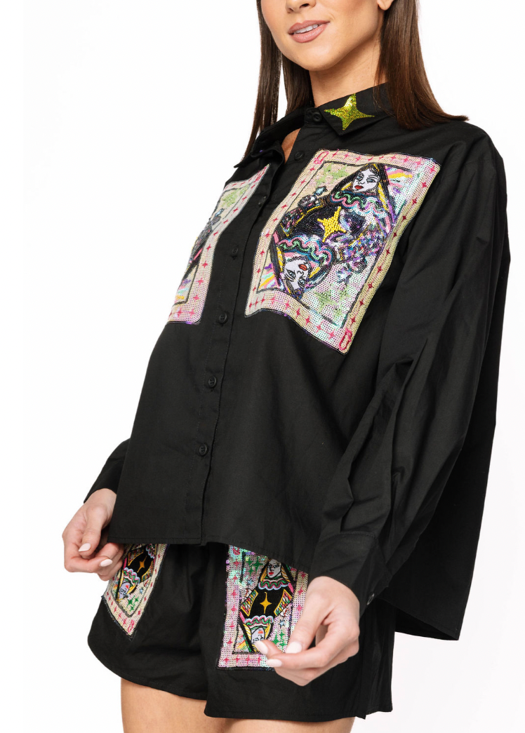 Black Queen Card & Sparkle Collar Button Up Cotton Shorts Queen of Sparkles