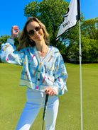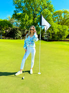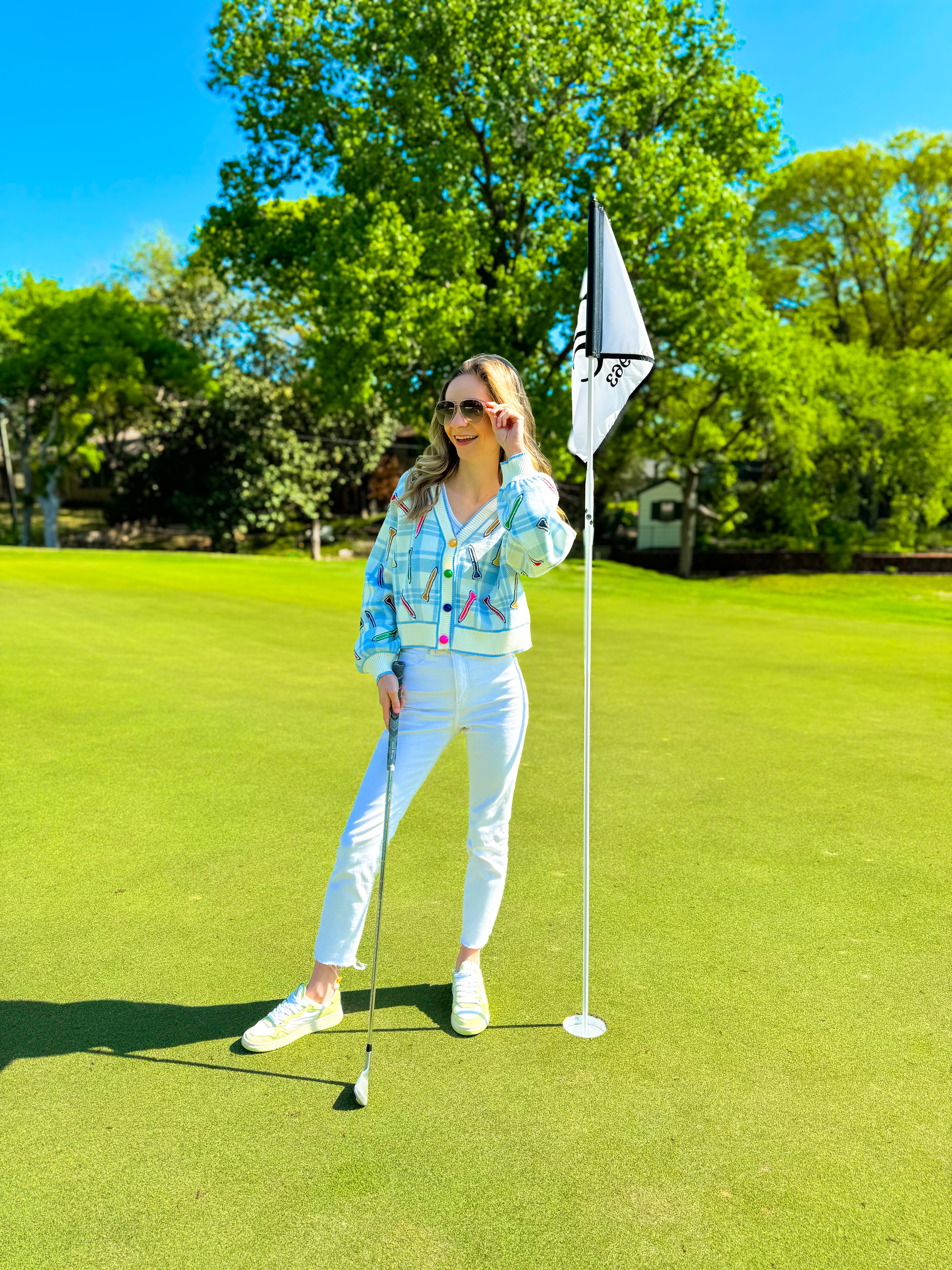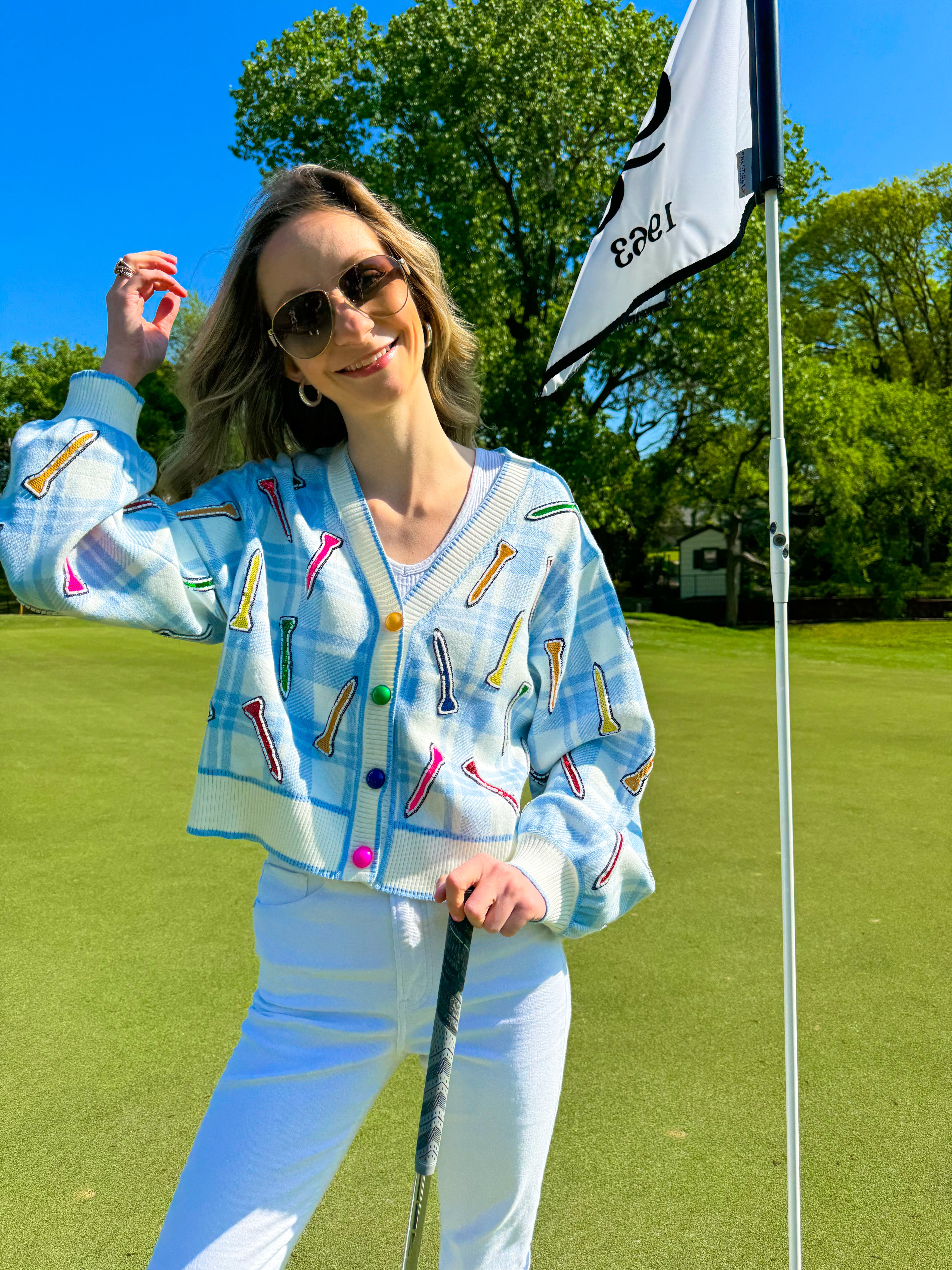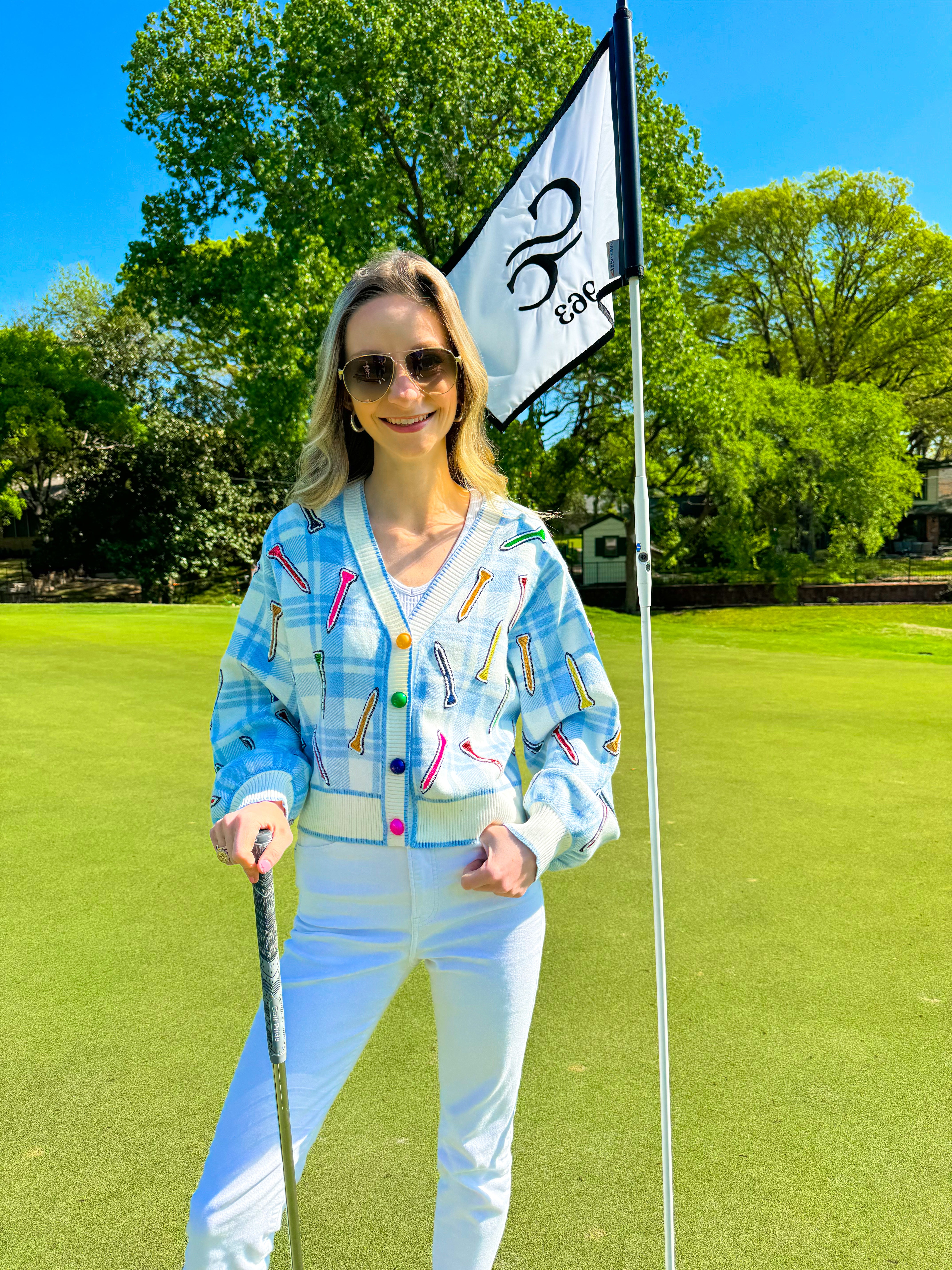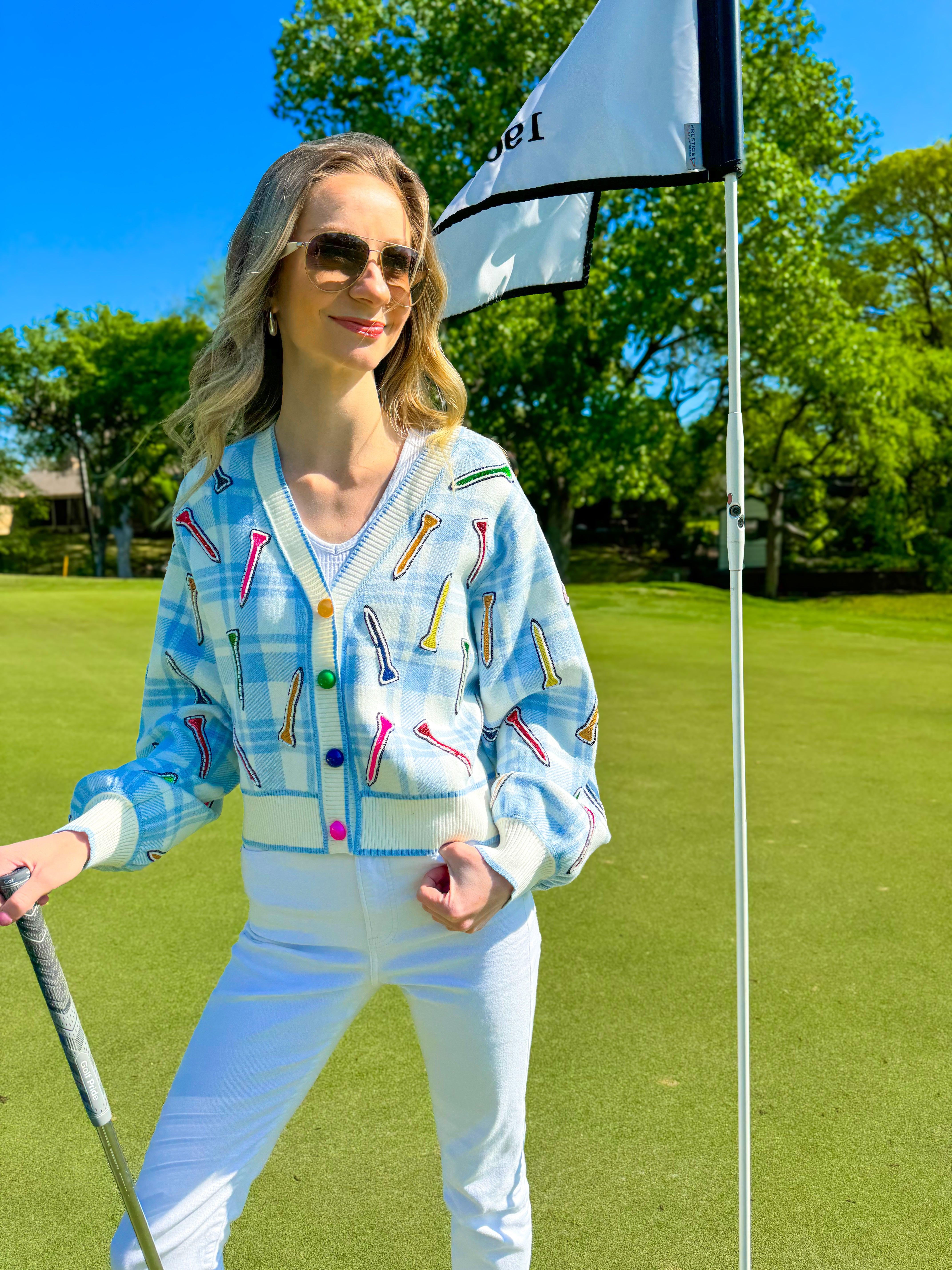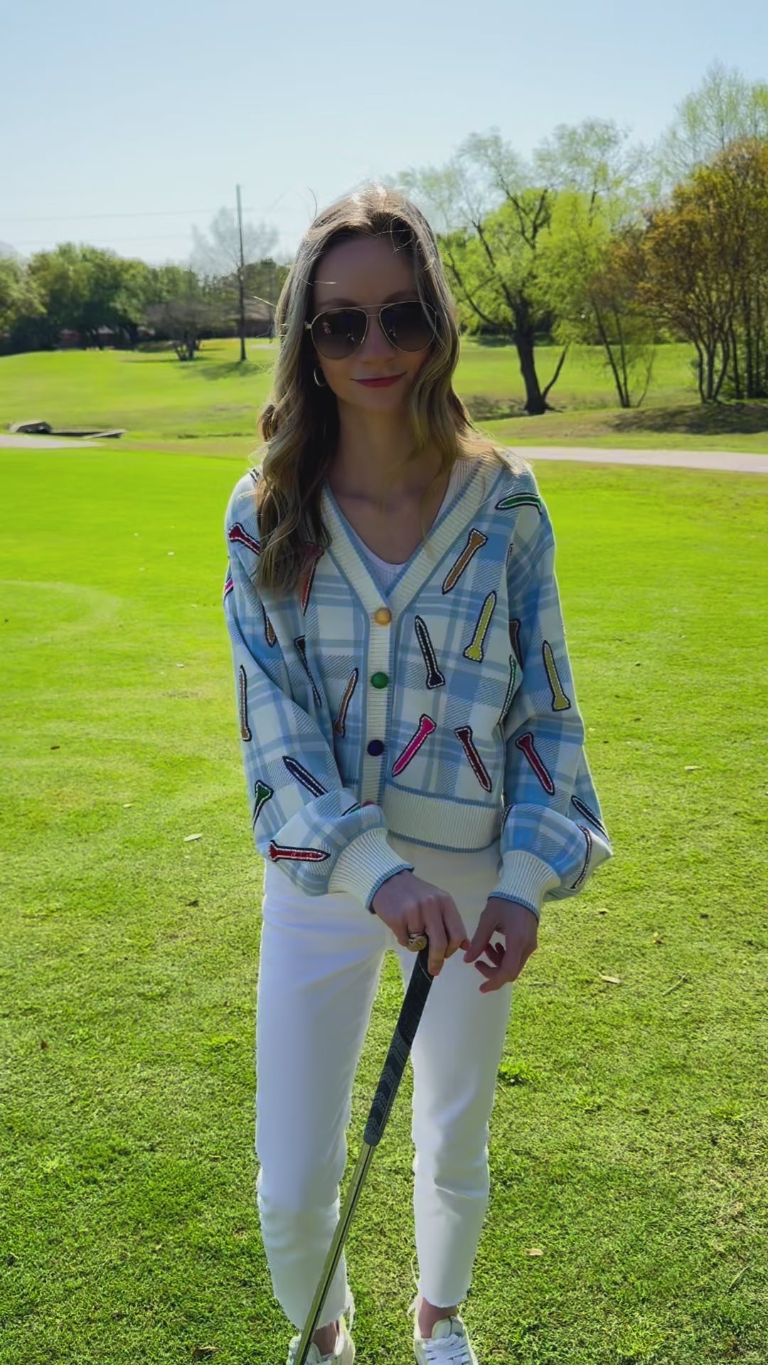 Embrace your inner sparkle with our Blue & White Plaid Golf Tee Button Up Cardigan! Perfect for the golf course and tournaments, this cardigan exudes style and charm. Show off your love for the game while looking chic and comfortable. Get ready to turn heads and be the Queen of Sparkles on the green!