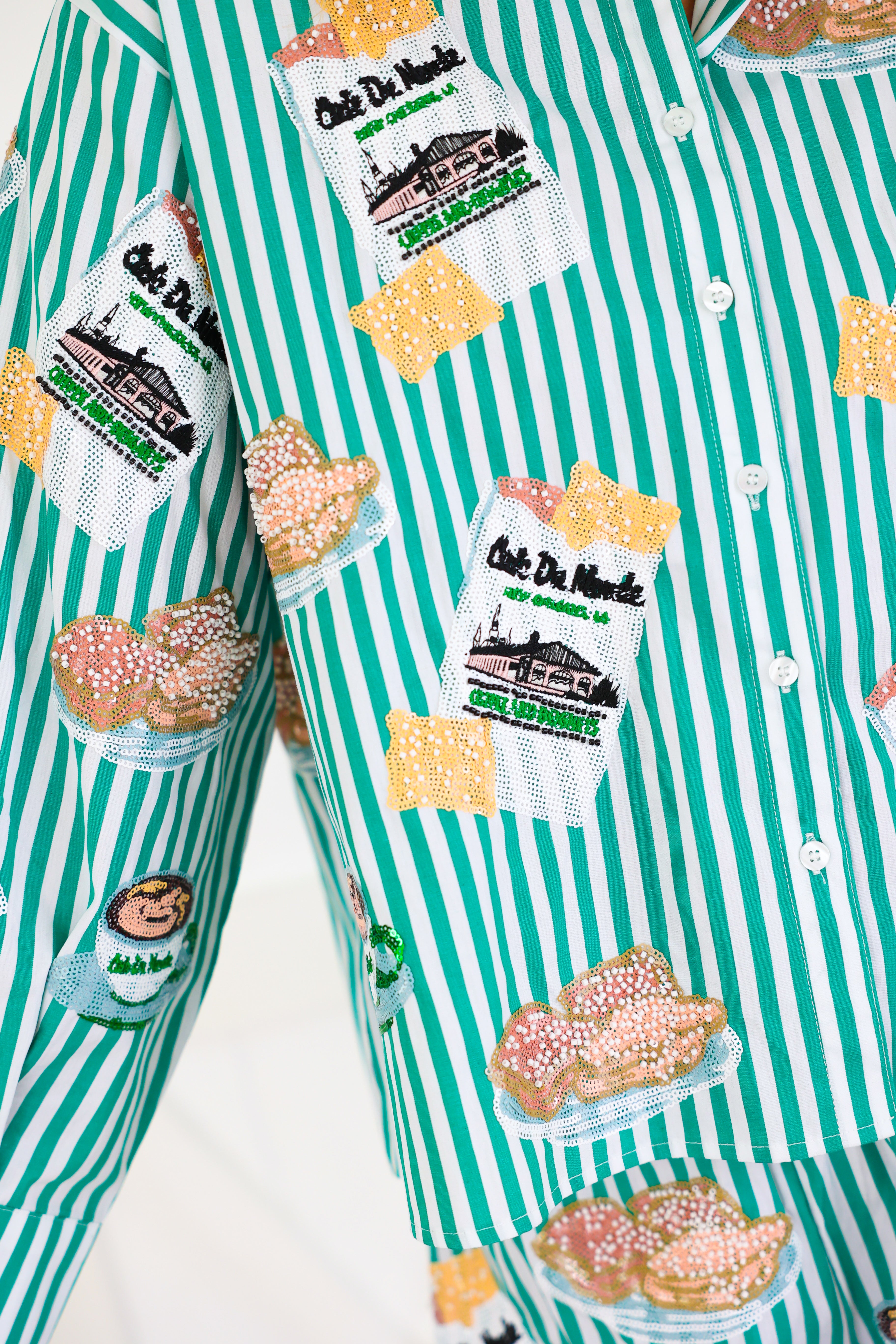 Green & White Stripe Café Du Monde Icon Button Up Top Queen of Sparkles