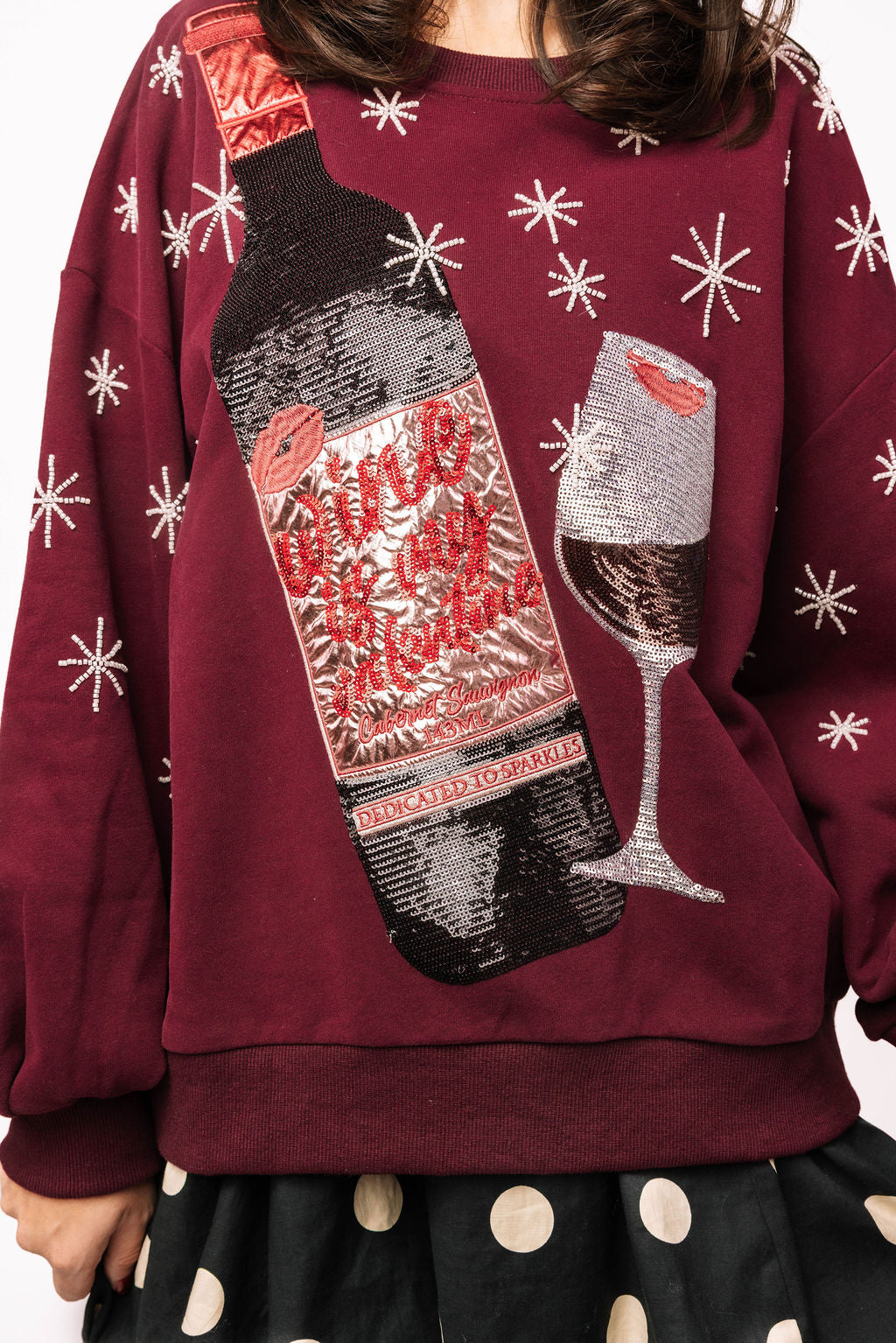 Maroon sweatshirt with sequin wine bottle and wine glass graphic 🍷