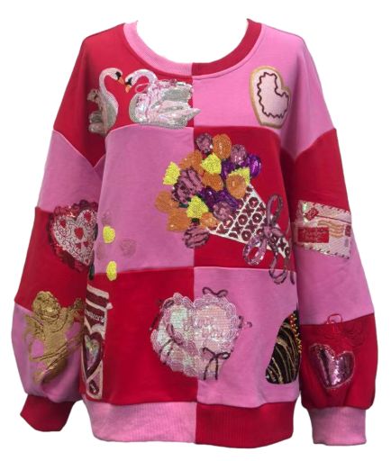 Celebrate love in full sparkle with this Queen of Sparkles Red & Pink Checkered Valentine’s Icon Sweatshirt. Designed with a bold patchwork-inspired layout, this statement sweatshirt features an assortment of sequin Valentine’s motifs—including hearts, swans, bows, candy, and romantic icons—each one adding texture, charm, and shimmer.