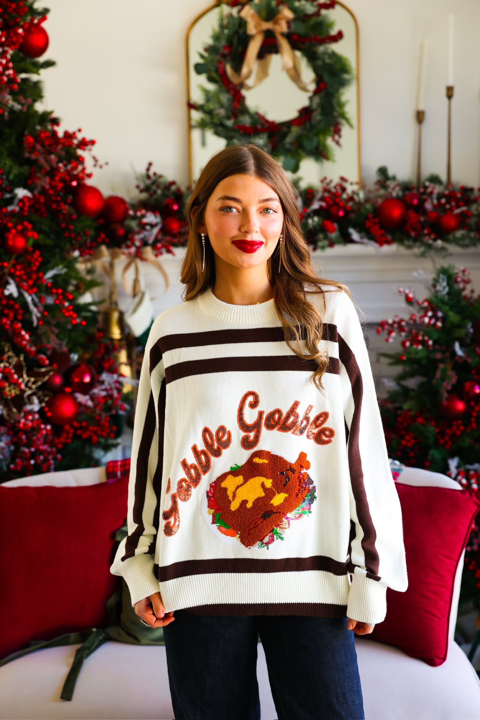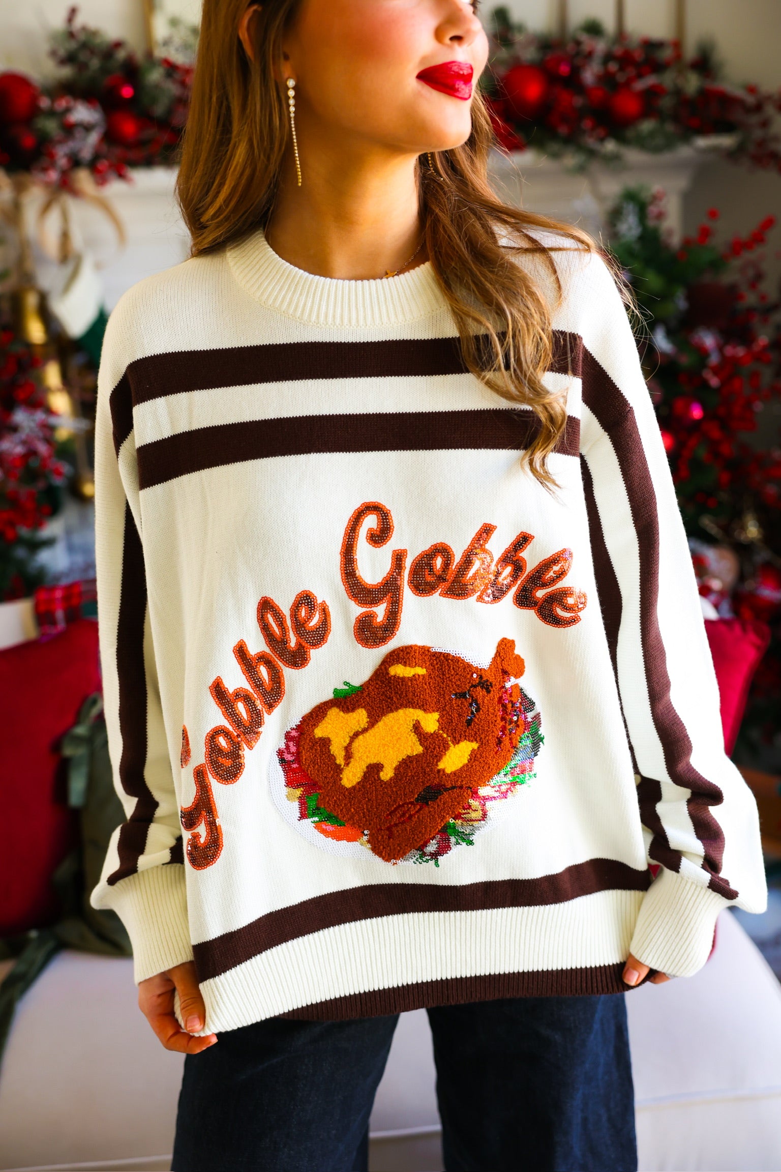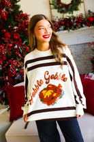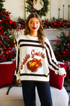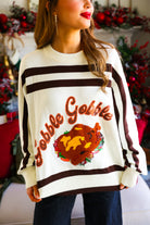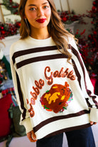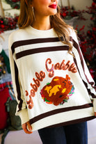 Embrace cozy charm this season with the White & Brown 'Gobble' Sweater. Its warm tones and playful design make it perfect for festive gatherings or casual outings. Crafted for comfort and style, this sweater adds a touch of autumn spirit to your wardrobe while keeping you snug and stylish all day long.